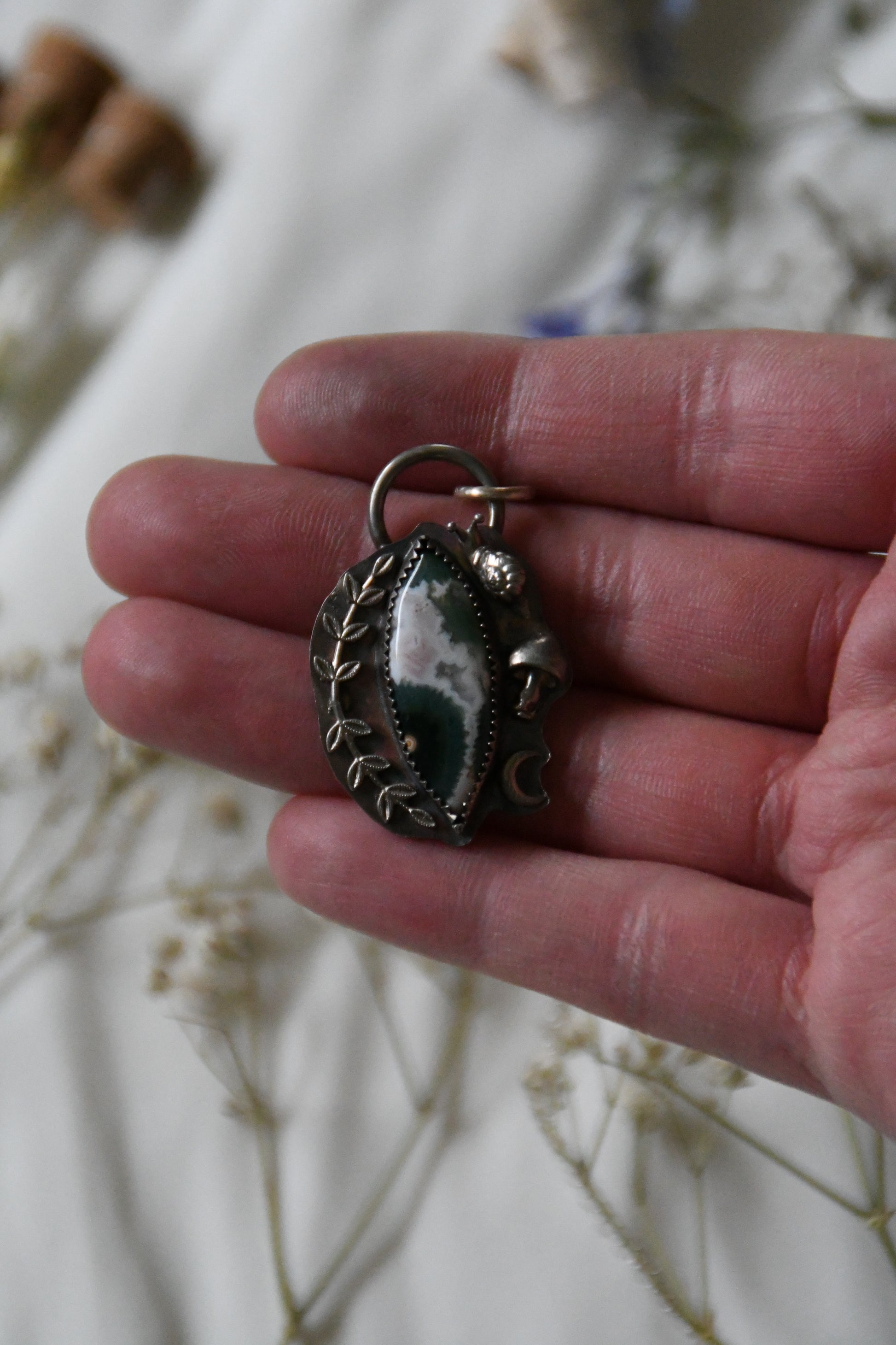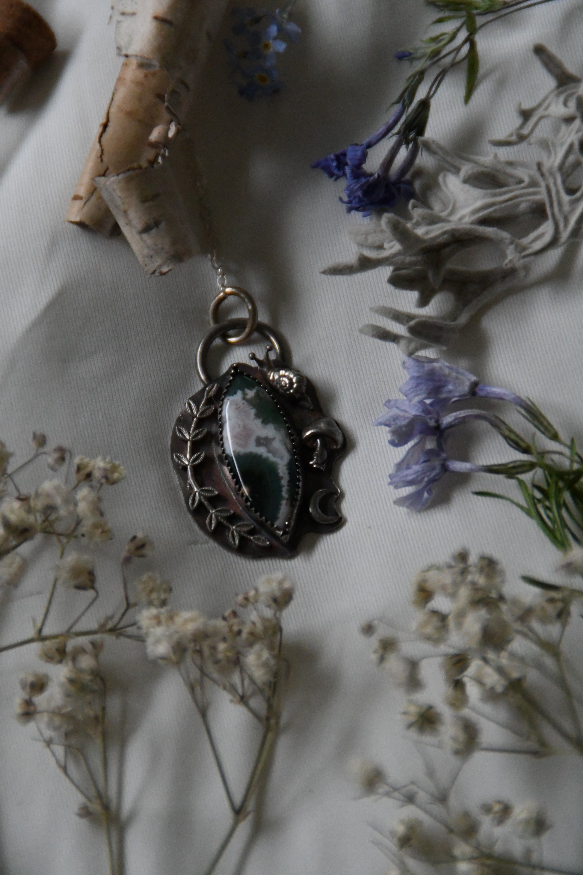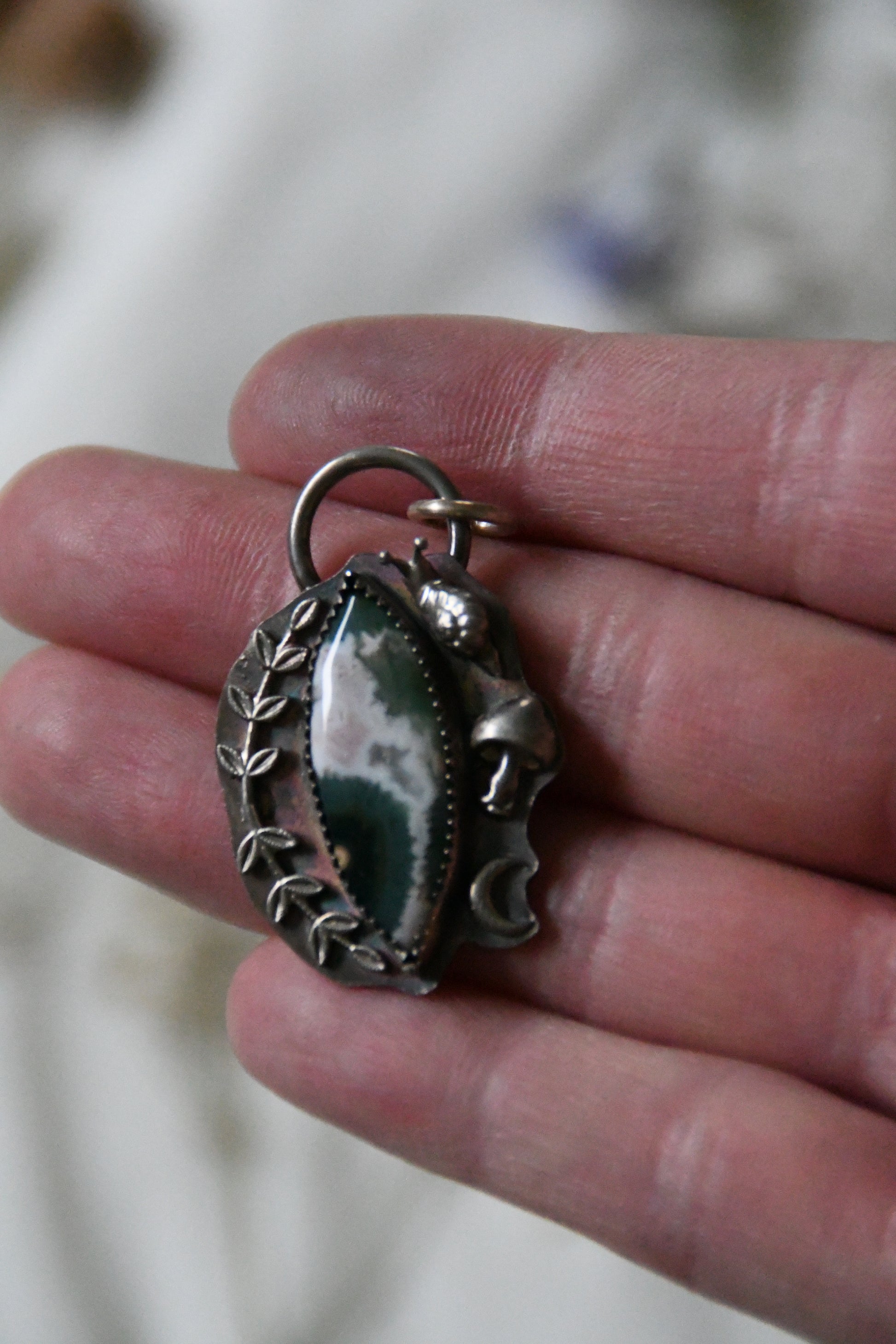 A beautiful 8th vein ocean jasper cabochon set in sterling silver with various castings such as a snail, moon, mushroom, and leaf accents. This whimsical pendant was given a rainbow esque patina to make it look antiqued like it was found on the forest floor! It comes on a simple 20" silver chain with a simple clasp. If you have any questions or concerns about this piece please contact me before purchasing thank you!