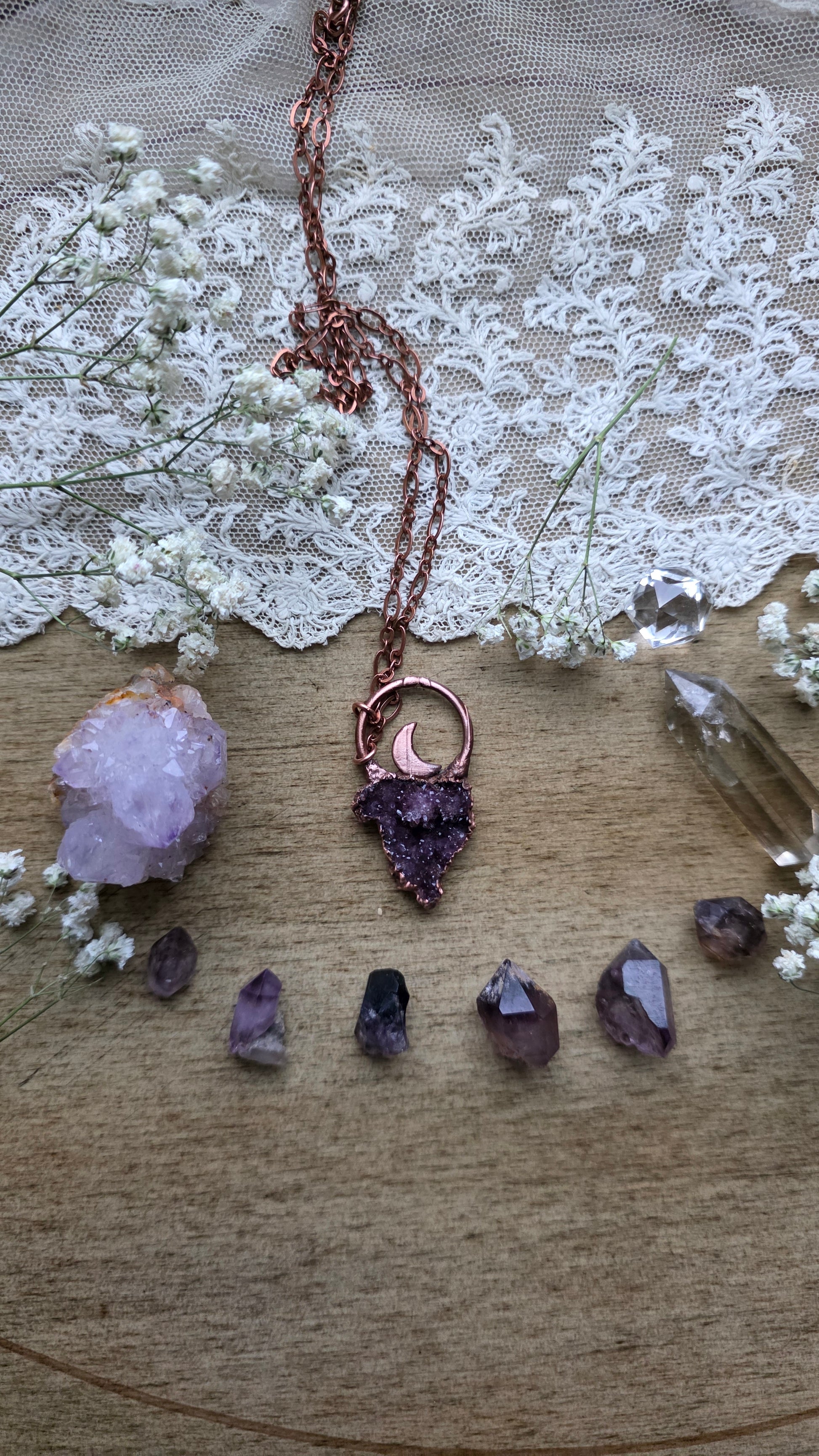 A gorgeous deep purple amethyst druzy from Turkey, paired with a crescent moon and oversized bail, coated in copper using a technique known as electroforming. The copper on this piece has been darkened with a patina to give it an antiqued look and this comes on 18" of antiqued copper chain with a simple clasp. If you have any questions or concerns please contact me before purchasing thank you!