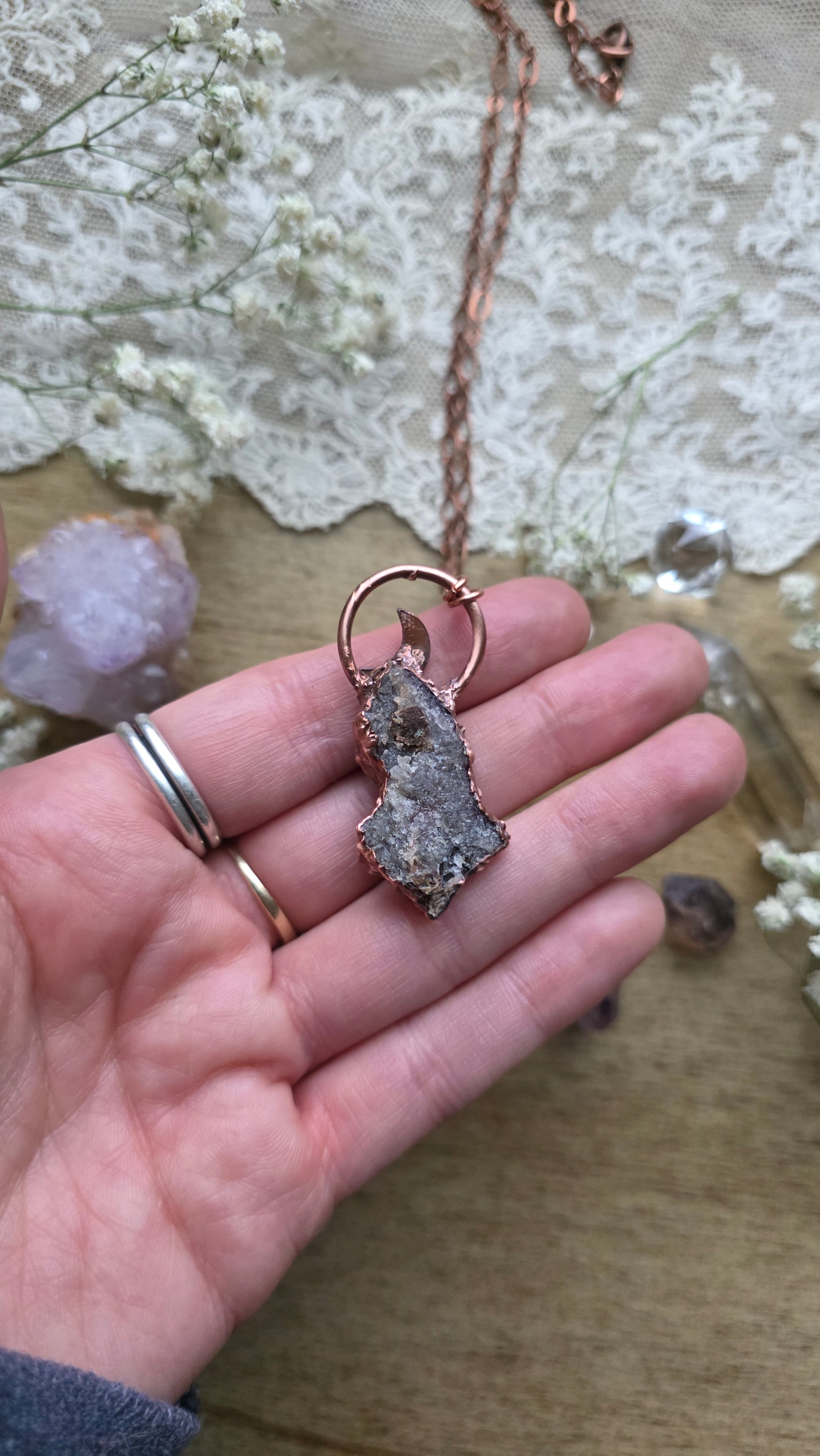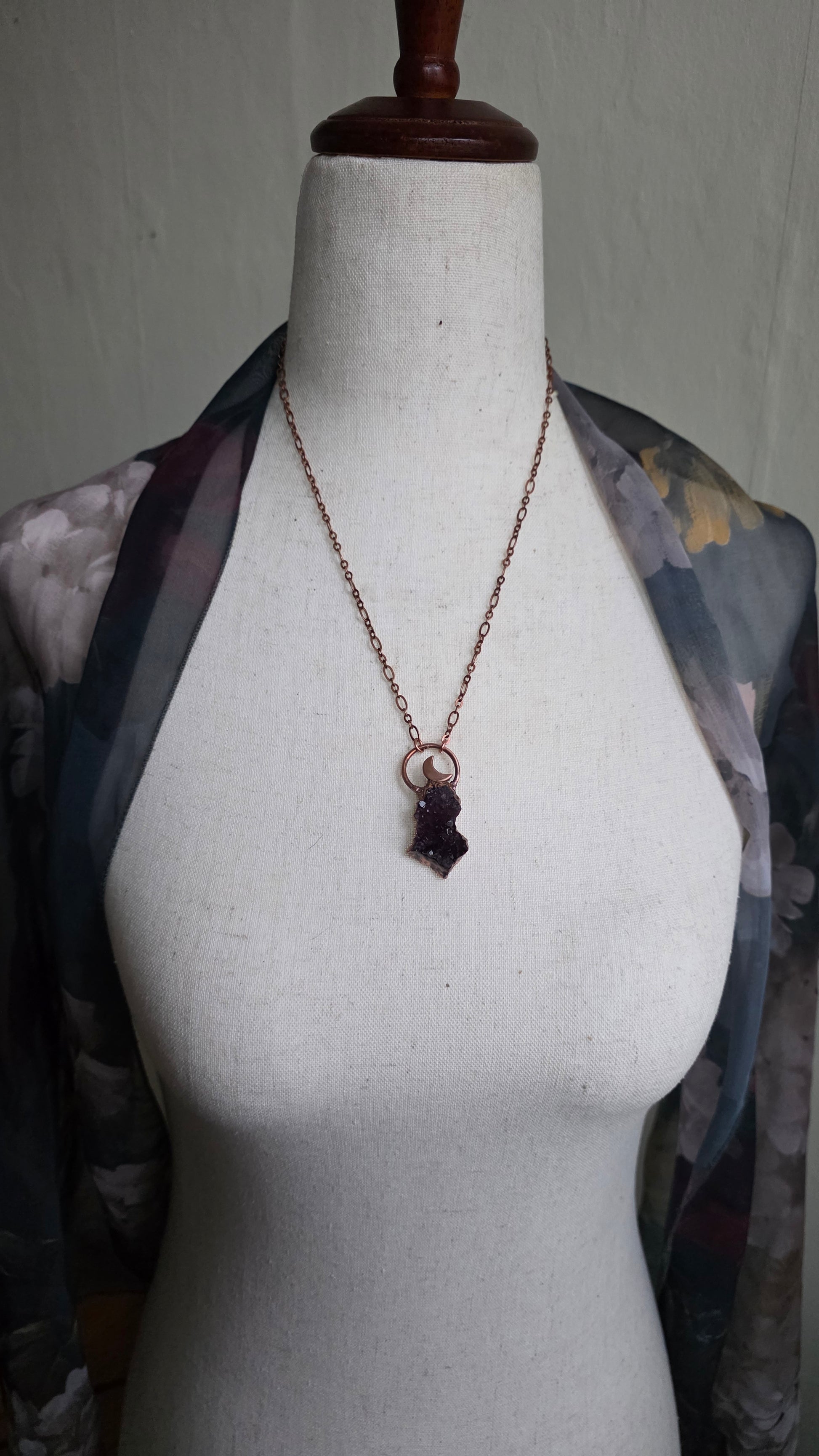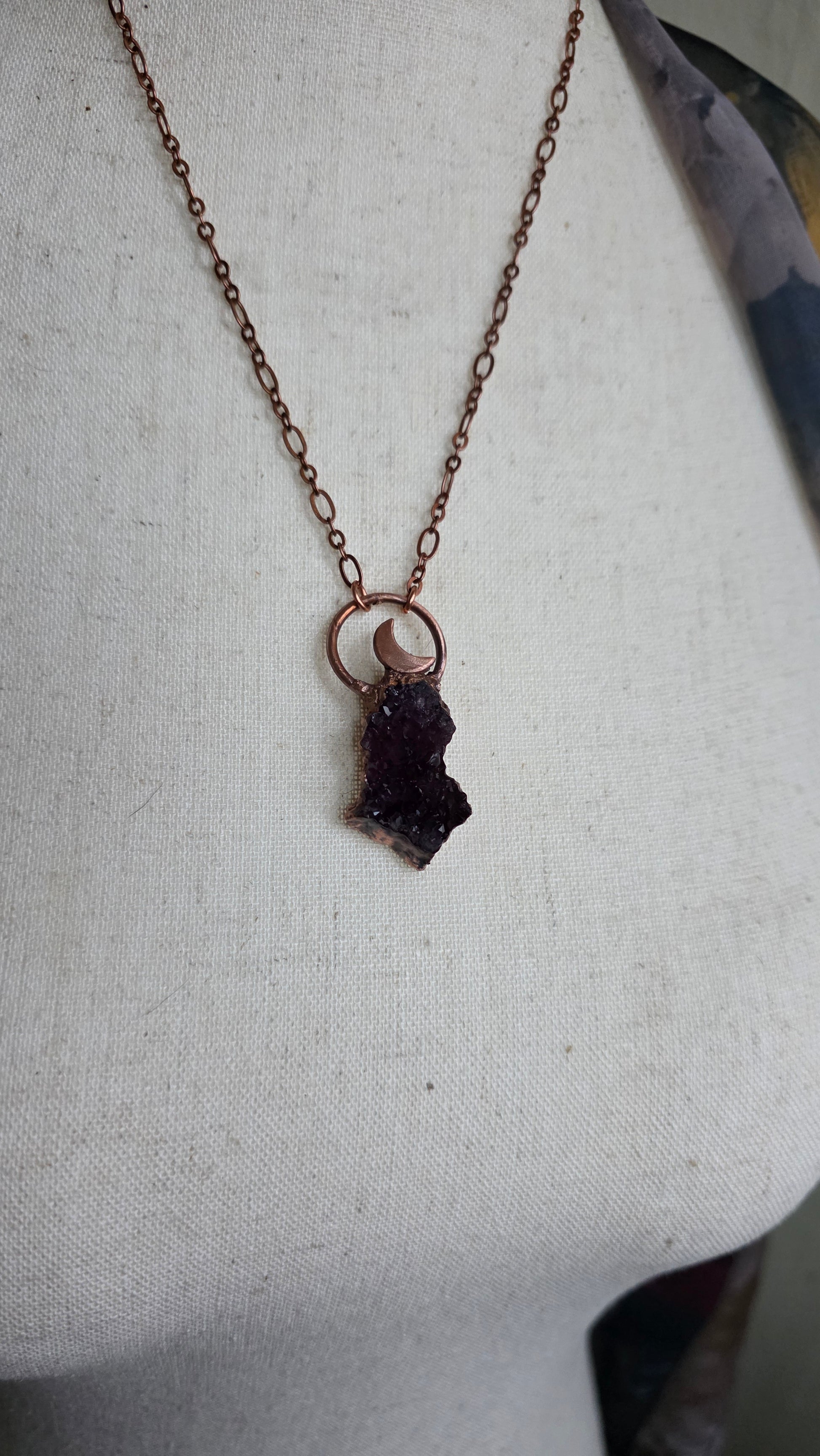 A gorgeous deep purple amethyst druzy from Turkey, paired with a crescent moon and oversized bail, coated in copper using a technique known as electroforming.  The copper on this piece has been darkened with a patina to give it an antiqued look and this comes on 18" of antiqued copper chain with a simple clasp.  If you have any questions or concerns please contact me before purchasing thank you!
