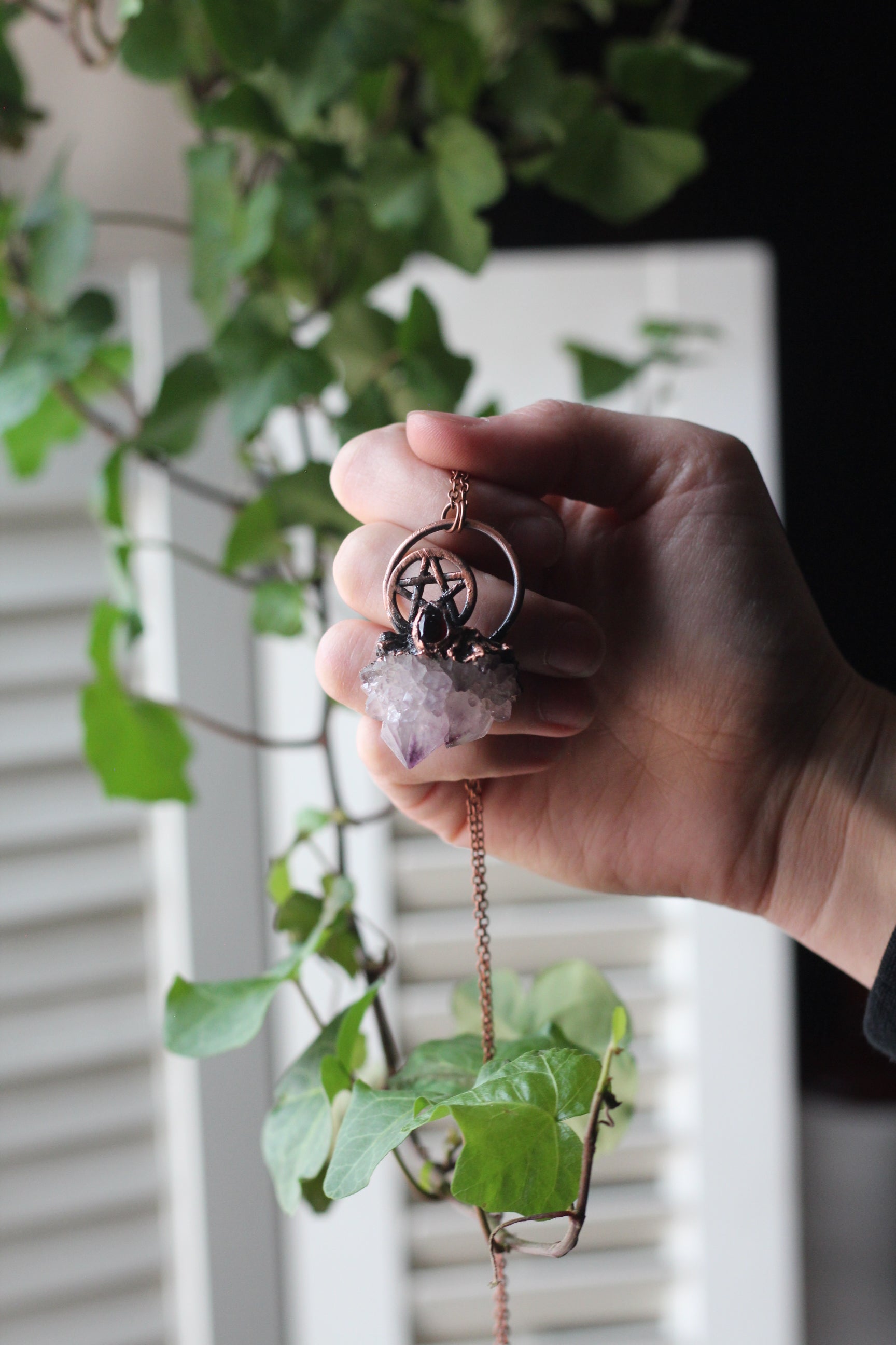 A beautiful natural amethyst spirit quartz piece, faced with garnet and topped with a pentacle, set in copper using a technique known as electroforming. The copper on this piece has been darkened with a patina to give it an antiqued look and this comes on 24" of antiqued copper chain with a simple clasp. If you have any questions or concerns about this piece please contact me before purchasing thank you!