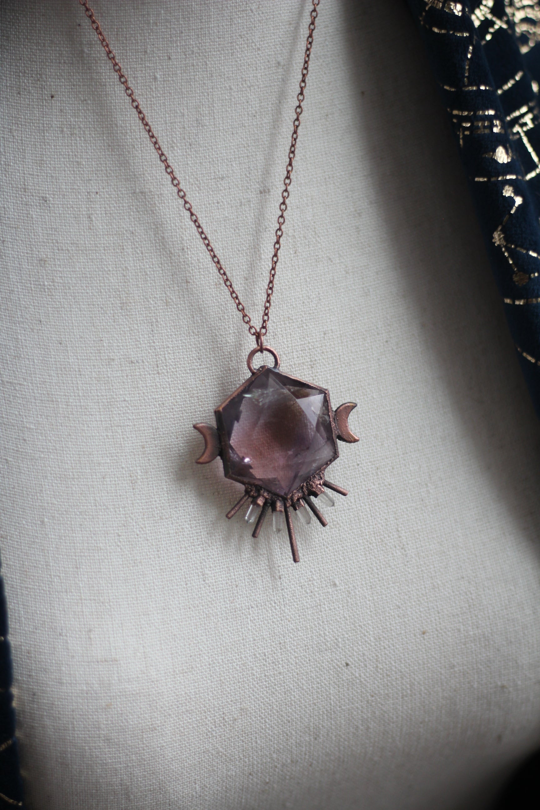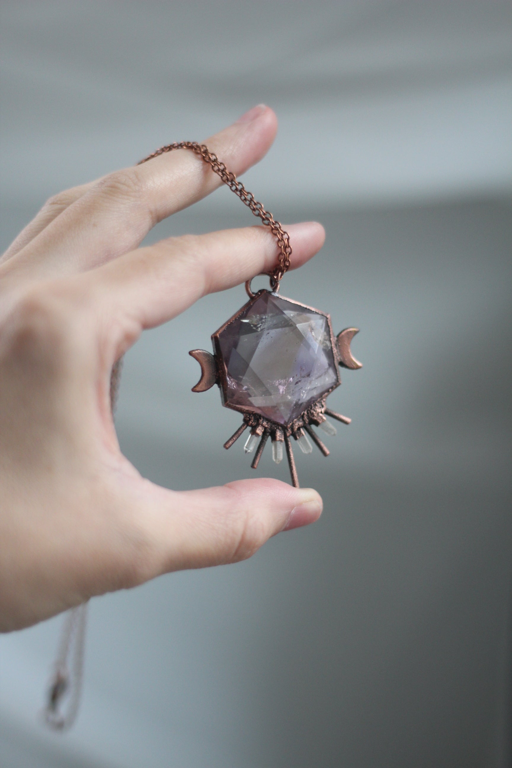 A beautiful pale ametrine hexagon with light purples and yellows and natural textures, paired with micro quartz points and copper accents, coated in copper using a technique known as electroforming. The copper on this piece has been darkened with a patina to give it an antiqued look and this comes on 18" of antiqued copper chain with a simple clasp. If you have any questions or concerns about this piece please contact me before purchasing thank you!