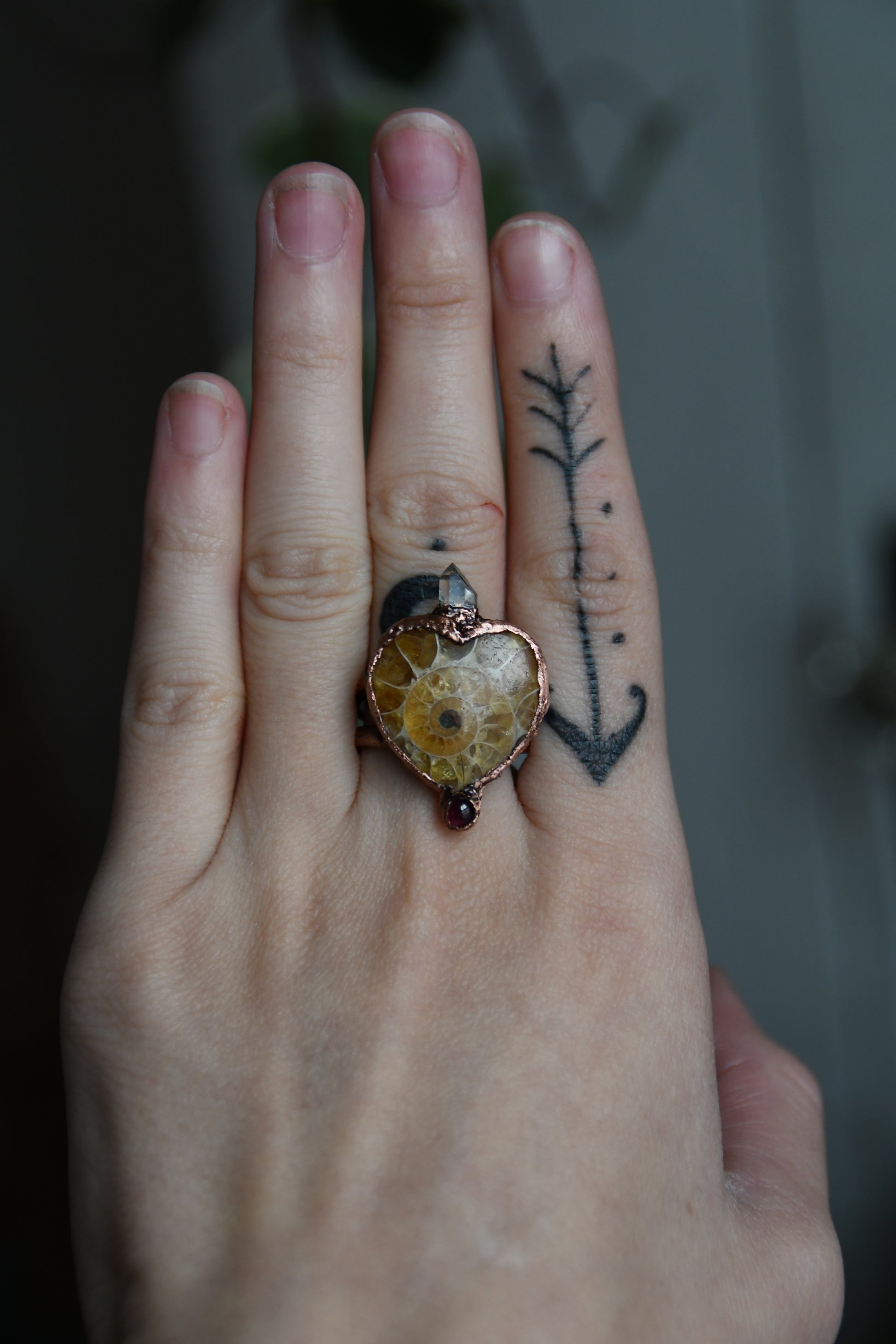 A beautiful ammonite heart cabochon paired with a gemmy garnet and herkimer quartz, coated in copper using a technique known as electroforming. The copper on this piece has been darkened with a patina to give it a antiqued look. This is a double shank ring, and like all of my copper jewelry, the texture can be more bumpy and organic than smooth but has been filed to be comfortable for wear. If you have any questions or concerns about this piece please contact me before purchasing thank you!