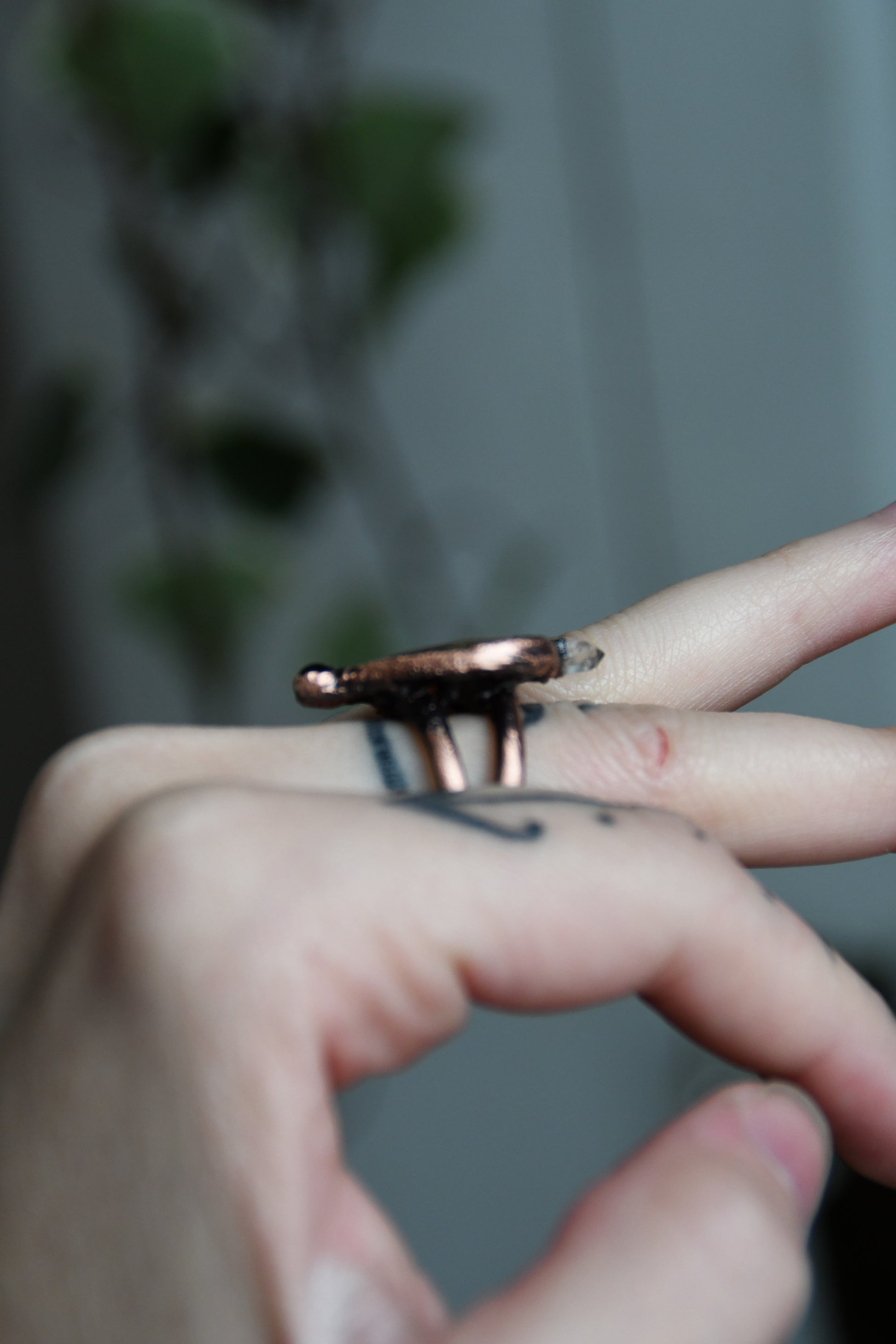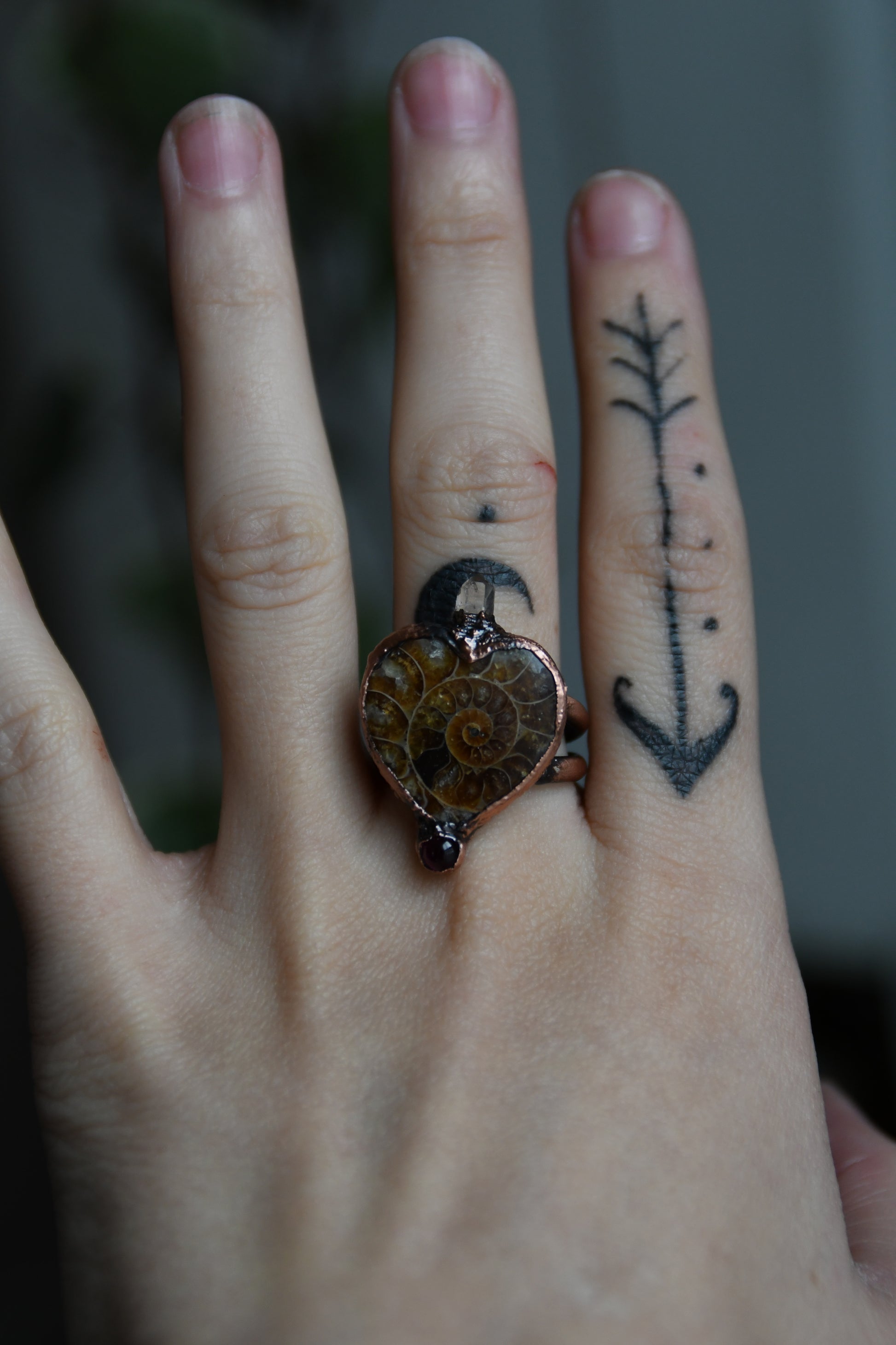 A beautiful ammonite heart cabochon paired with a gemmy garnet and herkimer quartz, coated in copper using a technique known as electroforming. The copper on this piece has been darkened with a patina to give it a antiqued look. This is a double shank ring, and like all of my copper jewelry, the texture can be more bumpy and organic than smooth but has been filed to be comfortable for wear. If you have any questions or concerns about this piece please contact me before purchasing thank you!