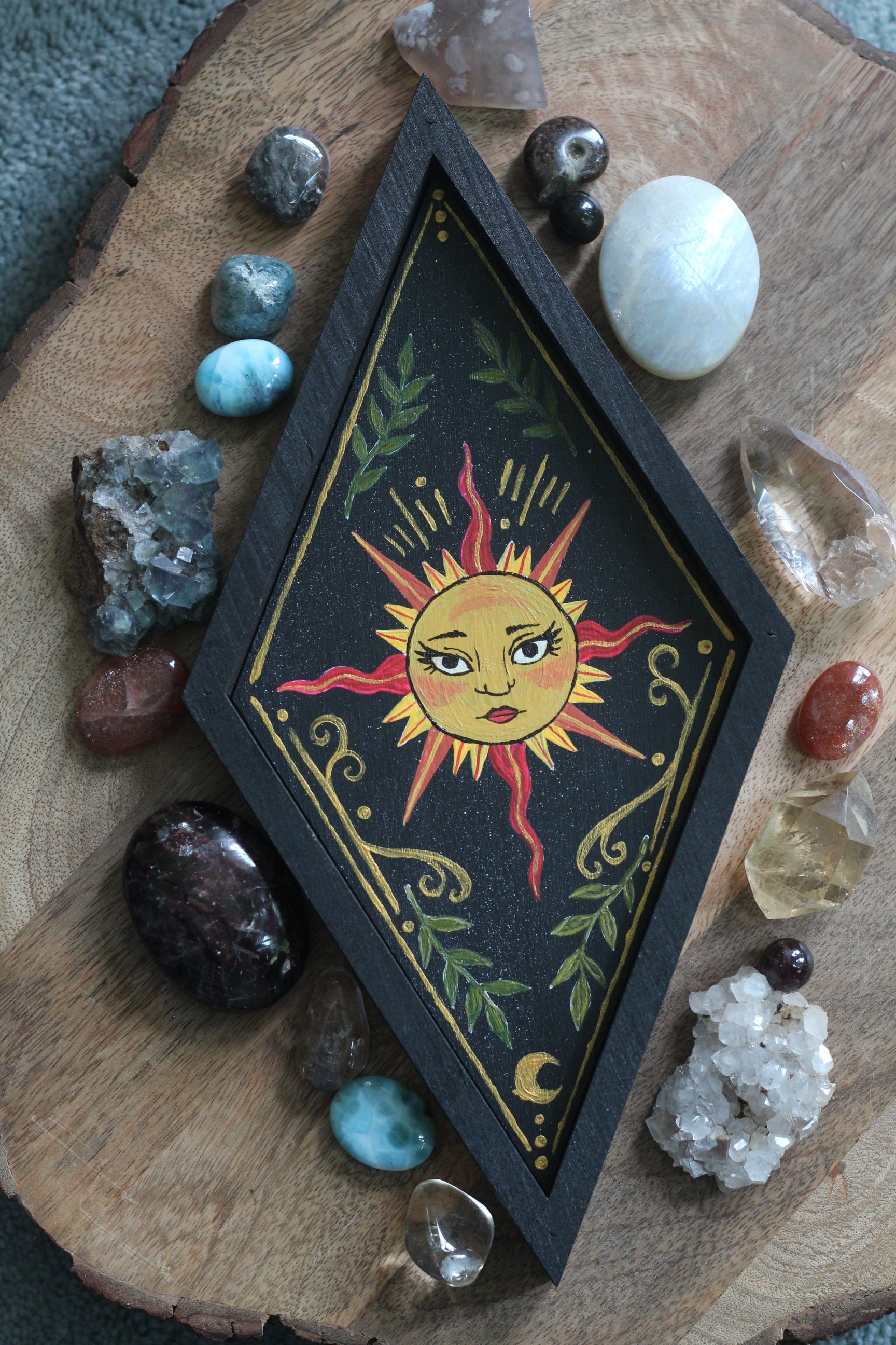 A diamond shaped wooden tray that has been stained on the edges and features a hand painted sun with gold paint on its surface. This is the perfect little tray to house your mini crystal collection while also adding to your home decor or sacred space. These are painted using acrylic paint and are sealed under varnish. Because this is hand painted and wood please refrain from getting this tray wet. If you have any question or concerns please contact me before purchasing thank you!