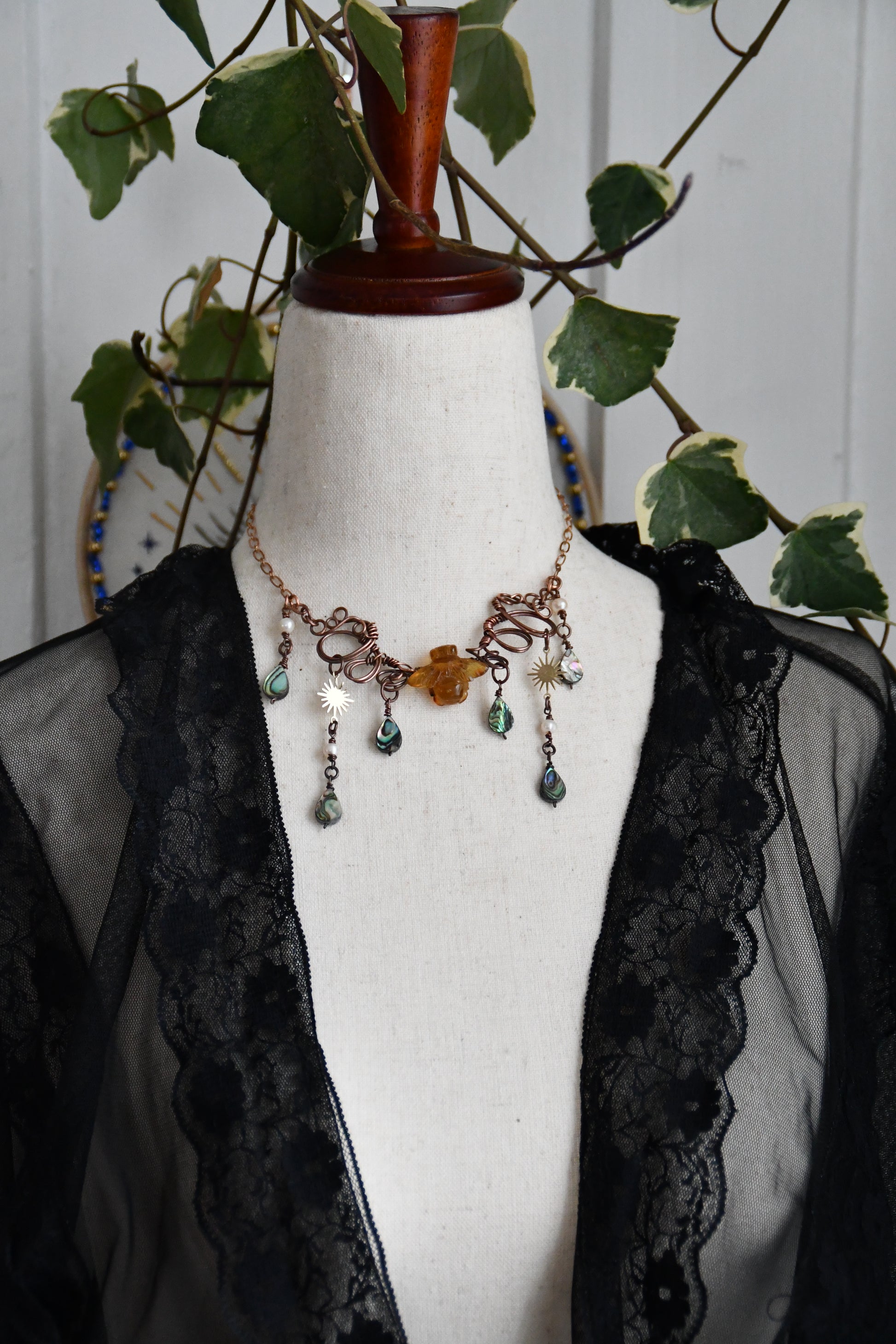A beautiful Chiapas hand carved amber bee carefully wire wrapped in a funky loopy pattern with copper wire, and adorned with dangly fresh water pearls, abalone tear drops, and brass suns. This is around choker length (13-14") and comes with a 2" extender. If you have any questions or concerns about this piece please contact me before purchasing thank you!
