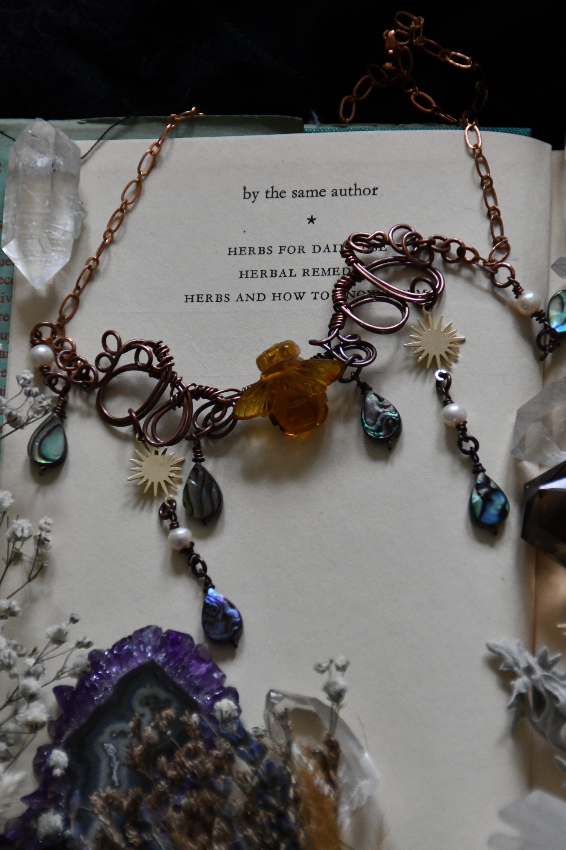 Copper Wire Wrapped Amber Bee Necklace with Fresh Water Pearls and Abalone