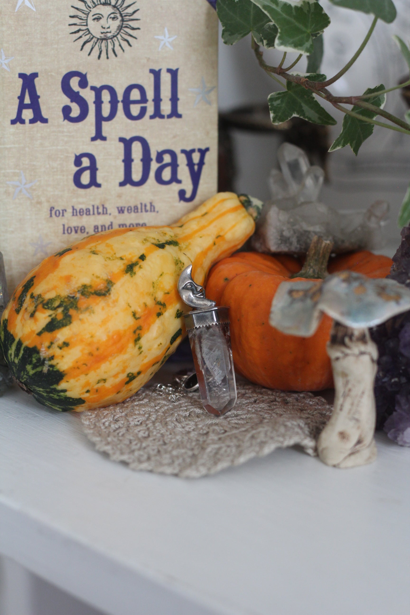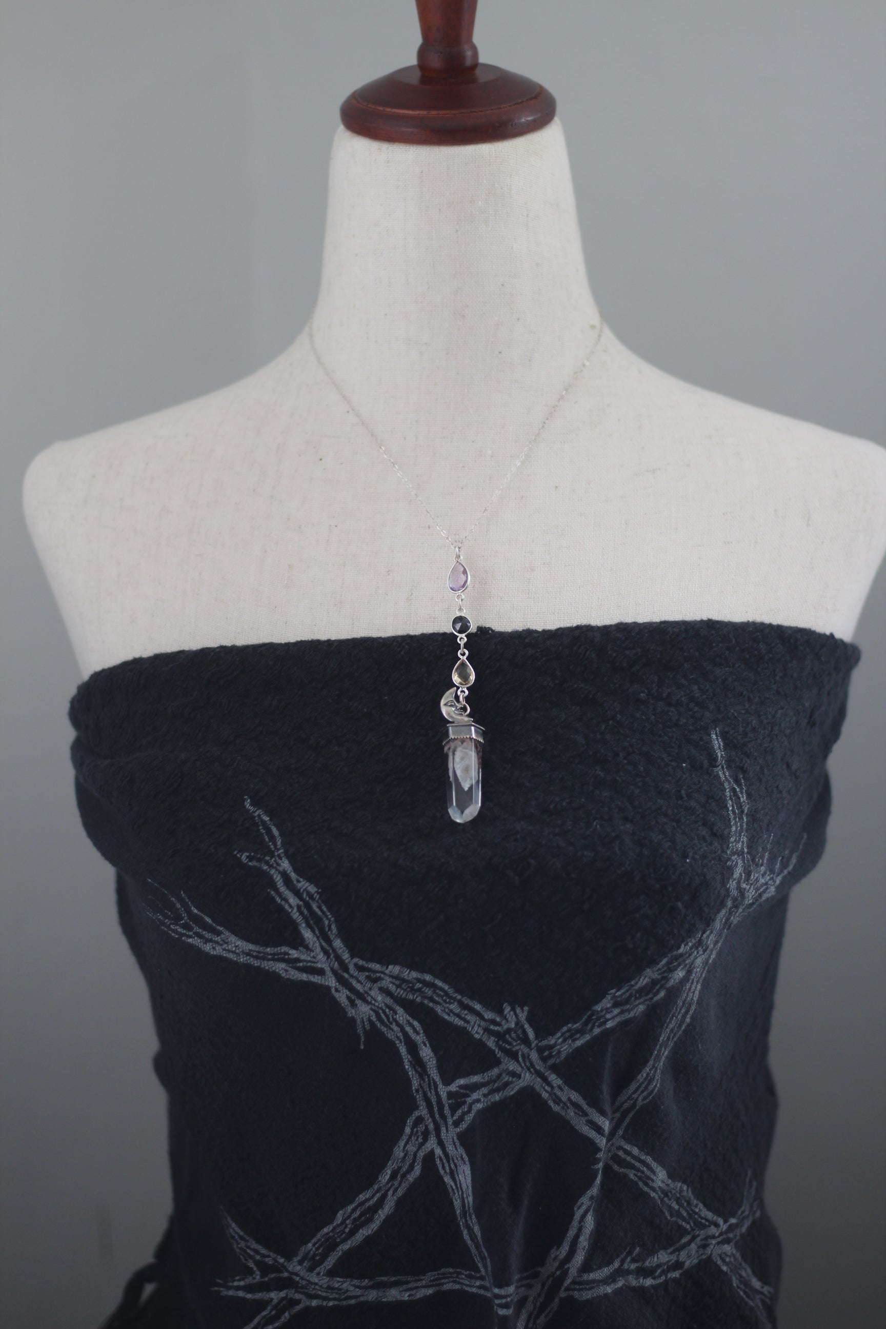 A beautiful crystal clear phantom quartz point, topped with sterling silver, and a crescent moon face. This piece dangles from a chain made of faceted citrine, obsidian, and faceted amethyst and hangs on a 16" sterling silver chain for the perfect layered accessory. Because of the weight of the moon this does hang in a whimsical way that may turn slightly to the side, but falls back into place easily. If you have any questions or concerns about this piece please contact me before purchasing thank you!