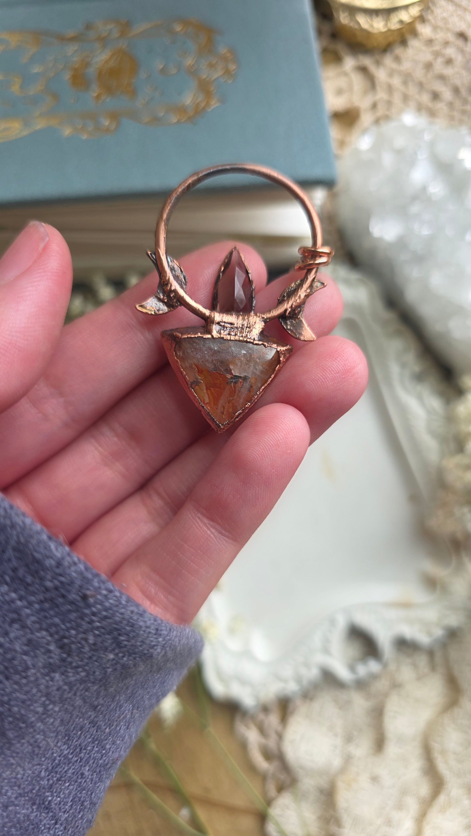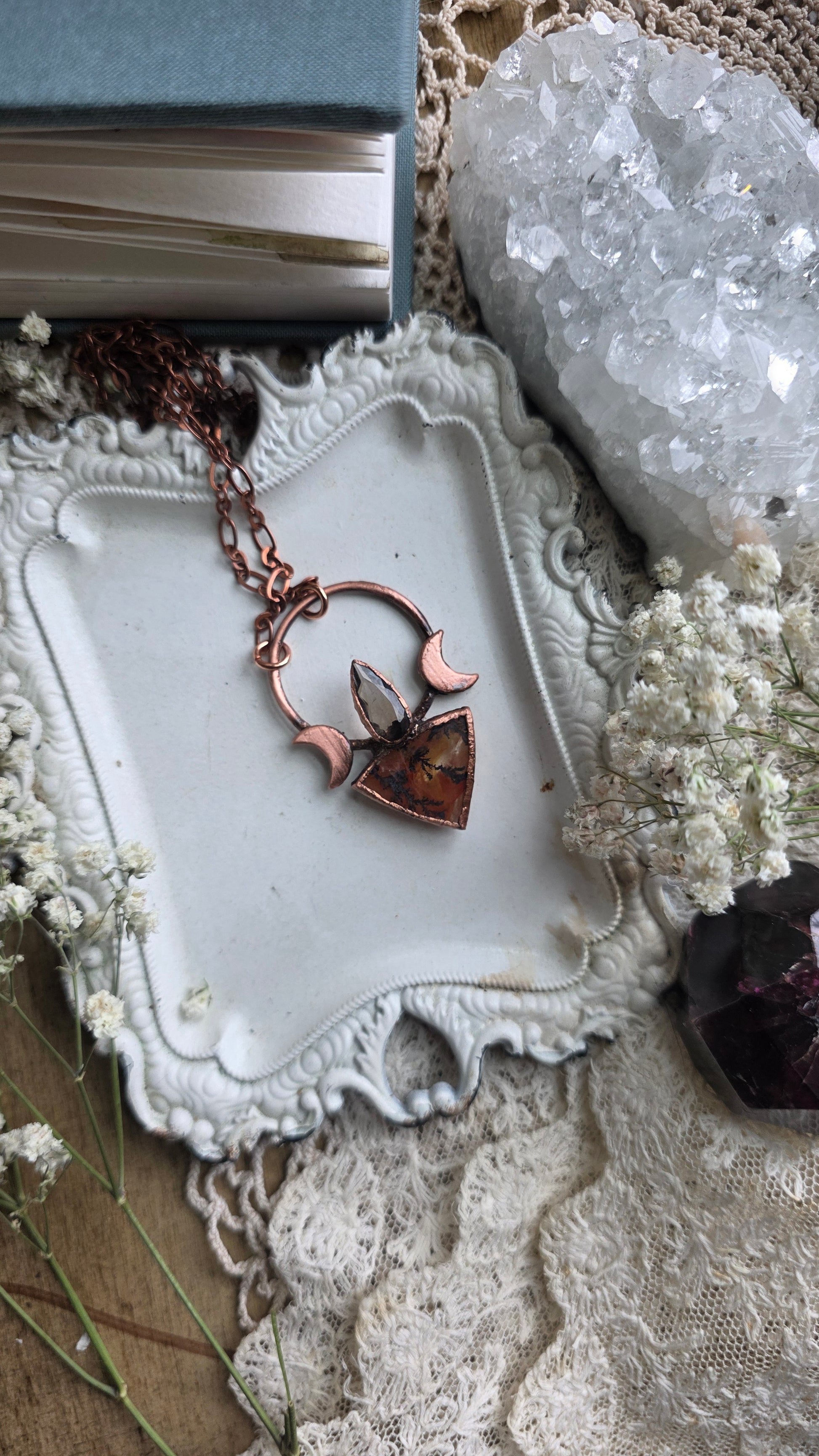 A beautiful dendritic quartz cabochon, topped with a colombianite and paired with crescent moons, set in copper using a technique known as electroforming. The copper on this piece has been darkened with a patina to give it an antiqued look and this comes on 18" of antiqued copper chain with a simple clasp. If you have any questions or concerns please contact me before purchasing thank you!