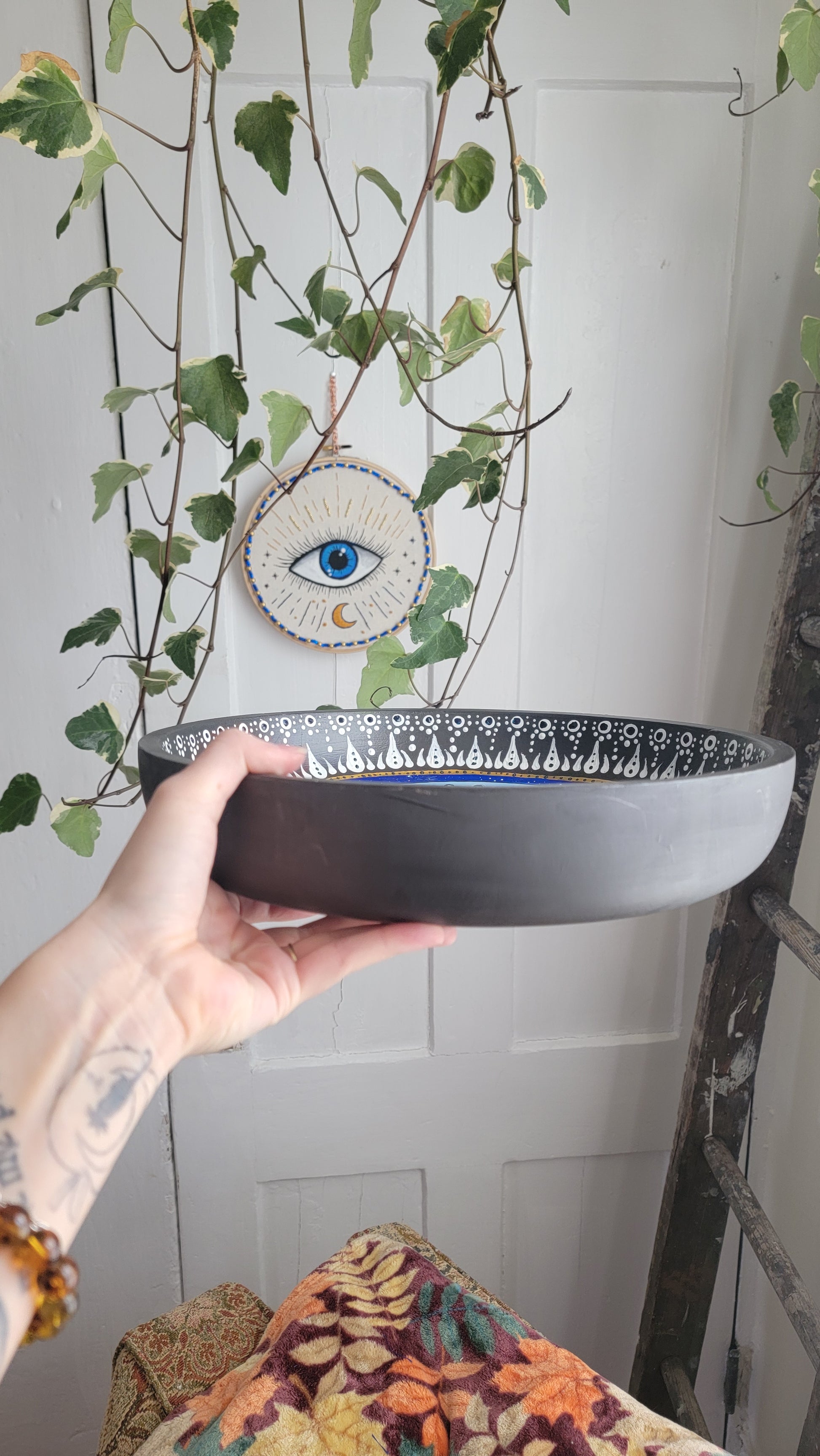Hand painted shallow wooden bowl done in acrylic. An original moon painting in different hues of blue with metallic gold paint accents and textures. This bowl measures 12" in diameter. It has been finished with a water resistant varnish to make dusting and light damp wiping easy. This piece can be perfect to adorn your altar, hold your crystal collection and offerings, or stand alone decor.