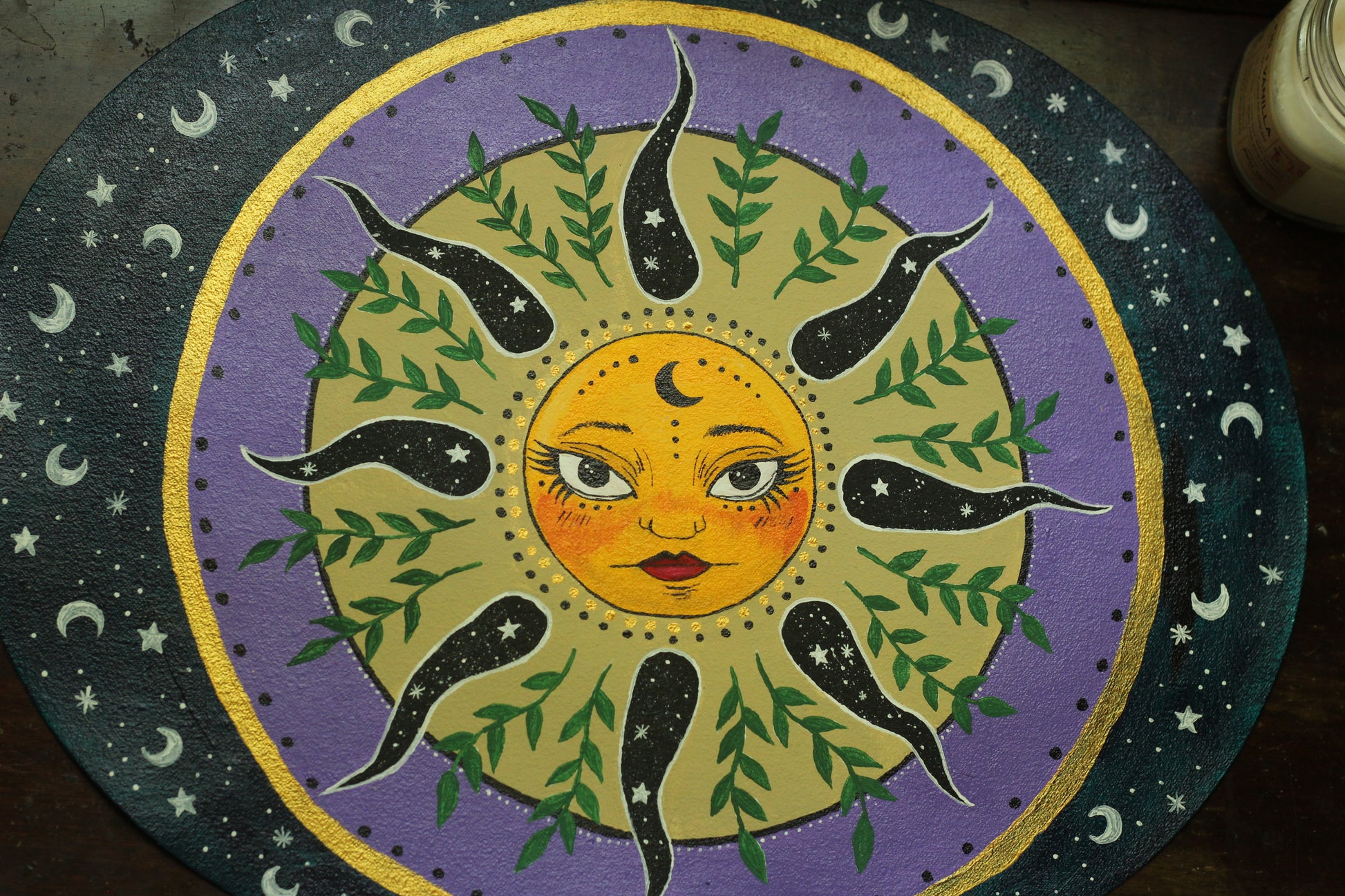 A hand painted canvas placemat done in acrylic with gold acrylic paint accents. Sealed in glossy varnish to make it water resistant. This is the perfect piece to place on your altar or in a sacred space, or simply use as home decor as an accent piece.