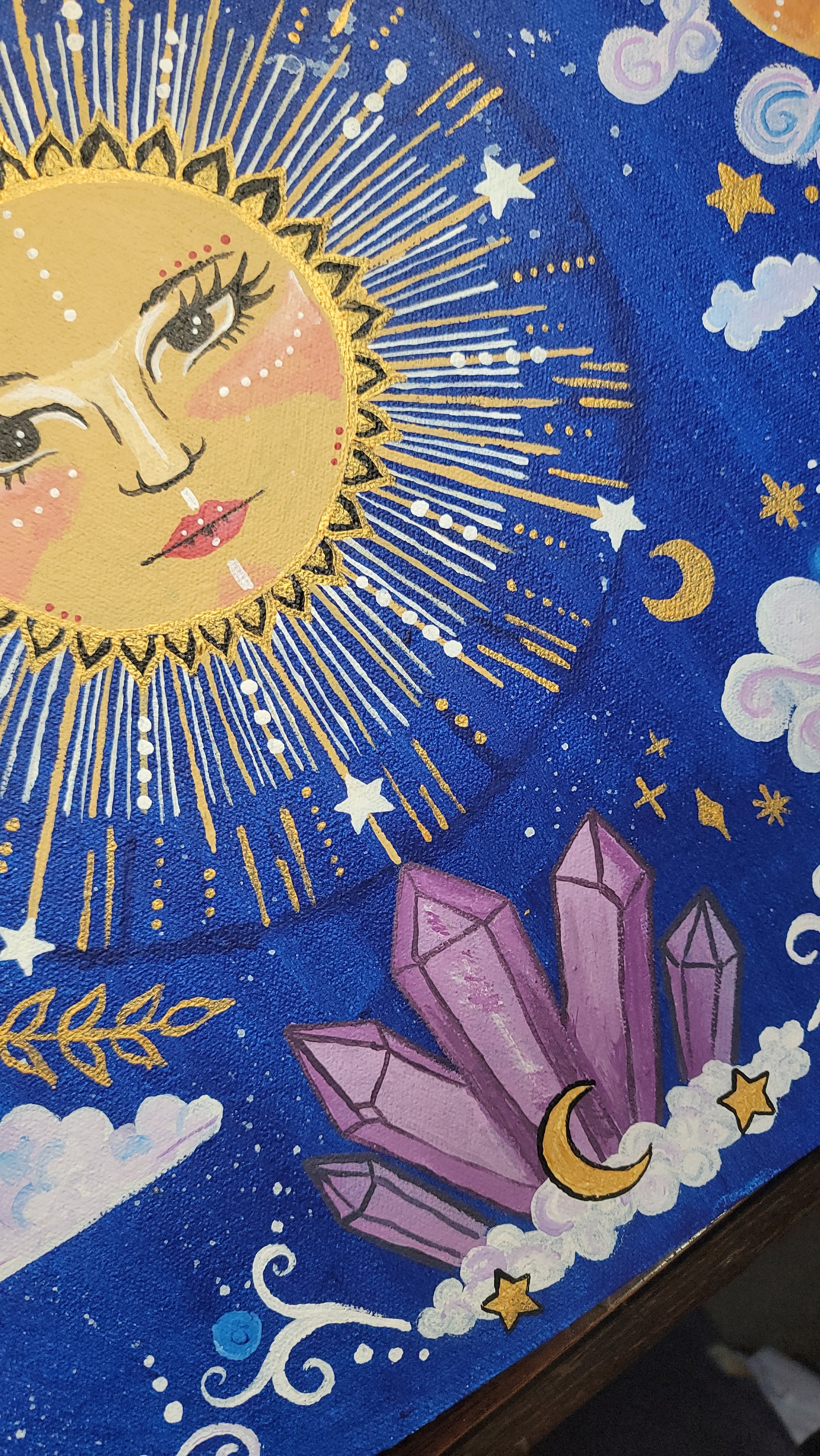 This piece is a hand painted canvas mat that can be used to add to your sacred spaces, altars, or simply used as home decor. It features sun and moon imagery with crystals, all done in acrylic paint and sealed in a matte finish. While this piece is considered a mat, it should be used as decor only and not as a place mat for food. It can take very light dusting with a damp cloth but should never be submerged in water or scrubbed down. If you have any questions or concerns please contact me before purchasing thank you!