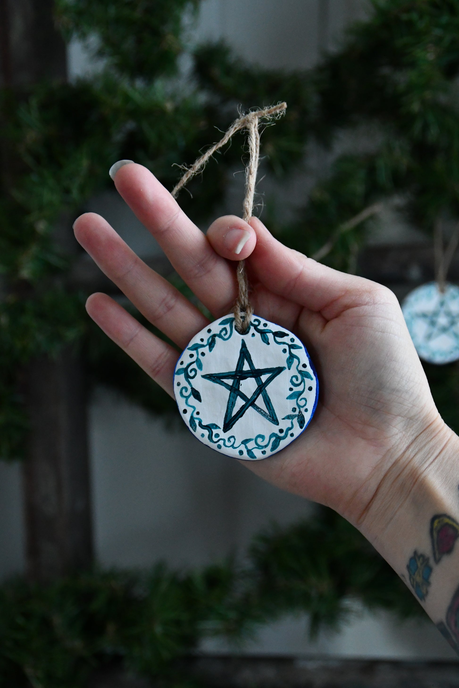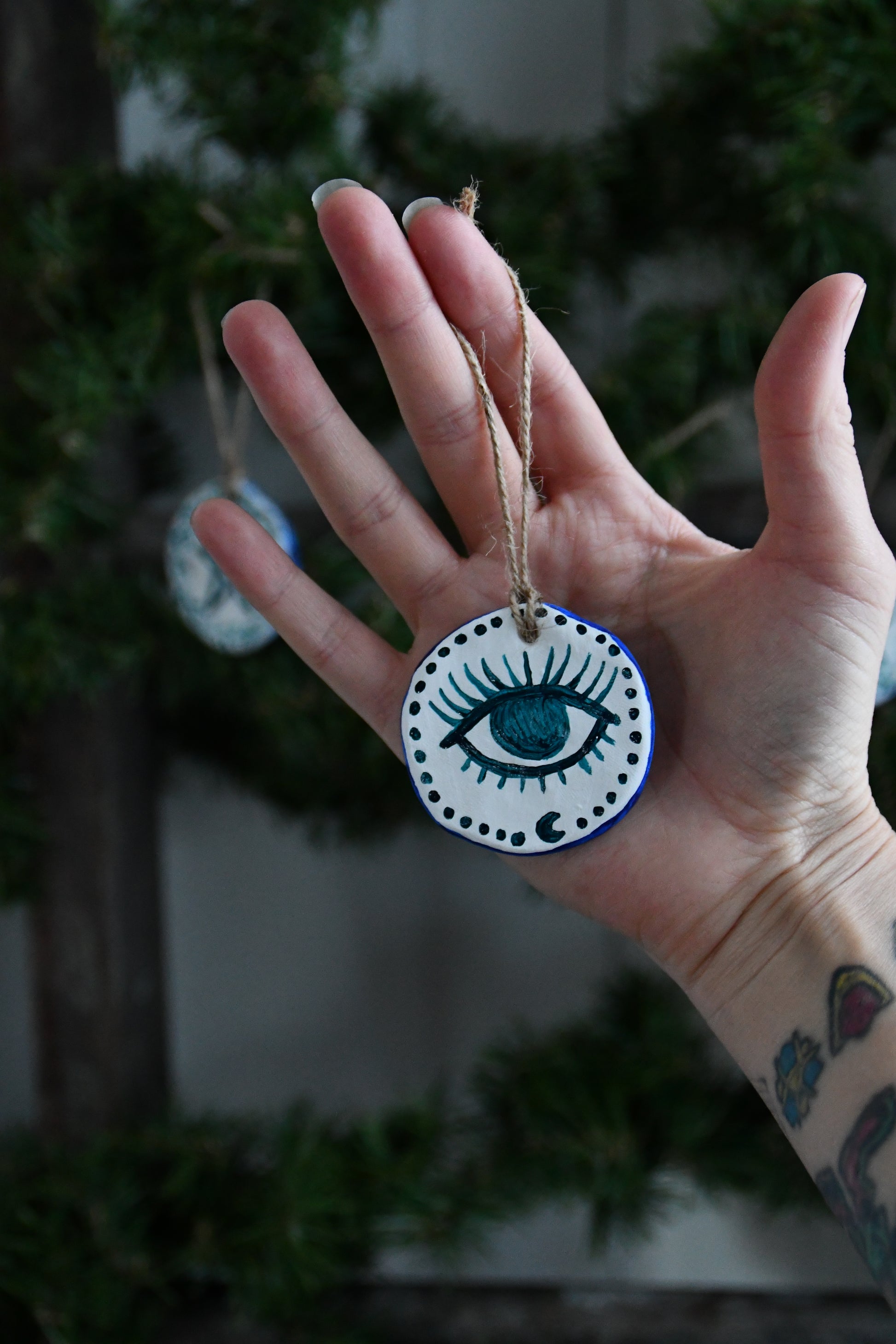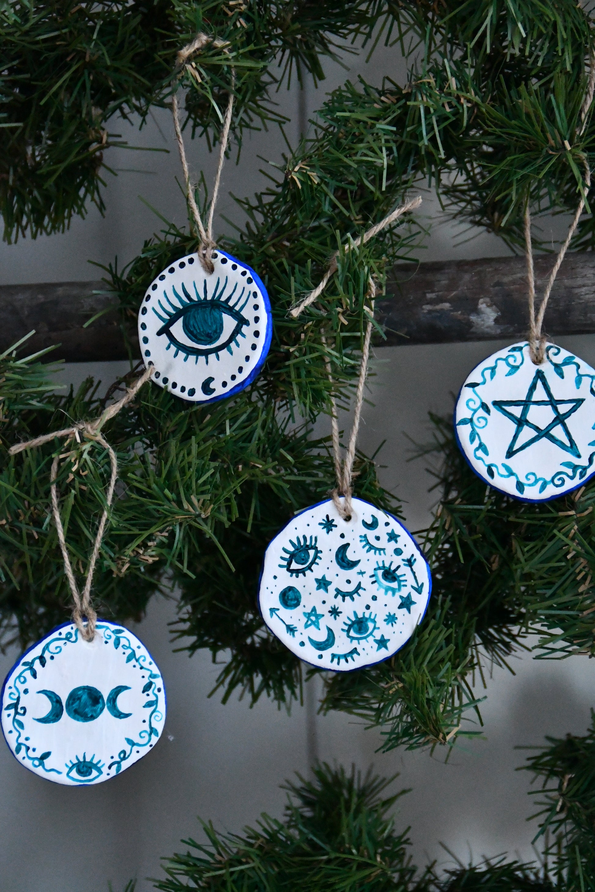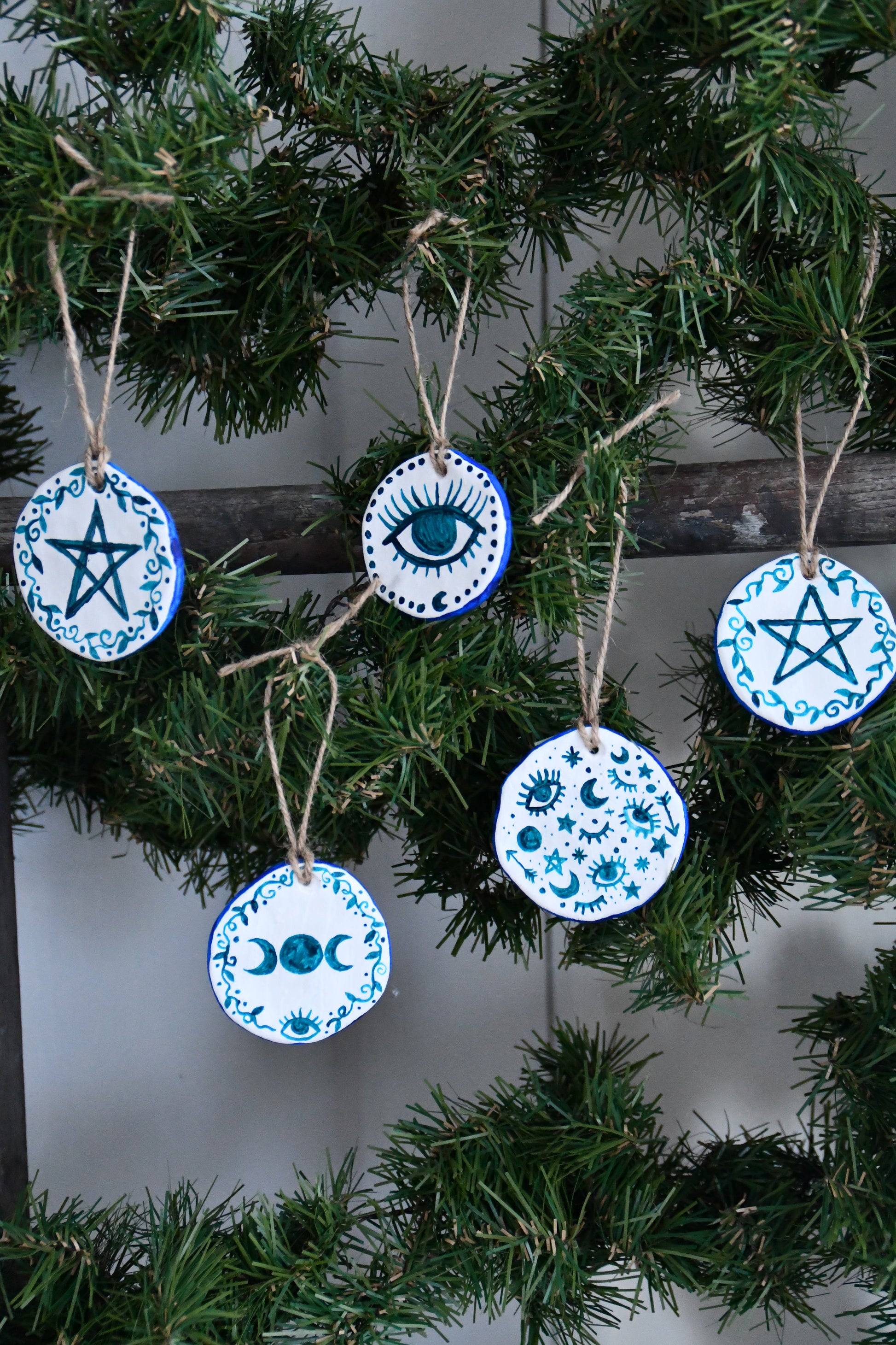 Hand pressed and painted polymer clay ornaments in your choice of style! Each one is done in acrylic paint and has a simple blue back. For decorative purposes only, keep out of reach of children and pets!