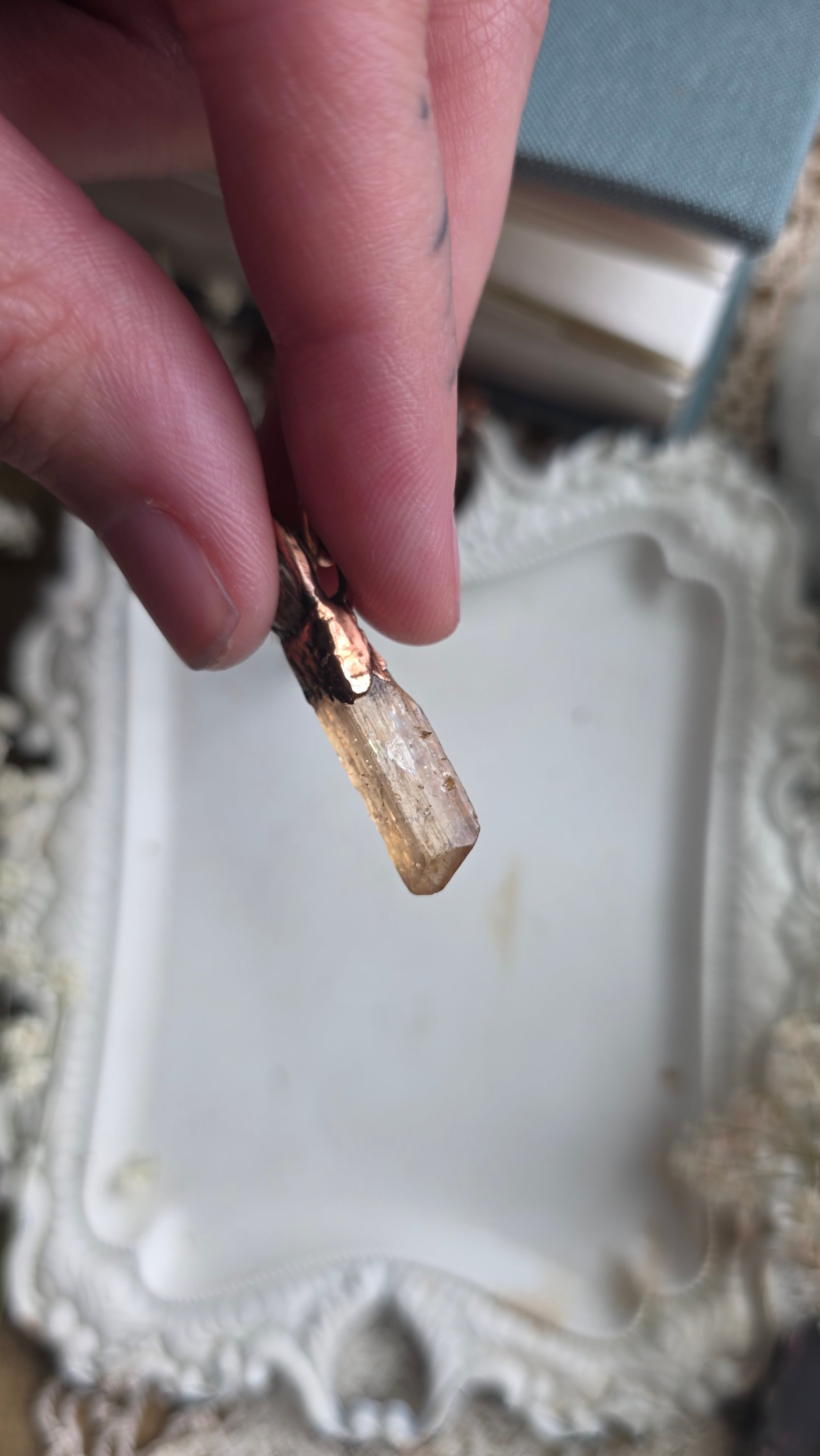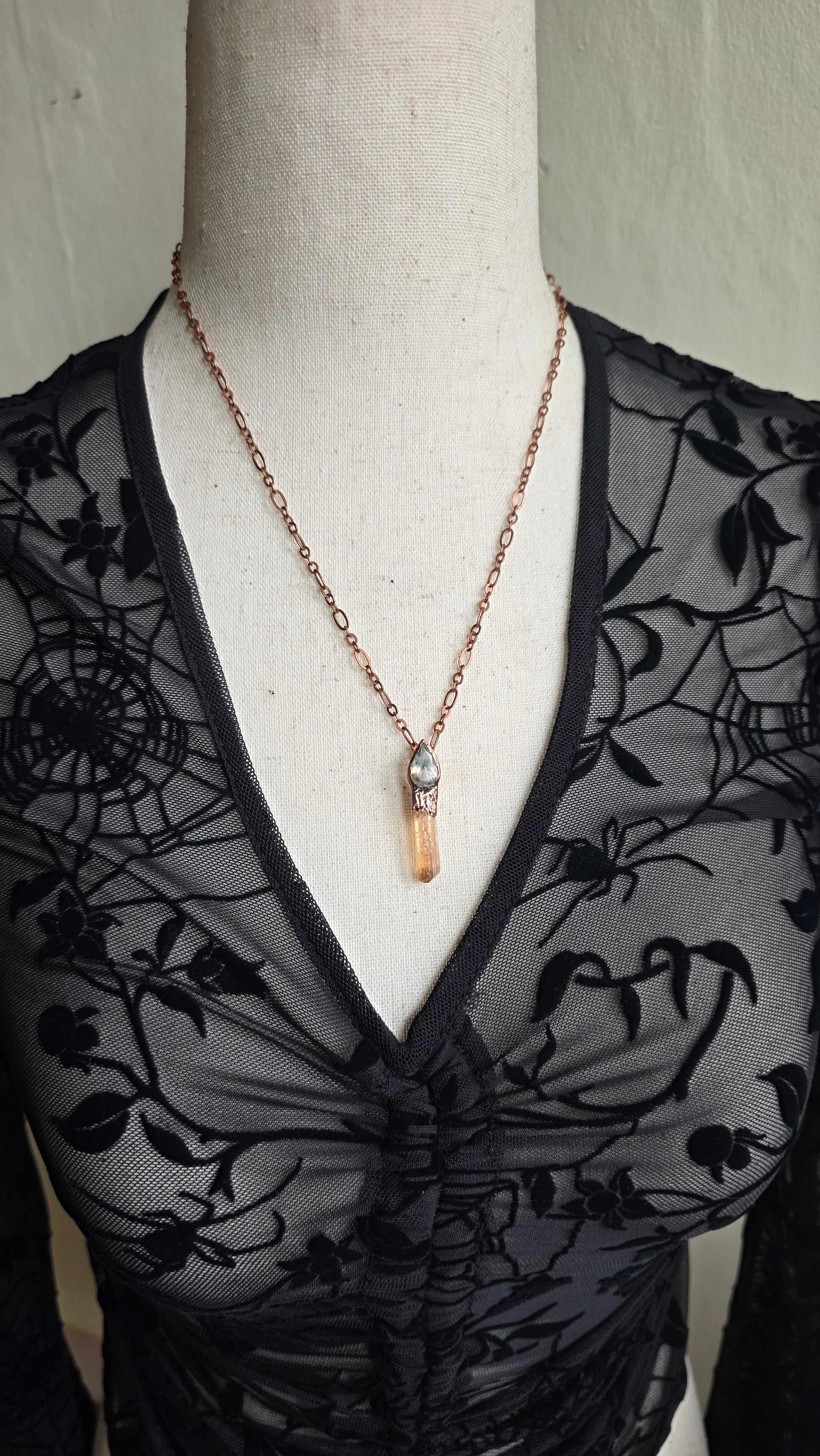 A beautiful pale aquamarine cabochon nestled on the top of a piece of imperial topaz, coated in copper using a technique known as electroforming. The copper on this piece has been darkened with a patina to give it an antiqued look and this comes on 18" of antiqued copper chain with a silver clasp. If you have any questions or concerns about this piece please contact me before purchasing thank you!