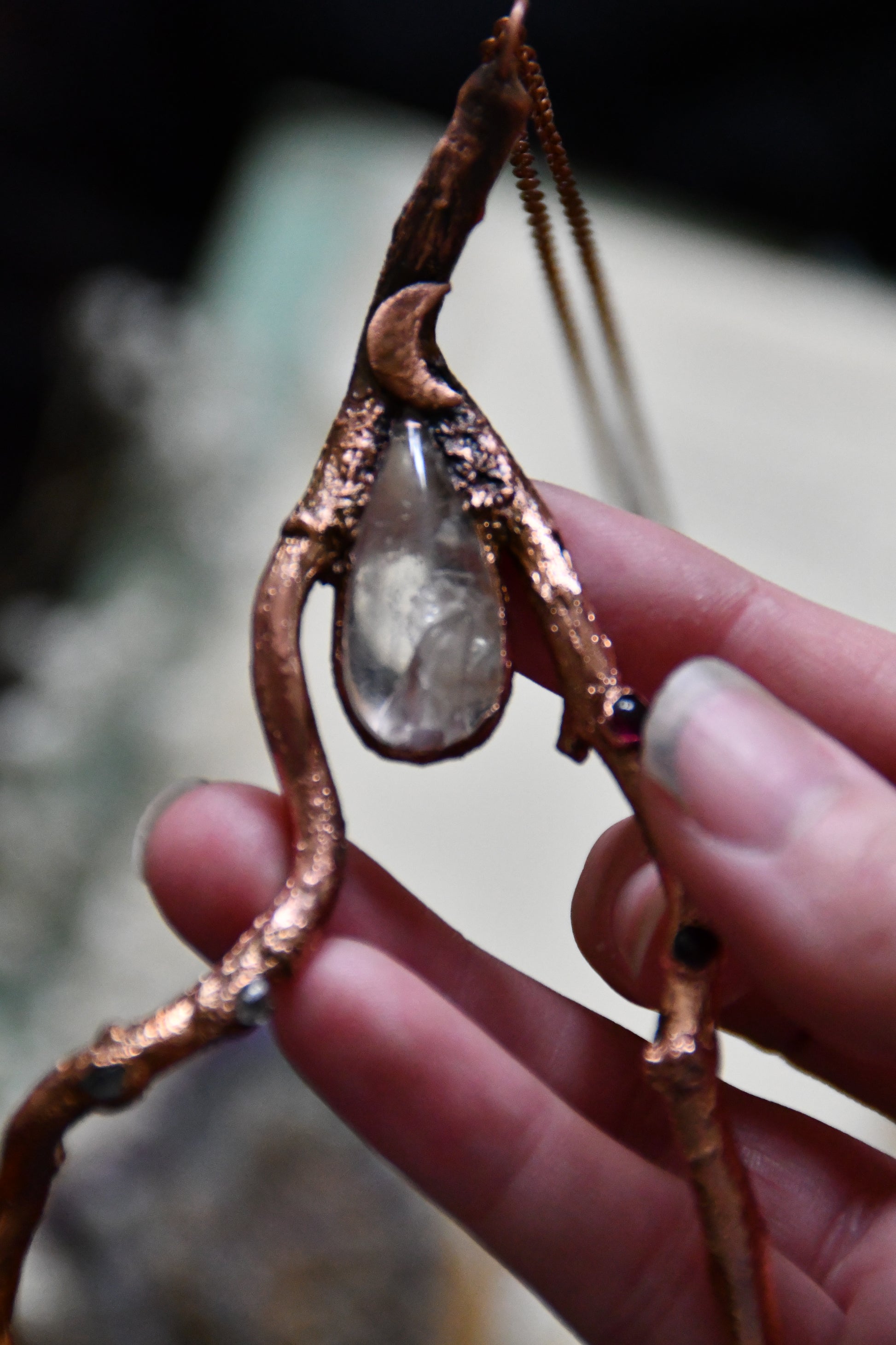 A real twig that has been paired with a manifestation quartz, garnet, and herkimers, set in copper using a technique known as electroforming. This piece is large and in charge measuring around 4.5" in length and comes on 24" of antiqued copper chain with a simple clasp. If you have any questions or concerns about this piece please contact me before purchasing thank you!
