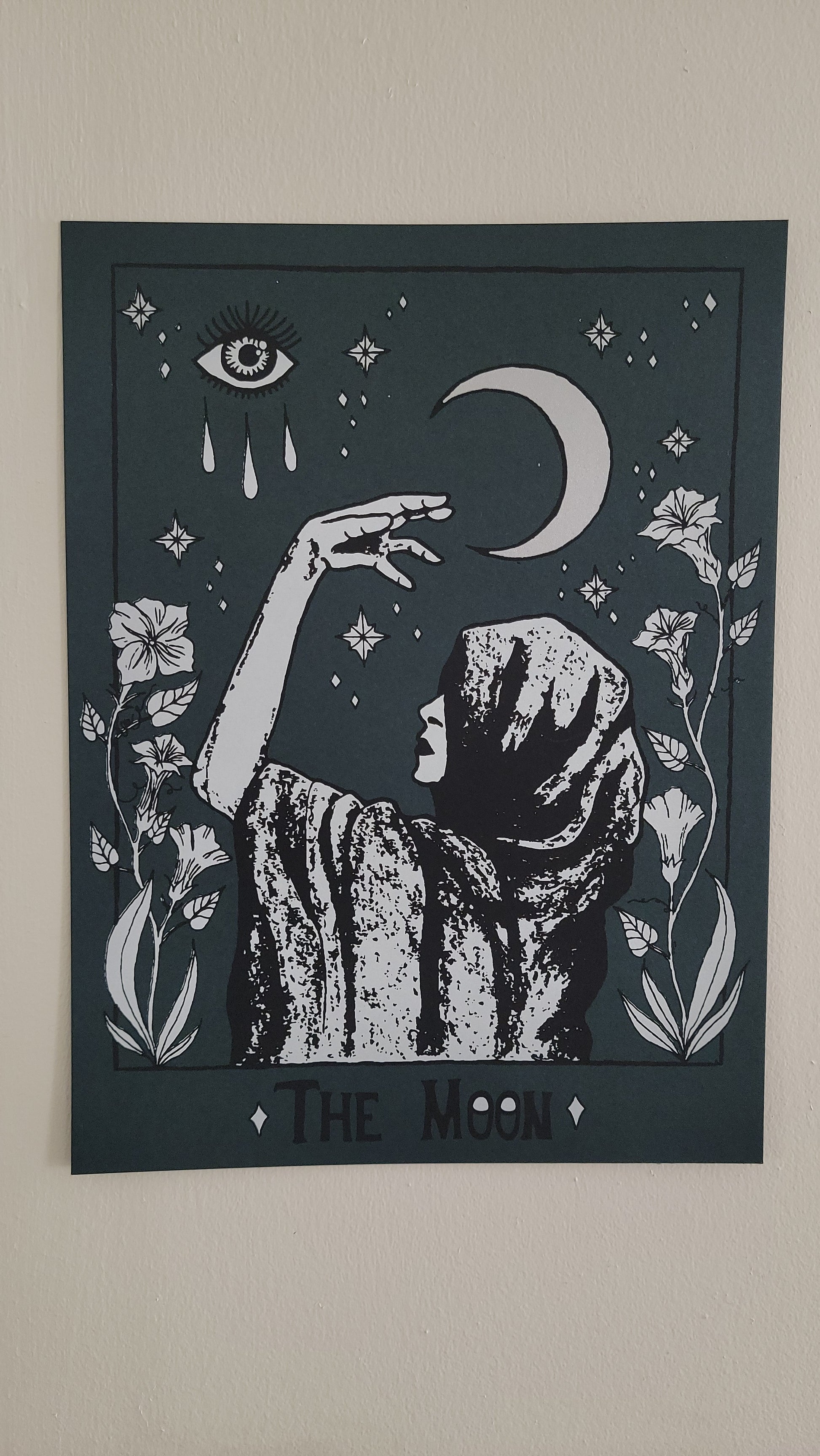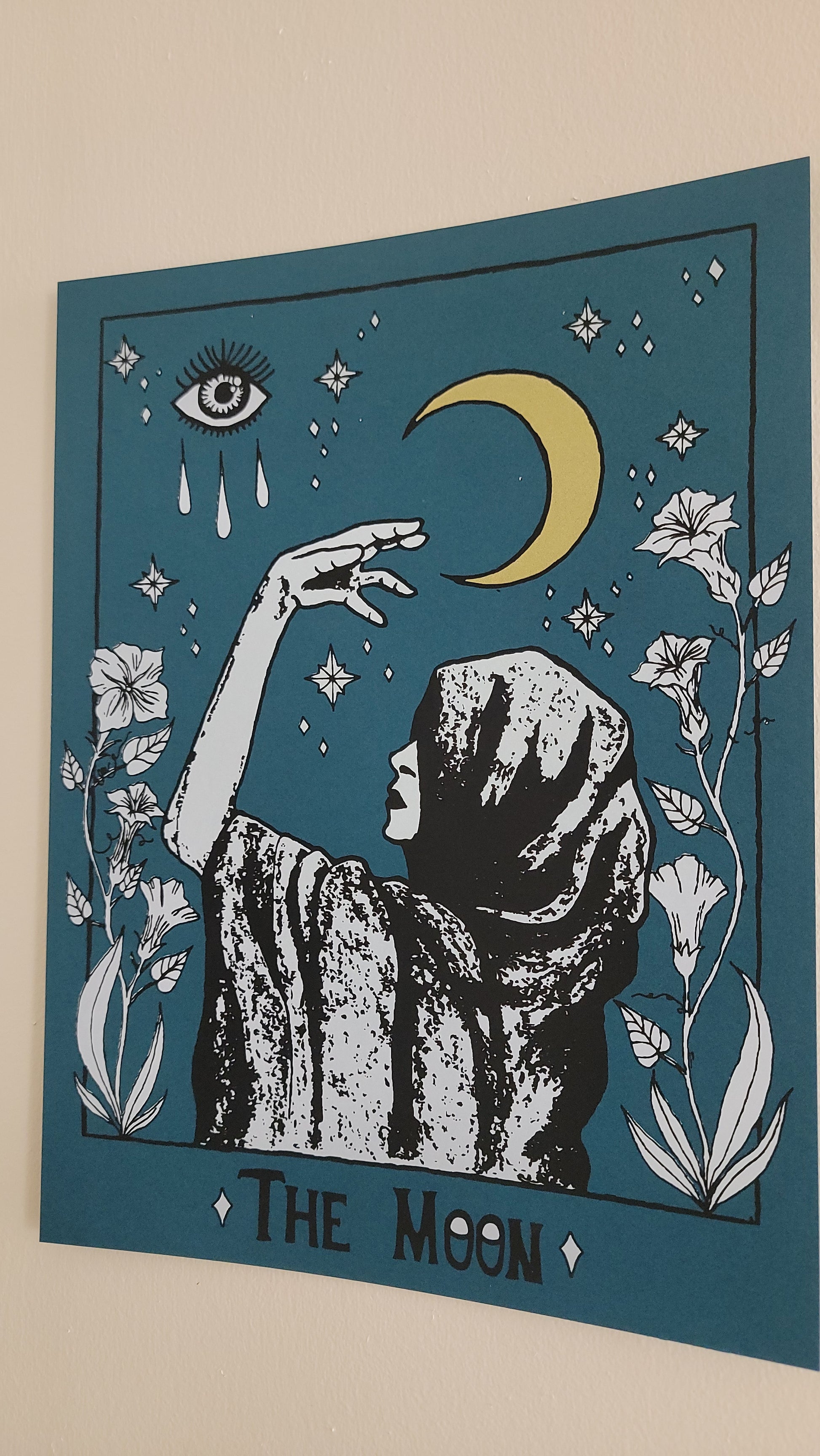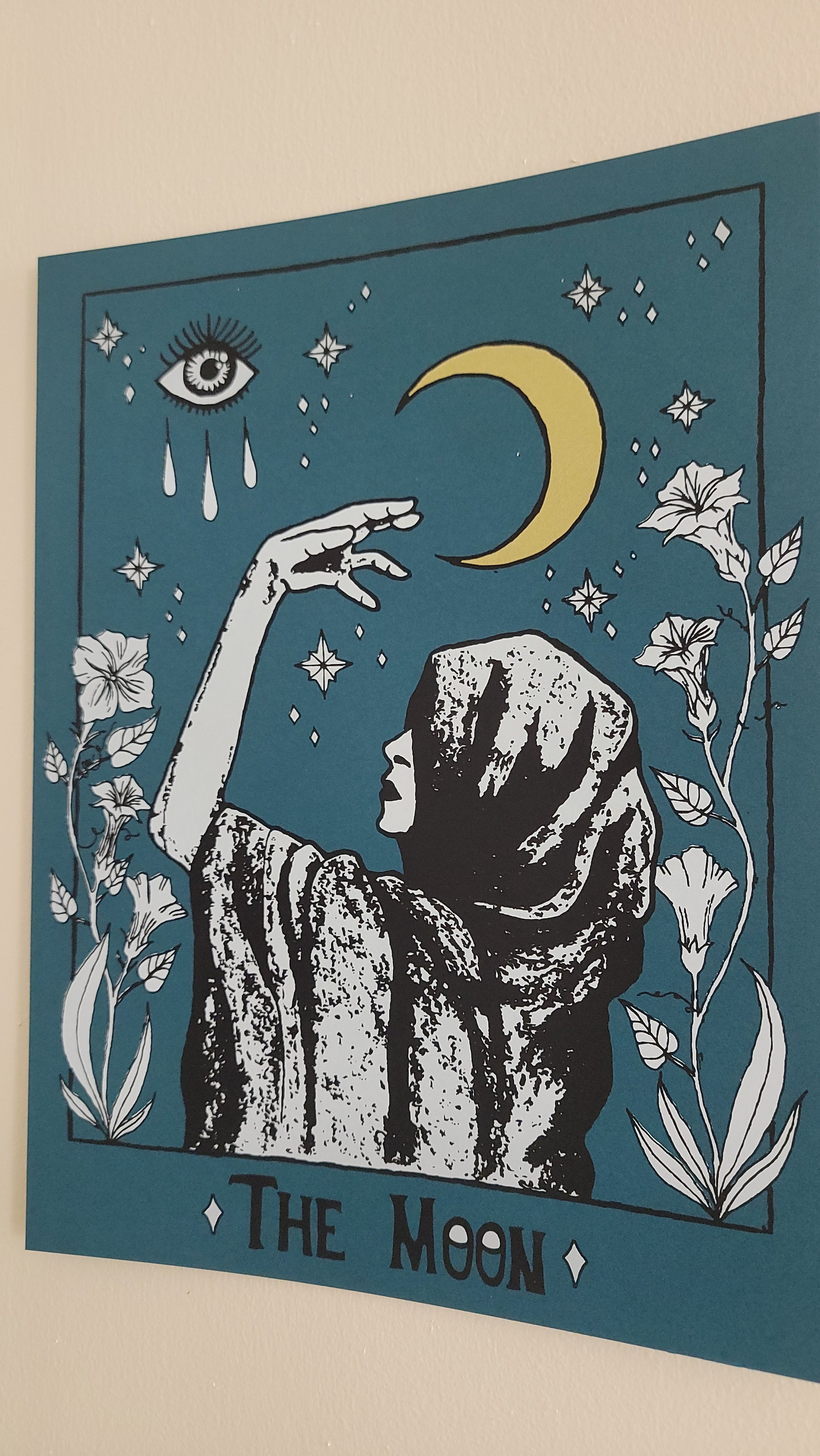 Original "The Moon" drawing by myself that has been screen printed by atmosphere print co. These are limited stock, because much like my own work, all of these prints are done by hand! Each print features the original drawing and a metallic moon that glimmers.