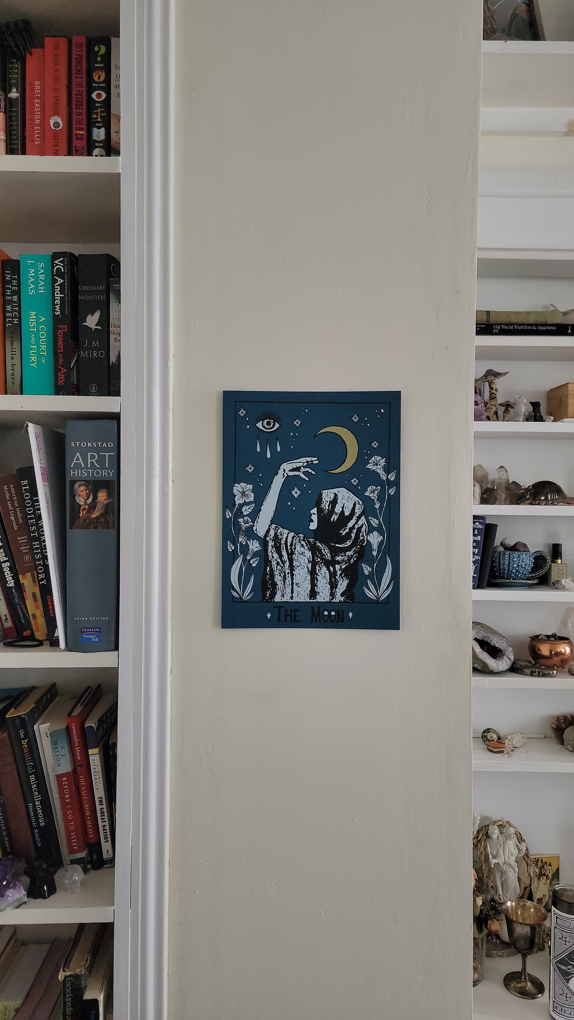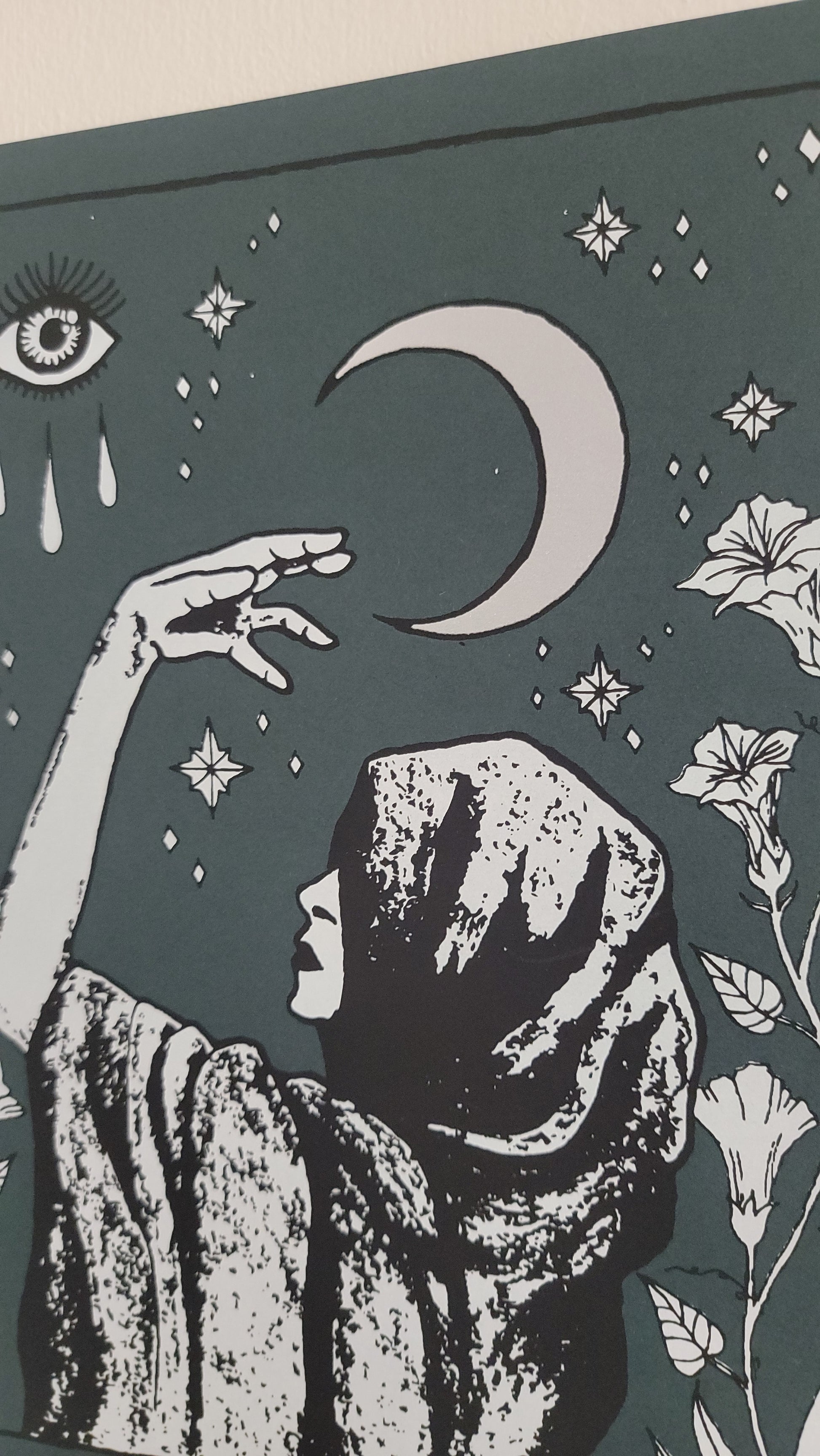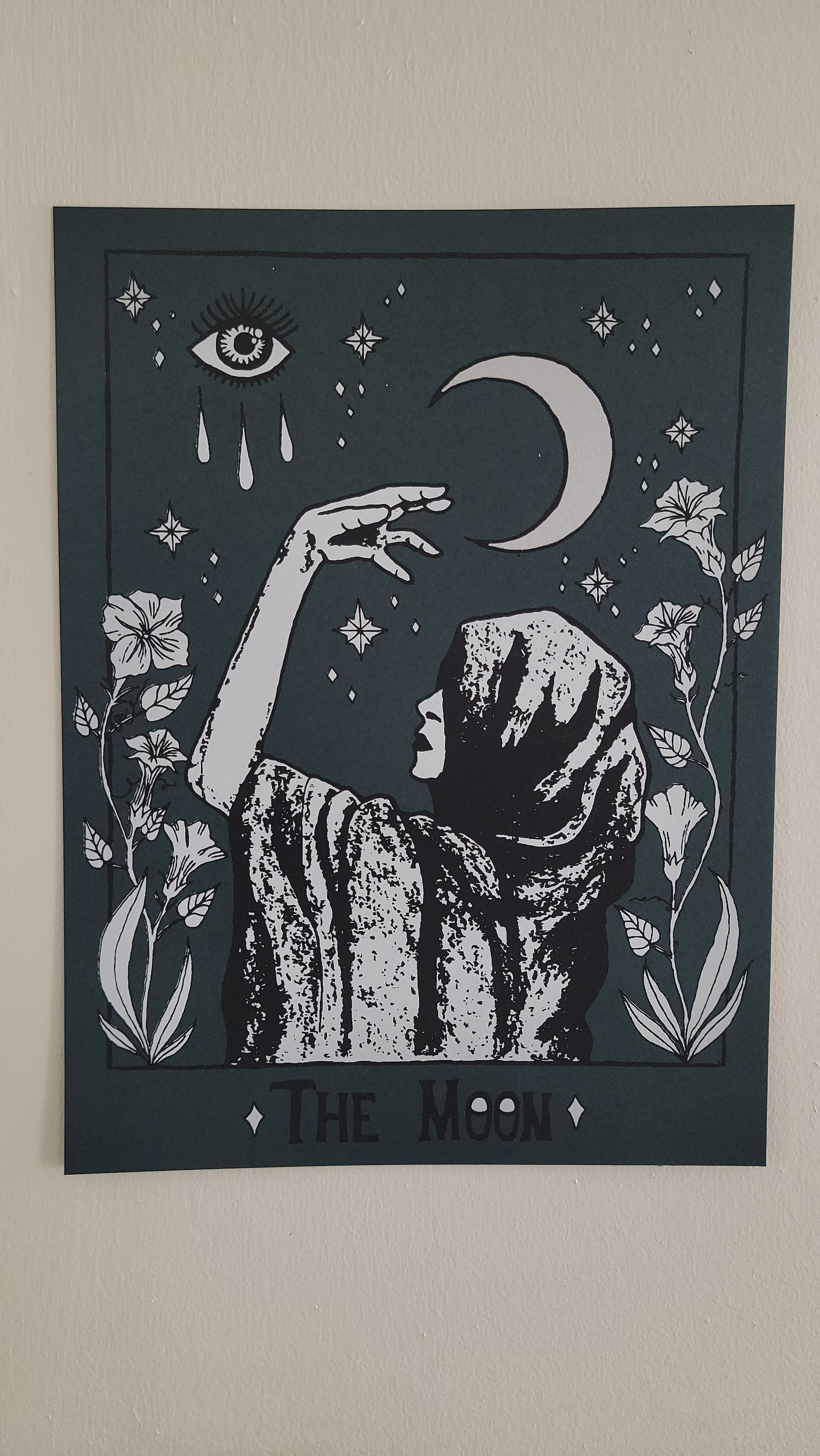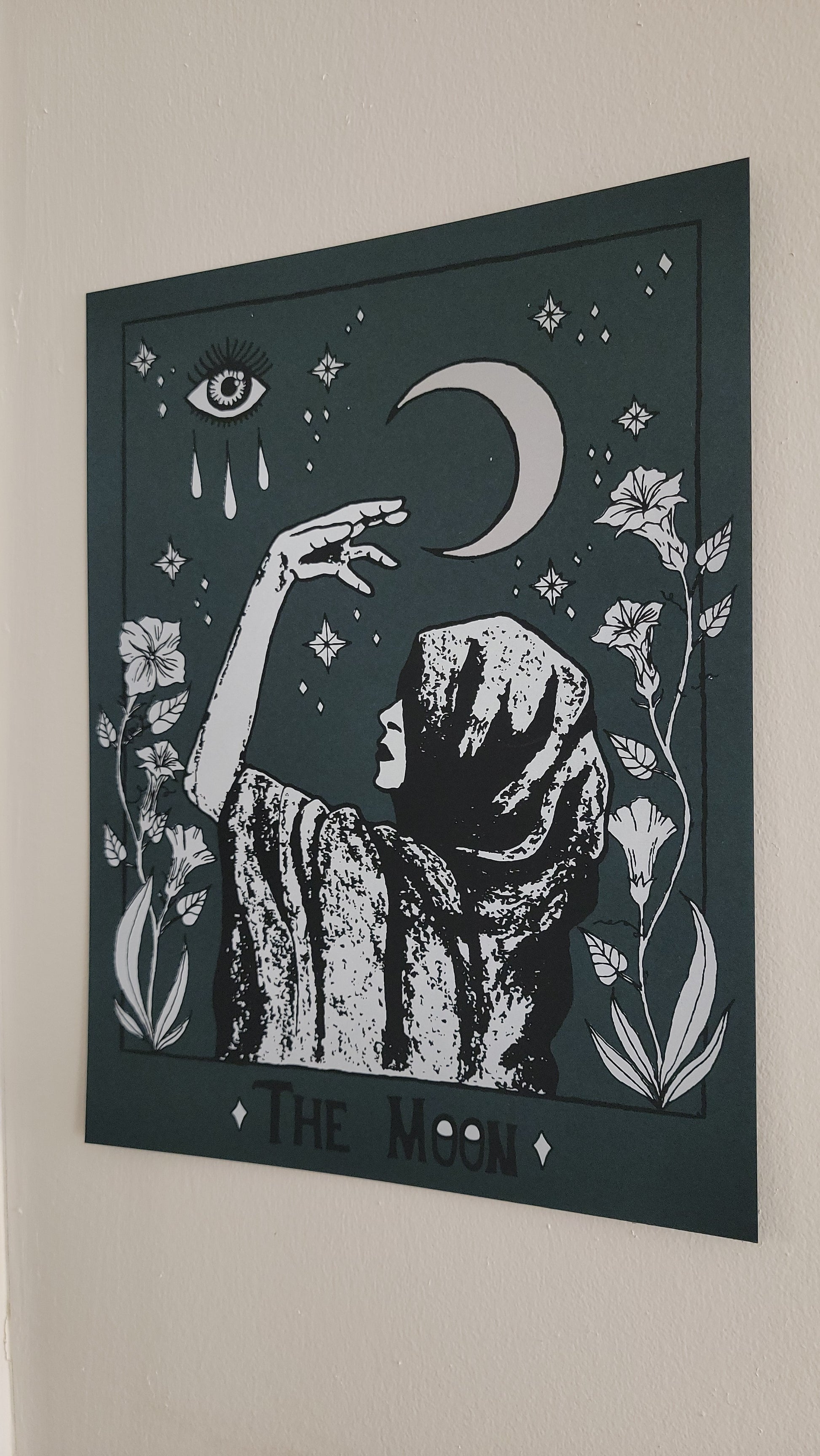Original "The Moon" drawing by myself that has been screen printed by atmosphere print co. These are limited stock, because much like my own work, all of these prints are done by hand! Each print features the original drawing and a metallic moon that glimmers.