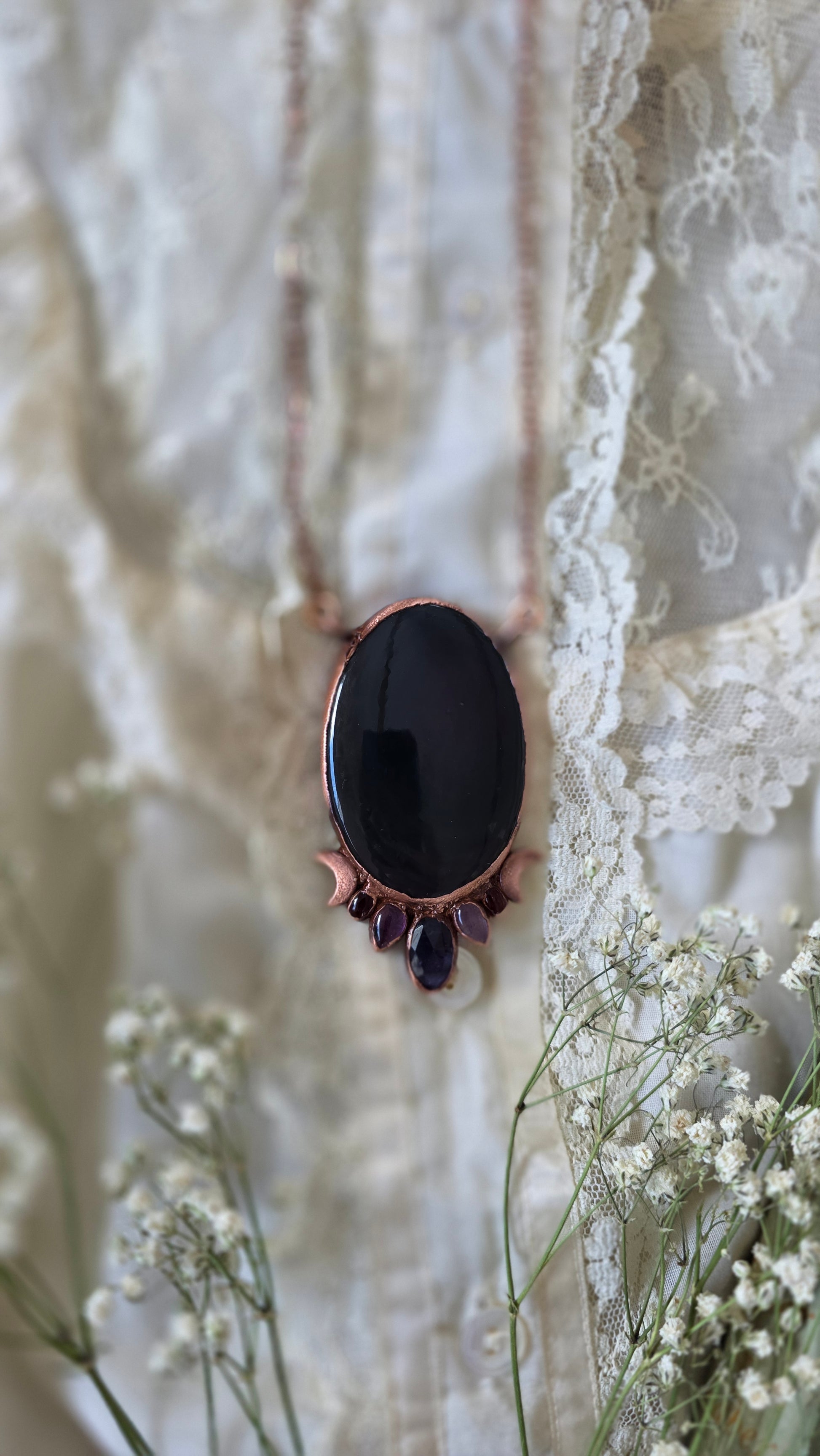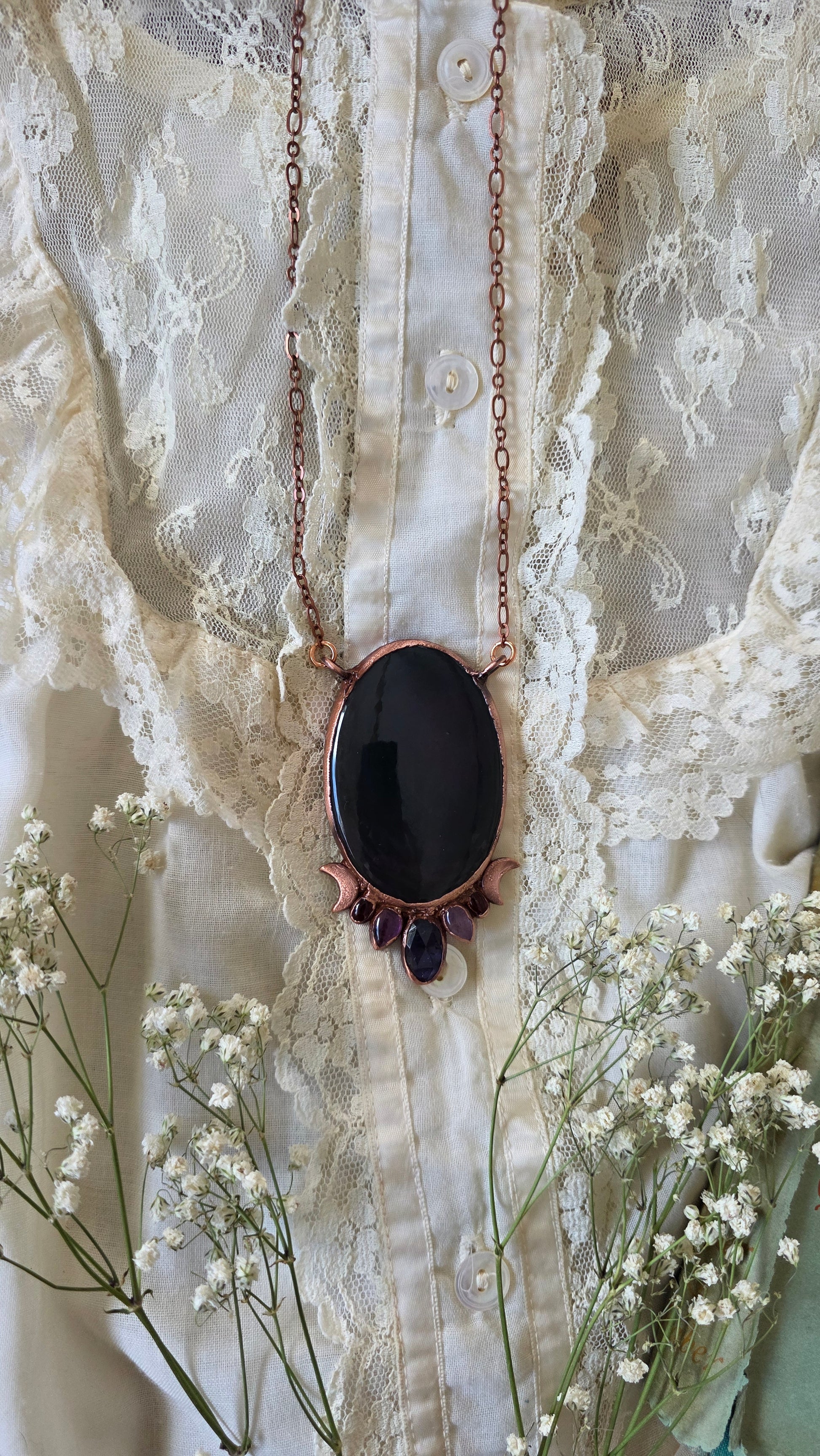 Protective Rainbow Obsidian, truth speaking kyanite, peaceful amethyst, and grounding garnet. Brought together to make this powerful piece that's symbolic of all the things we wish to have protective energy over as we emerge on our own journey of transformation and truth. This is made with copper using a technique known as electroforming which has been darkened with a patina to give it an antiqued look, and this comes on 24" of antiqued copper chain with a simple clasp. If you have any questions or concerns about this piece please contact me before purchasing thank you!