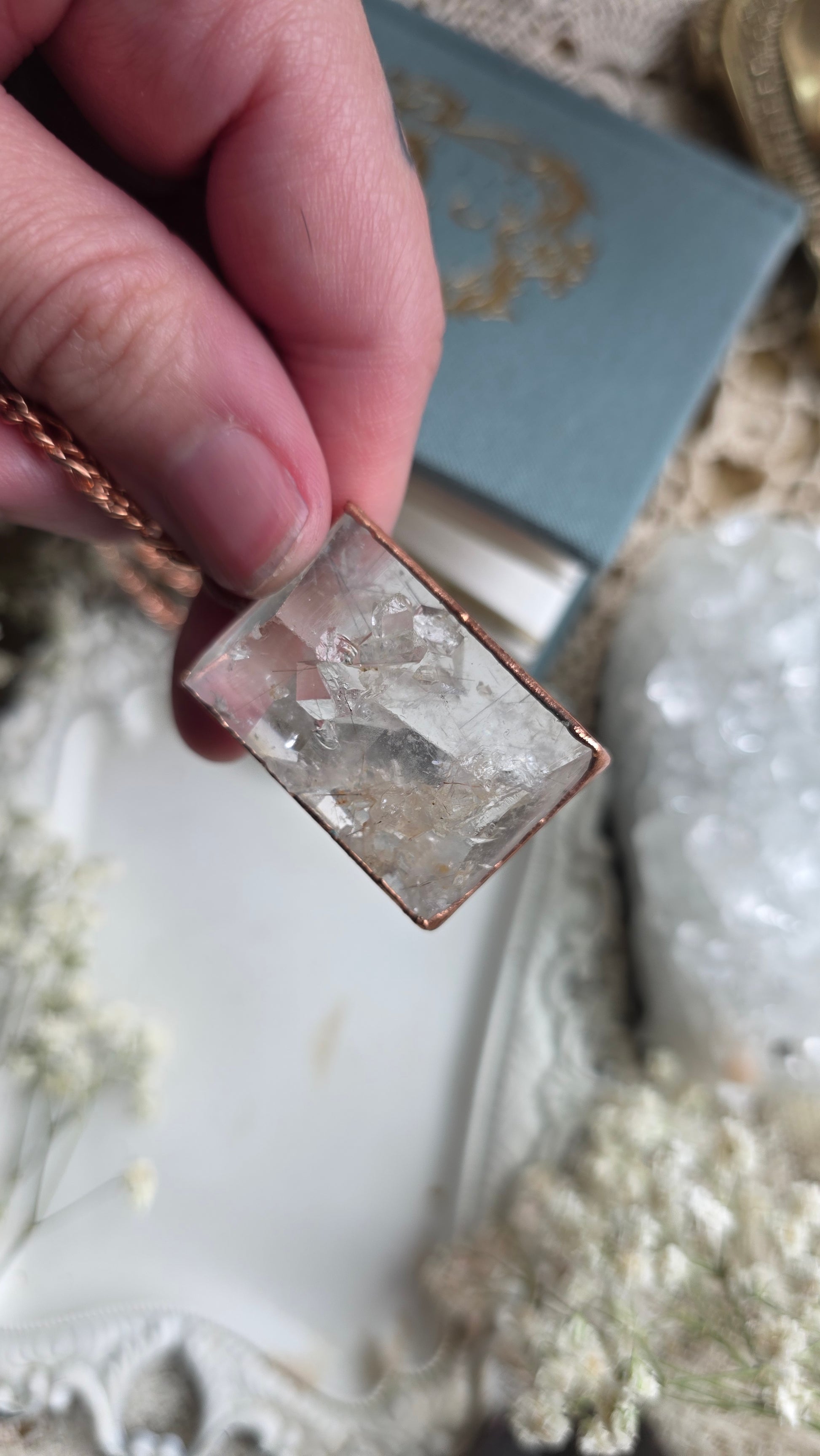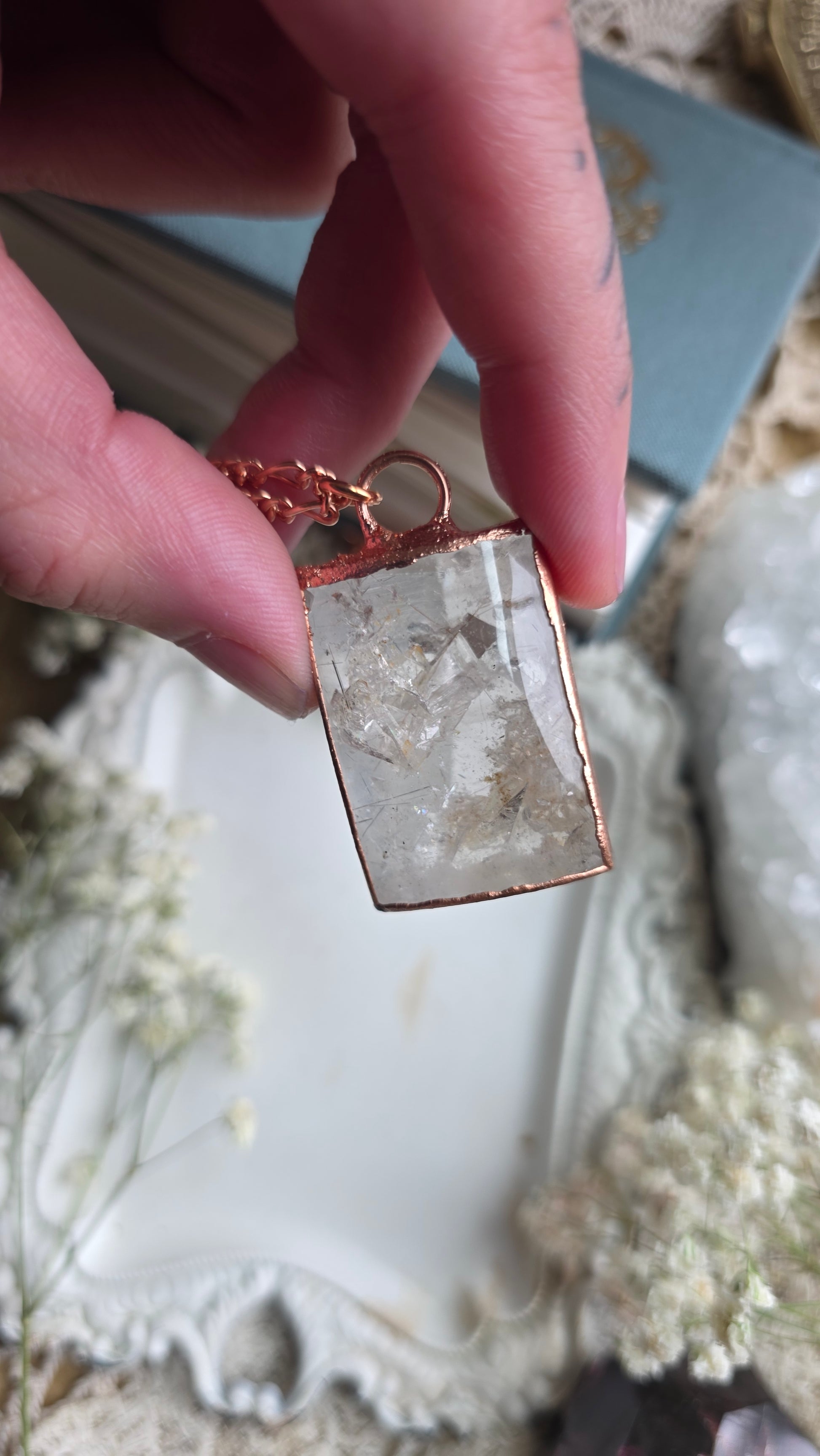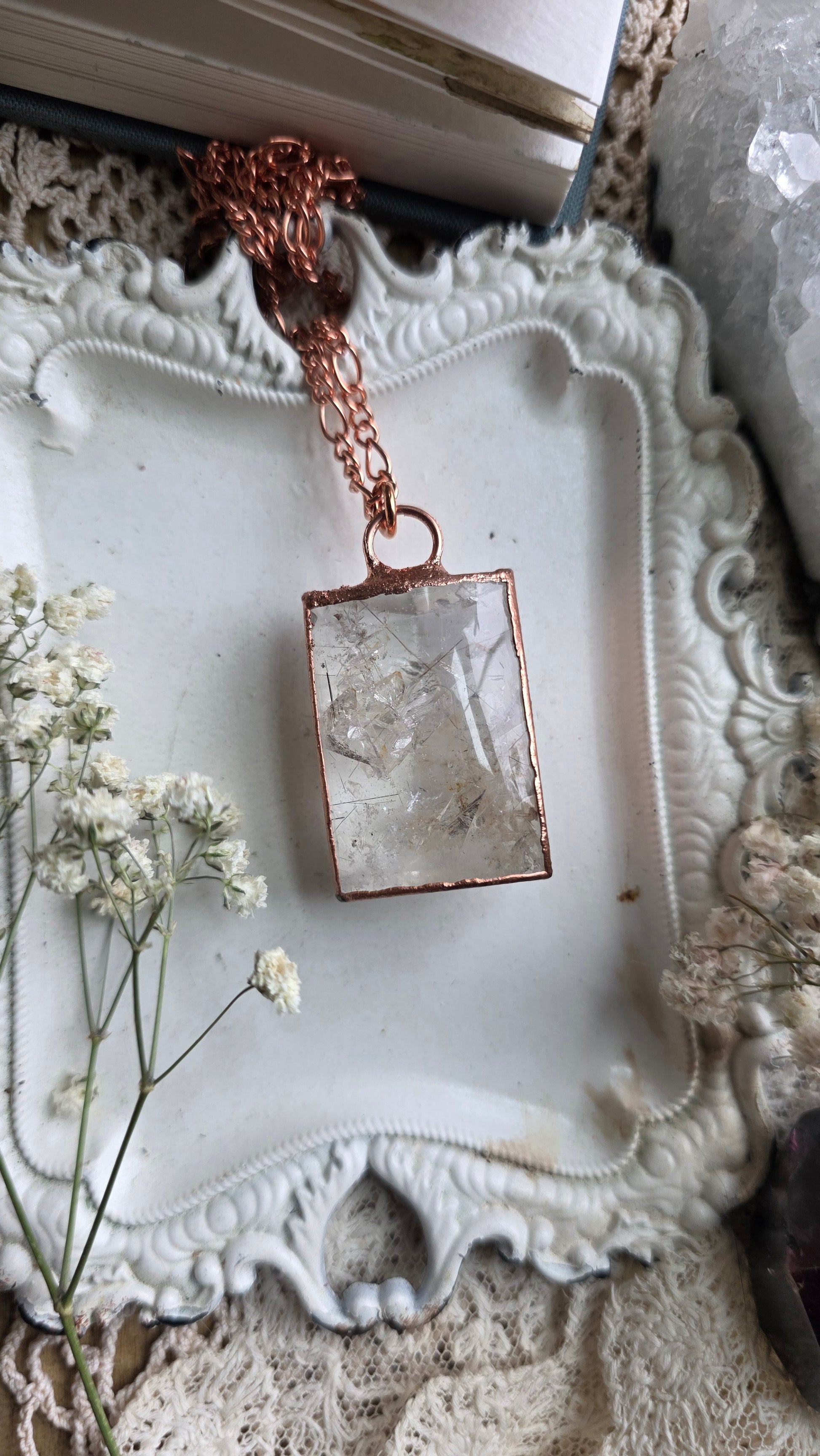 A beautiful Manifestation Quartz A grade cabochon set in copper using a technique known as electroforming.  The copper has been left shiny and paired with a bright 18"copper chain with a simple clasp.  If you have any questions or concerns about this piece please contact me before purchasing thank you!