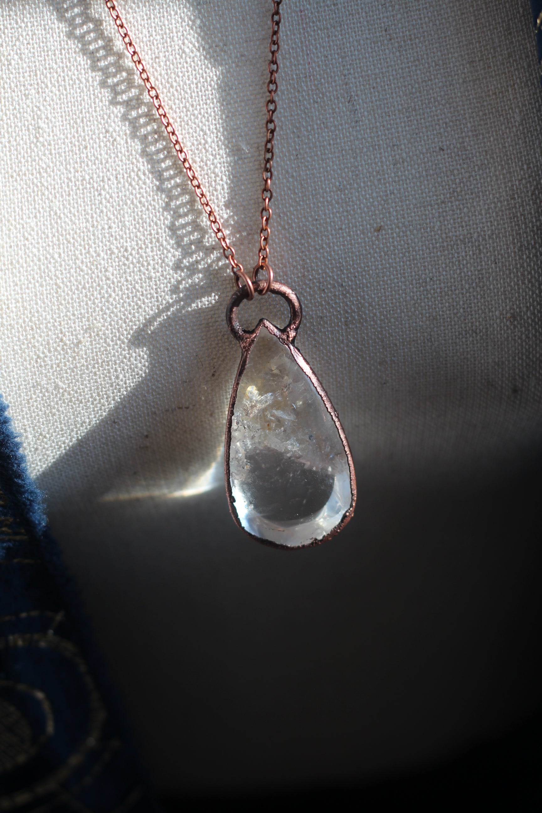A beautiful Manifestation Quartz set in copper using a technique known as electroforming. The copper on this piece has been darkened with a patina to give it an antiqued look and this comes on 24" of antiqued copper chain with a simple clasp. If you have any questions or concerns about this piece please contact me before purchasing thank you!