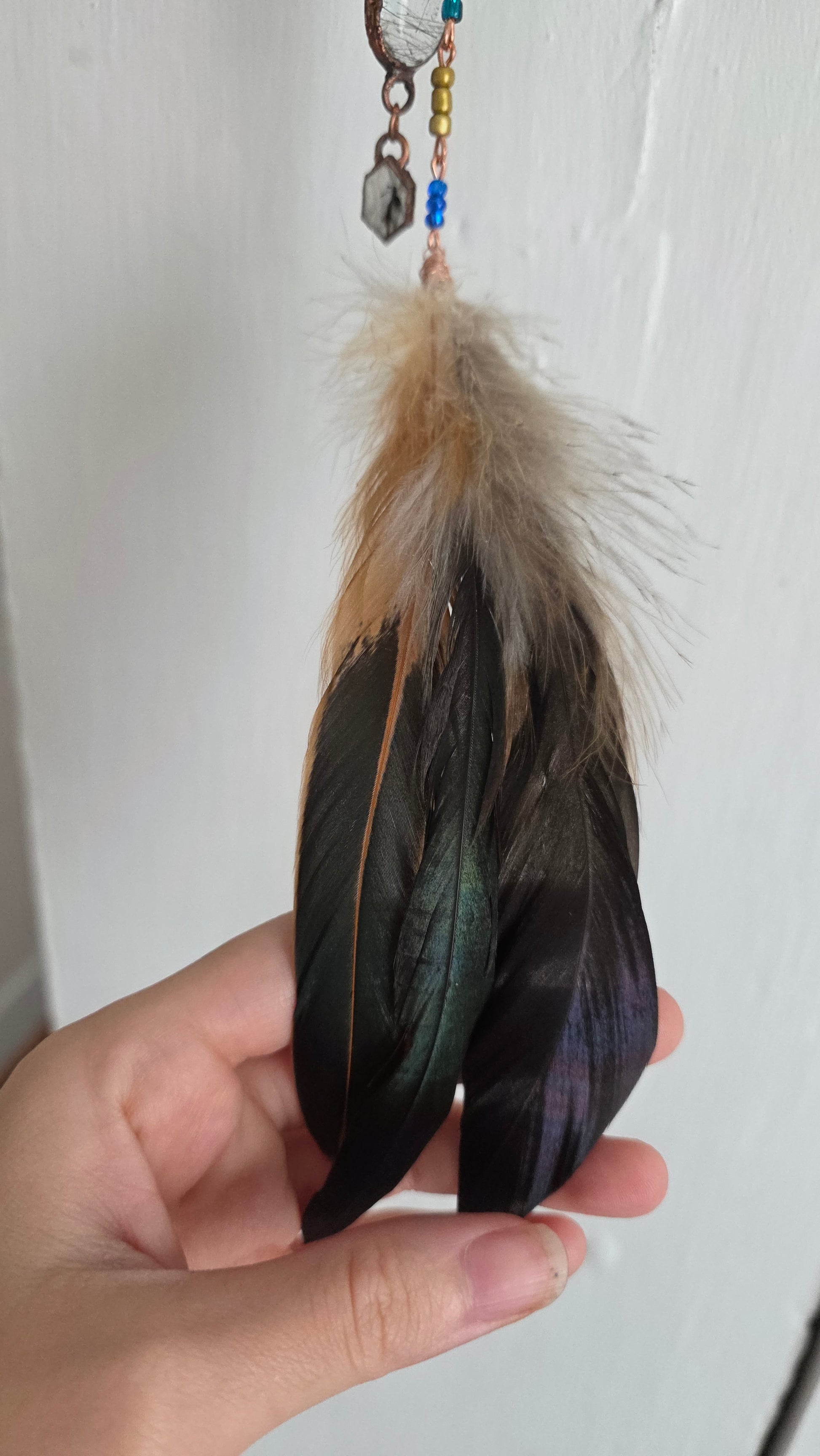 A hand sculpted crescent moon guardian made out of polymer clay and painted with acrylic. This has been finished with an electroformed tourmalinated quartz cabochon and hexagon, feathers, and bead accents. For decorative purposes only, please keep out of reach of children and pets as pieces can be considered a choking hazard. If you have any questions or concerns please contact me before purchasing thank you!
