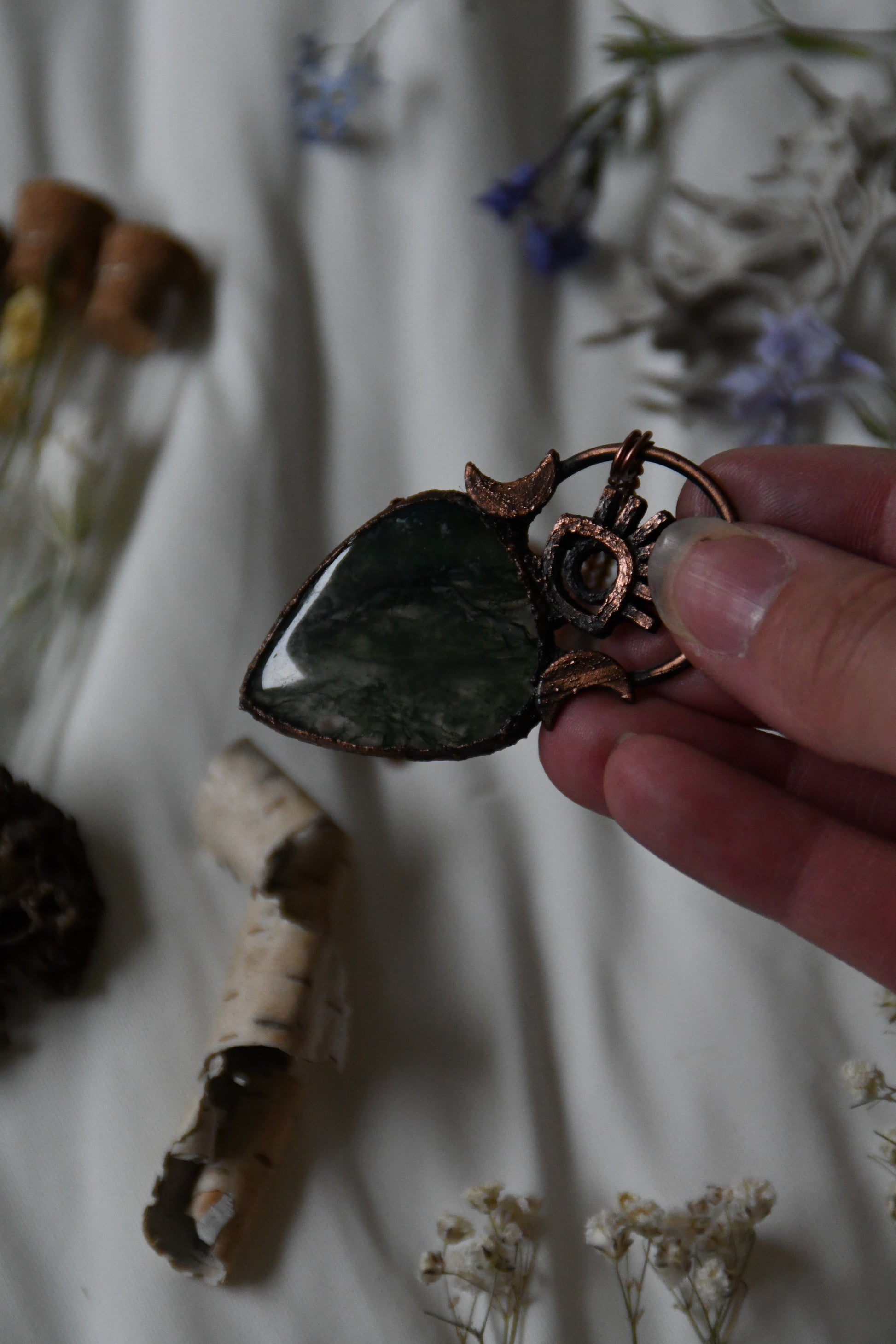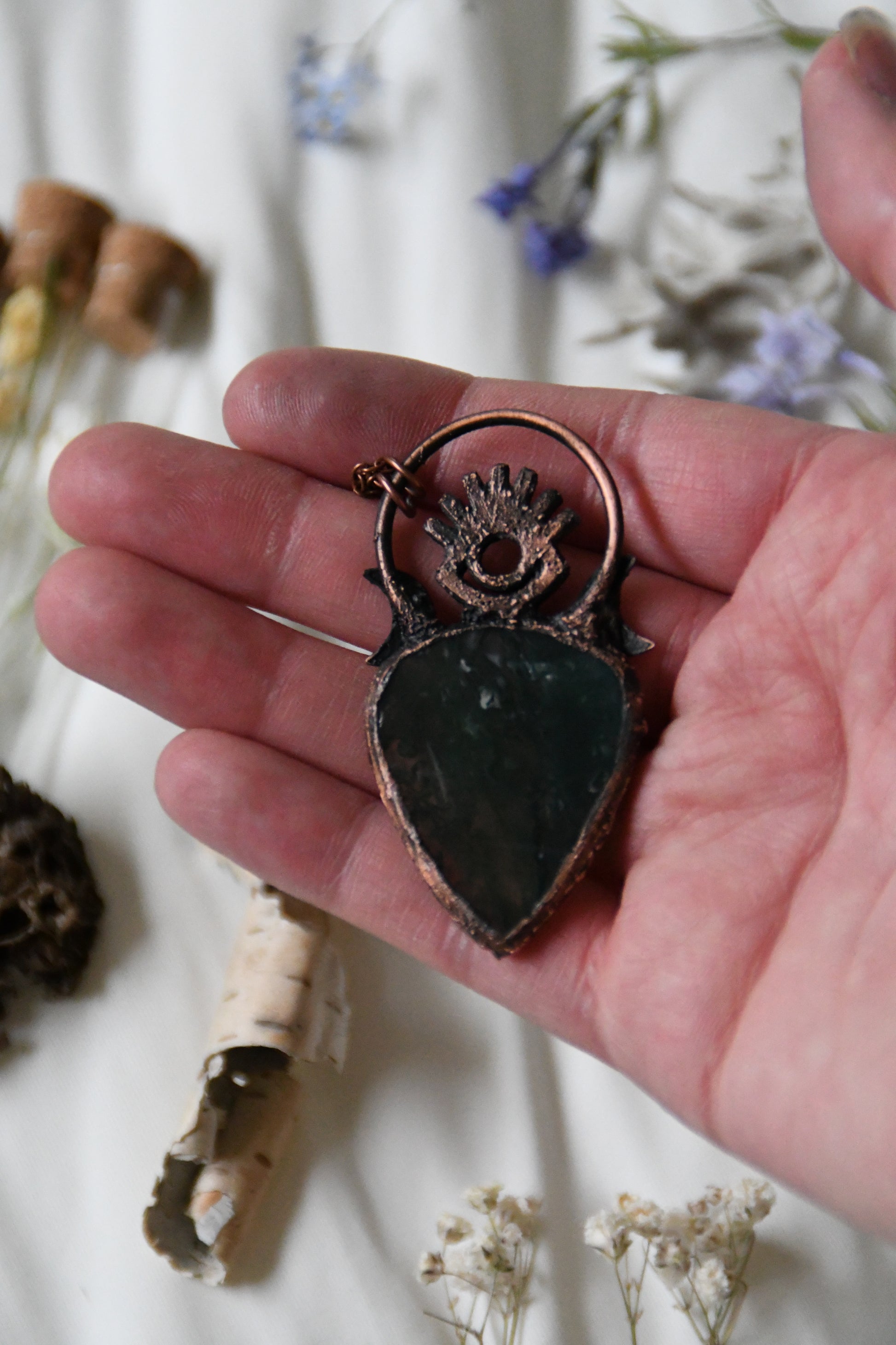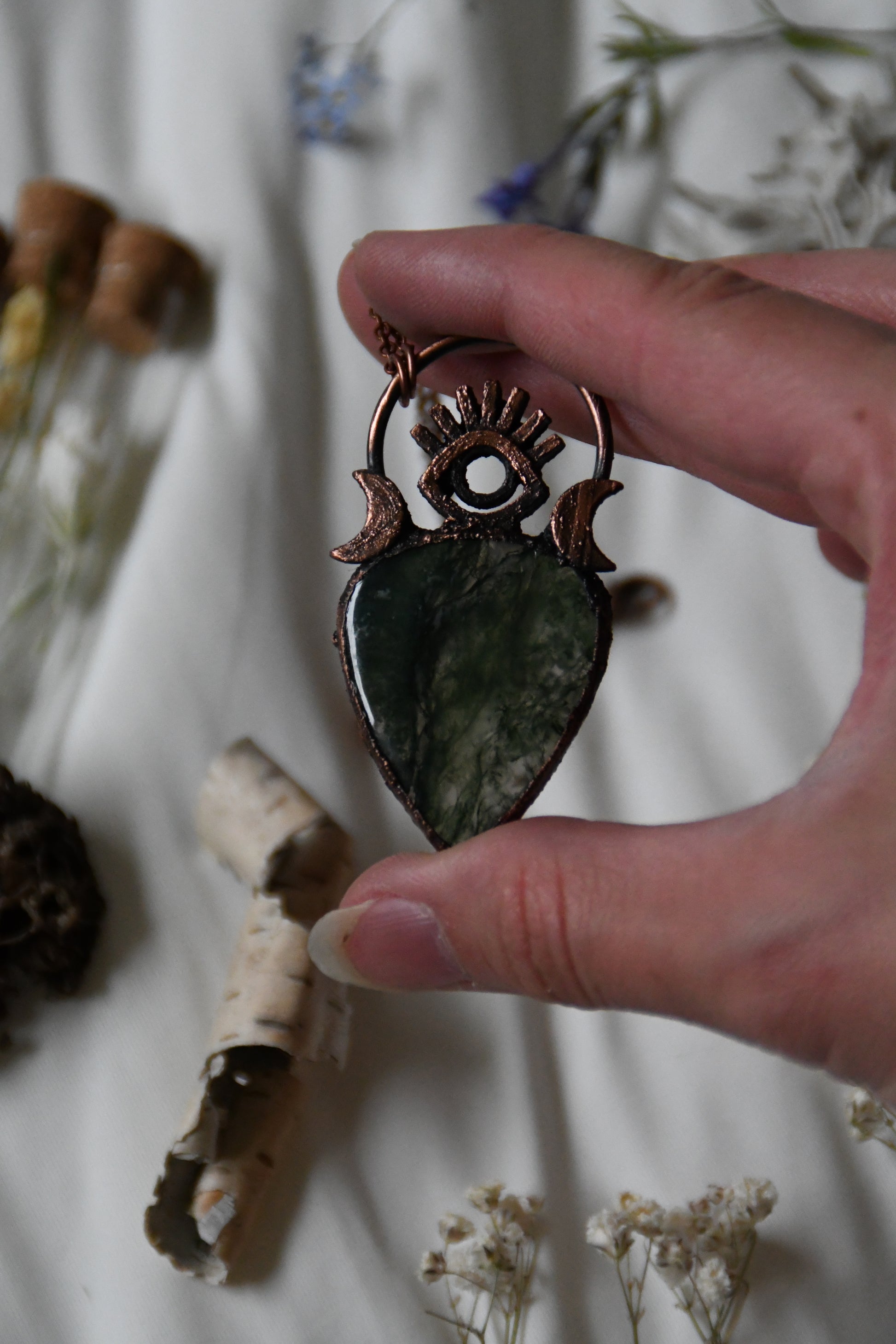 A gorgeous forest green moss agate cabochon, paired with a 3d printed protective eye design and moons, set in copper using a technique known as electroforming. The copper on this piece has been darkened with a patina to give it an antiqued look and this comes on 24" of antiqued copper chain with a simple clasp. If you have any questions or concerns about this piece please contact me before purchasing thank you!