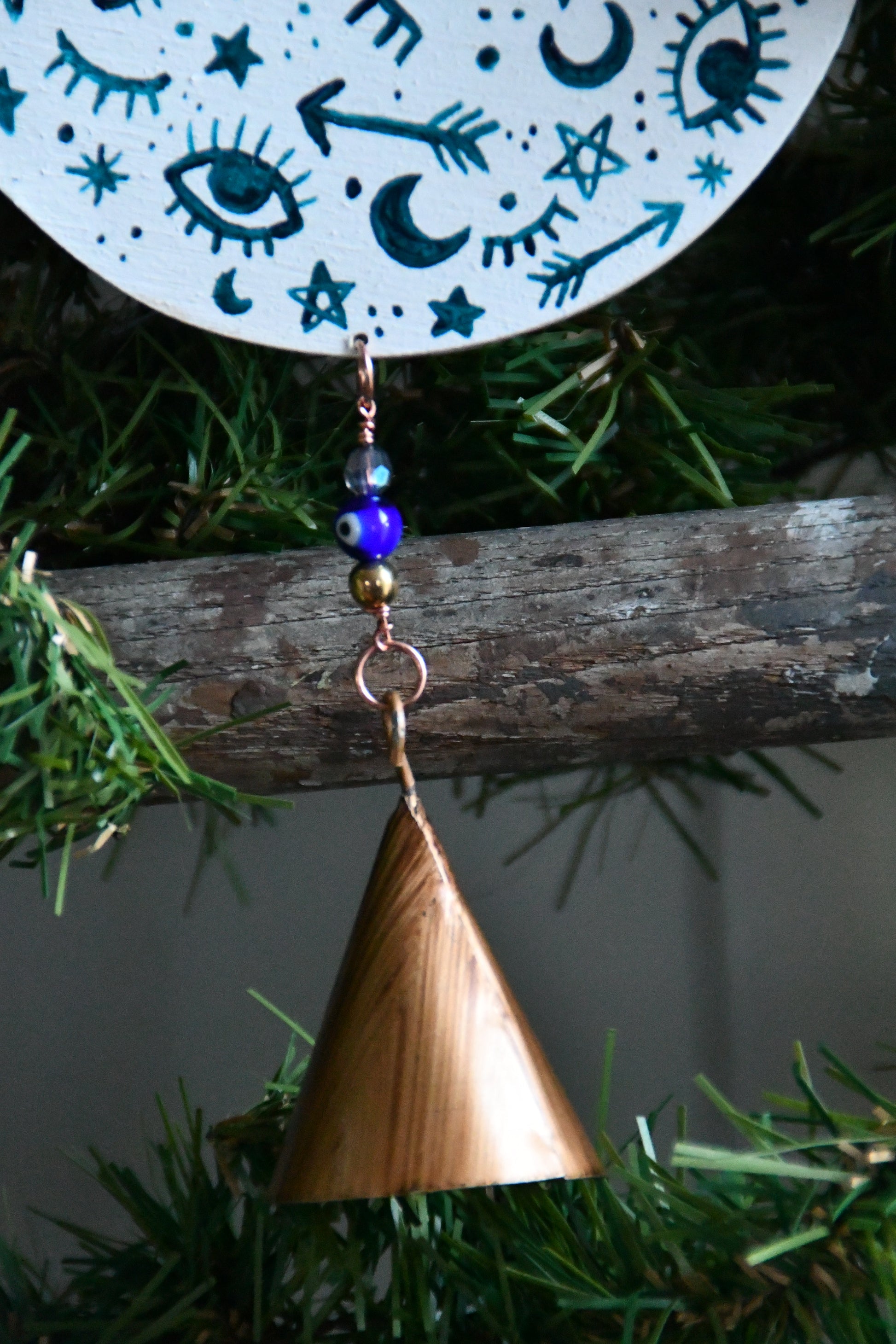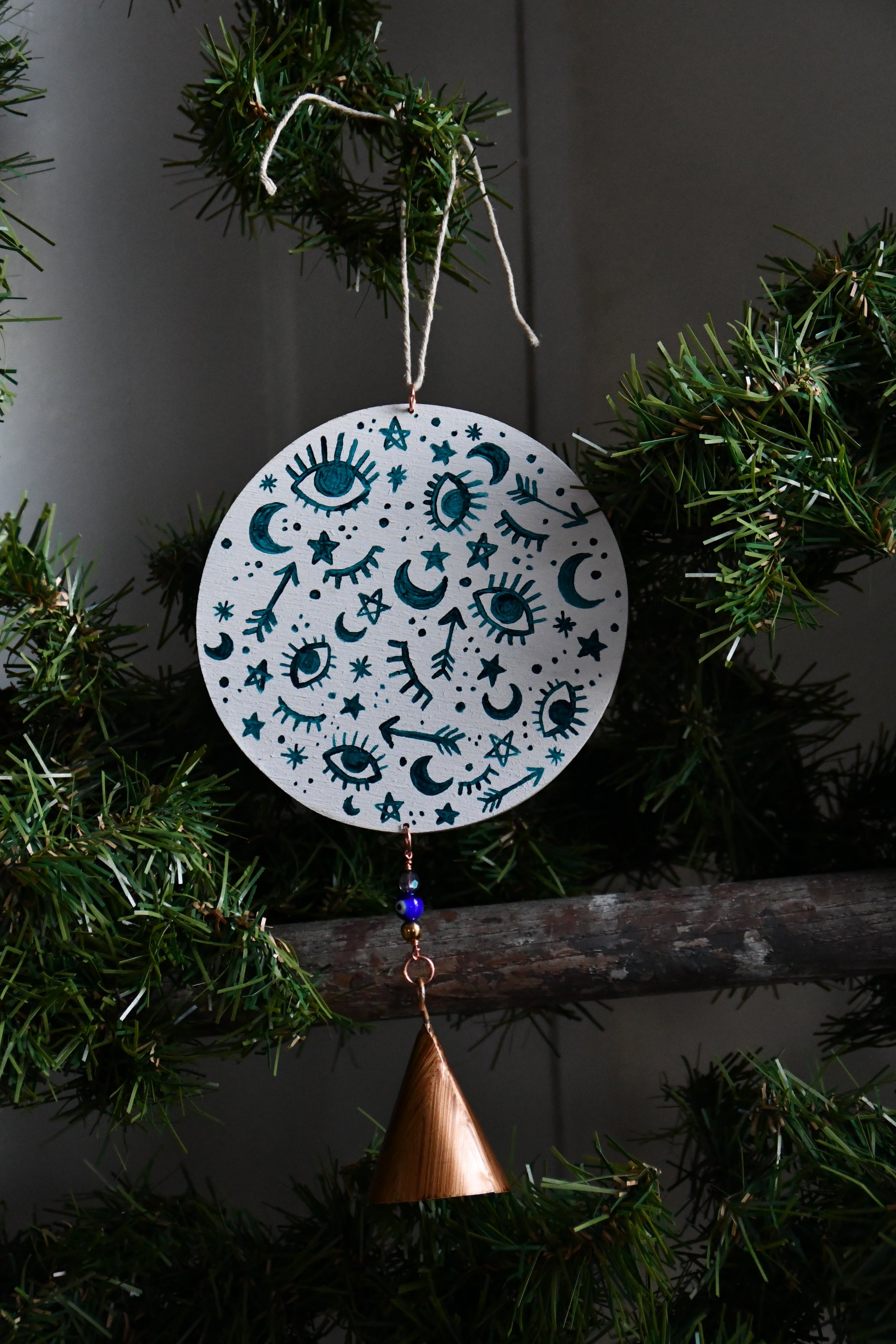 A hand painted wooden ornament done in acrylic paint featuring a collage of protective eye, moon and arrow imagery, and adorned with beads and a bell. Dimensions for the wooden ornament part are 4.5" in diameter. The back and sides are painted a simple black and each one has an xtwii signature. These are decor purposes only please keep out of reach of children and pets!