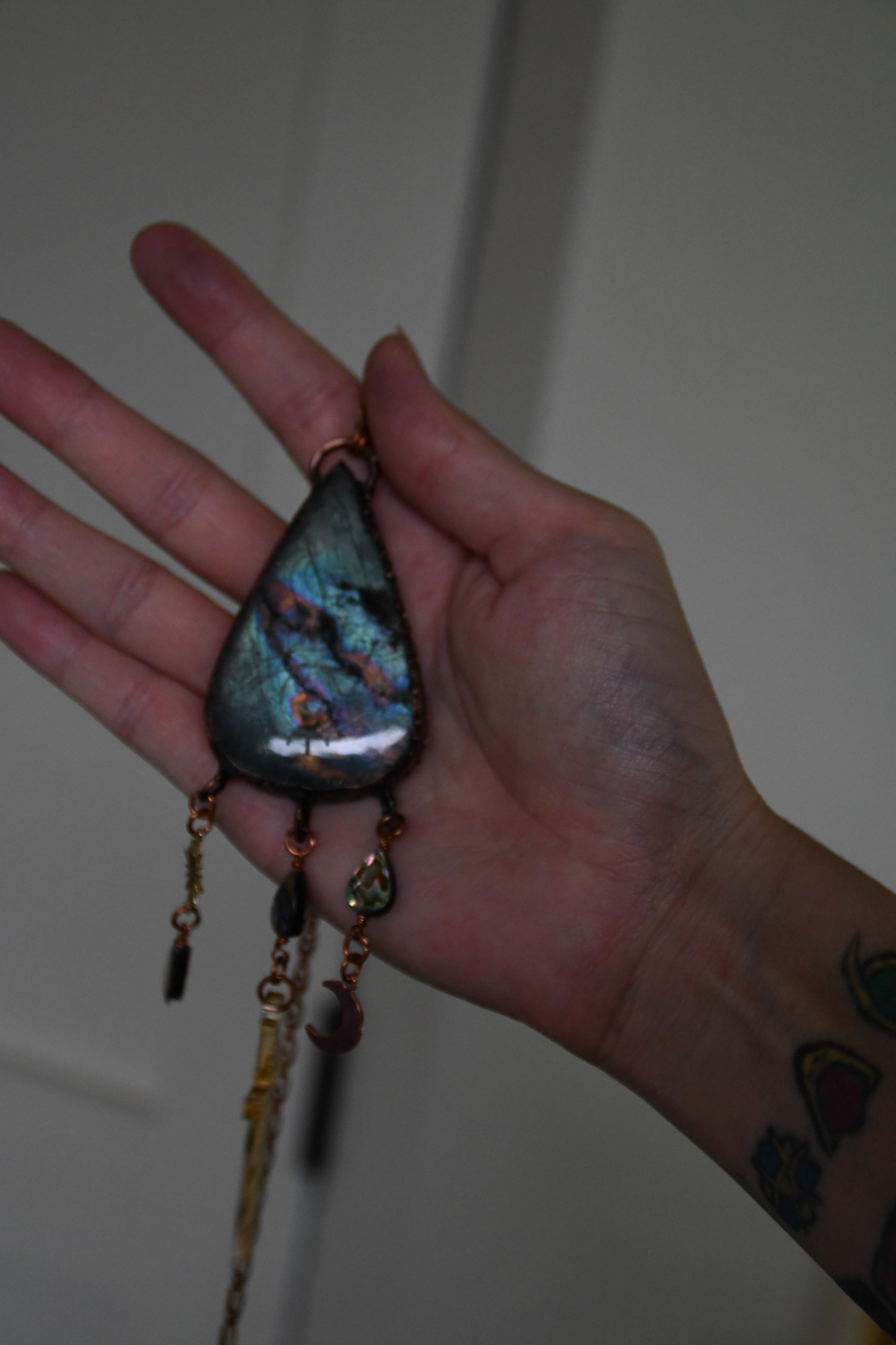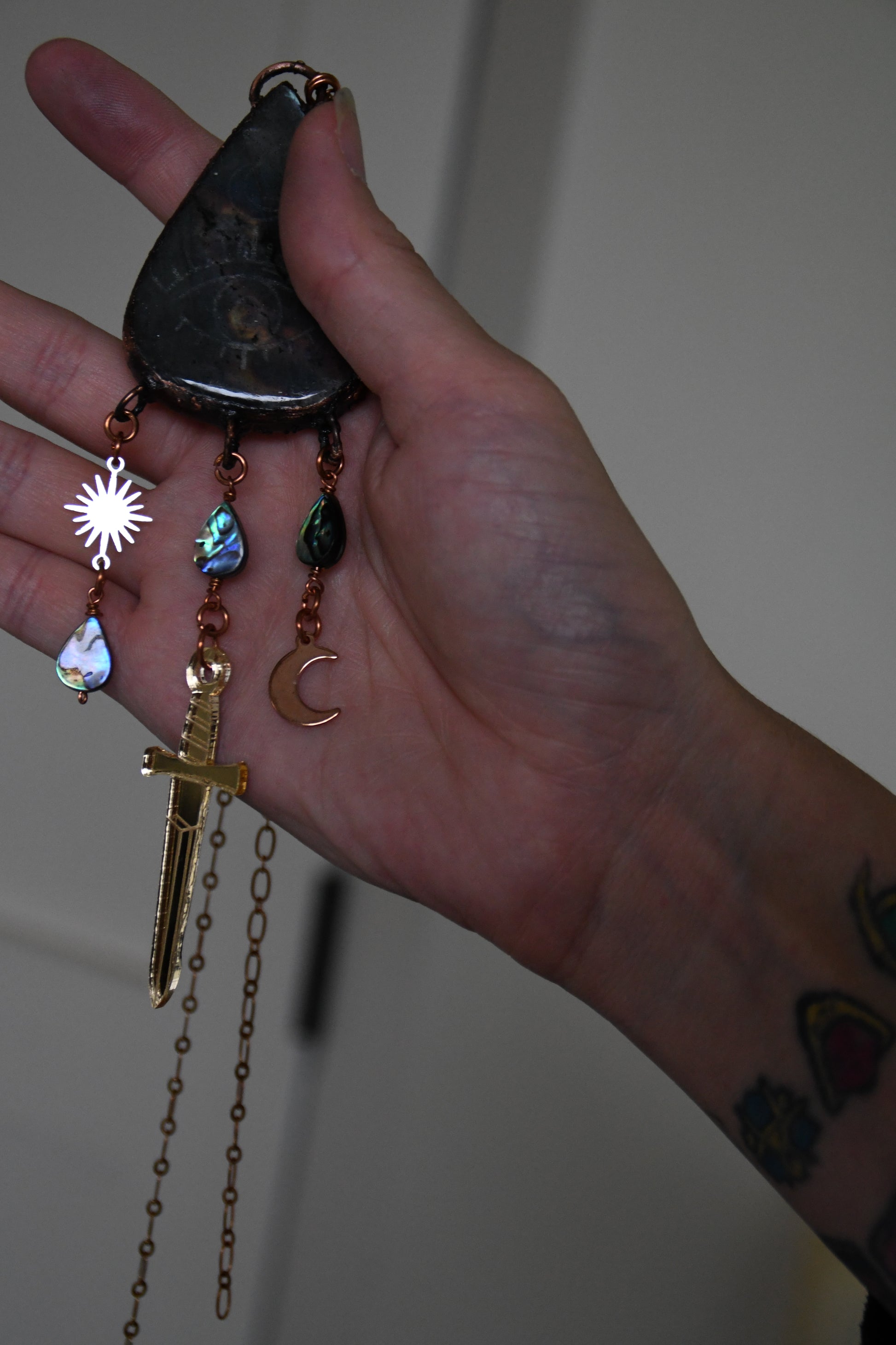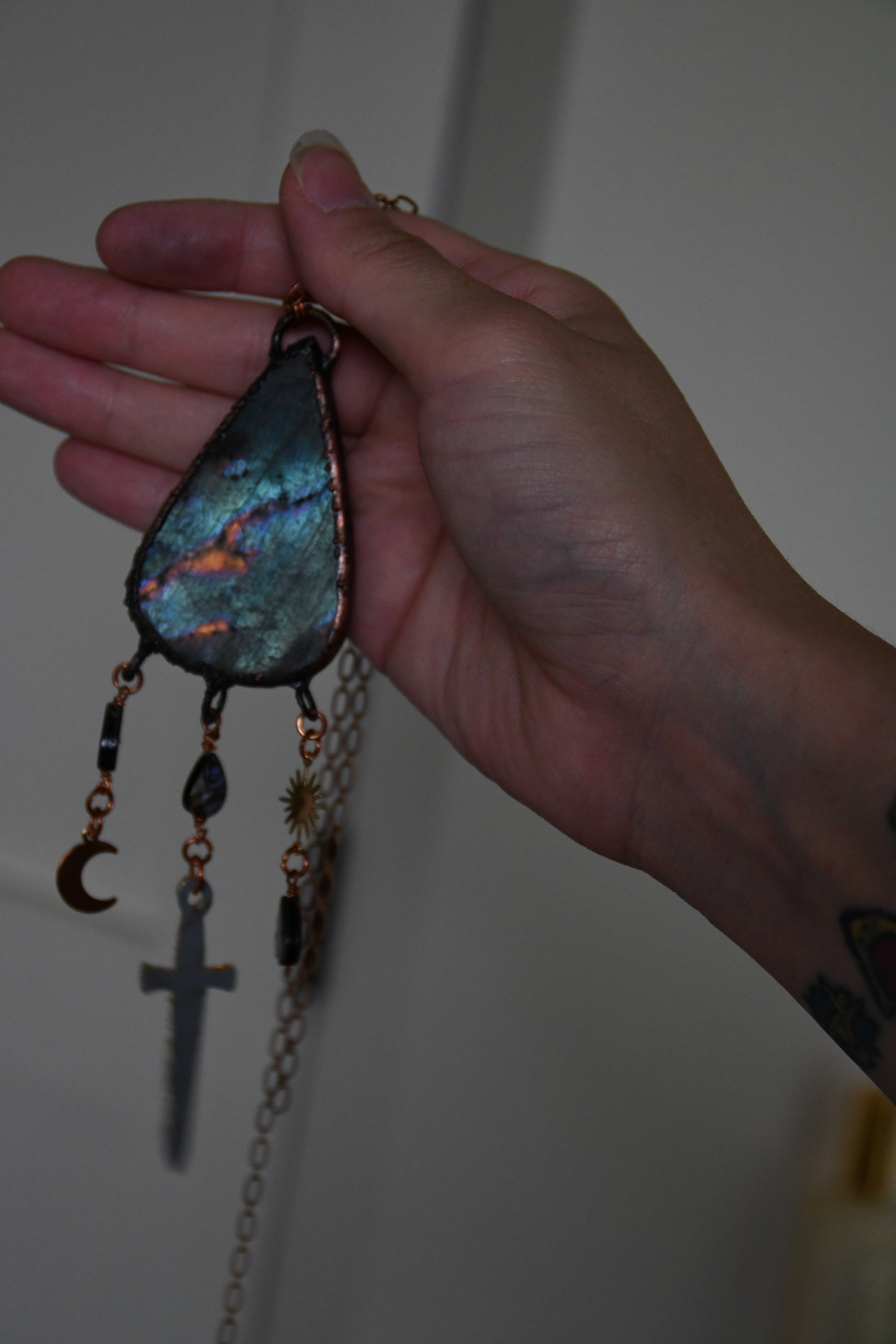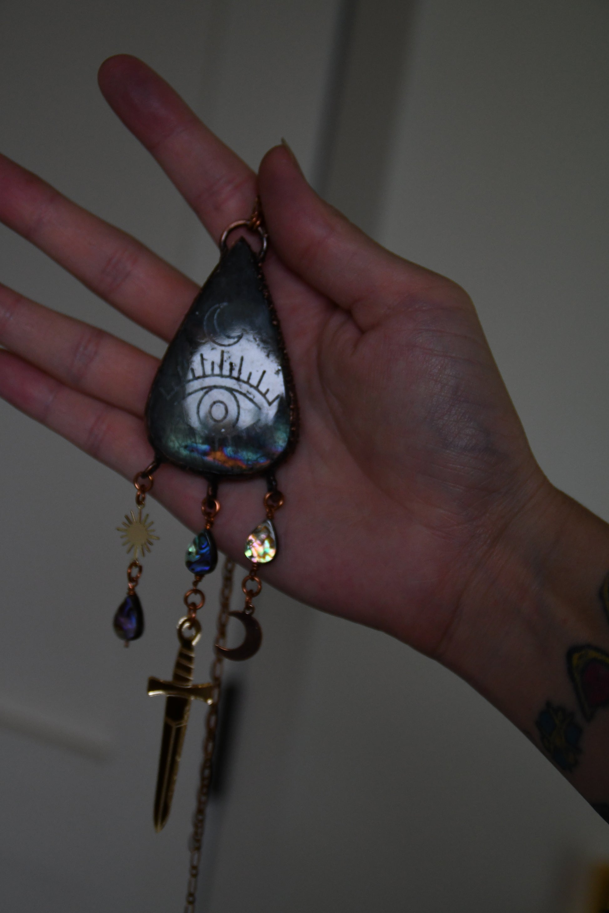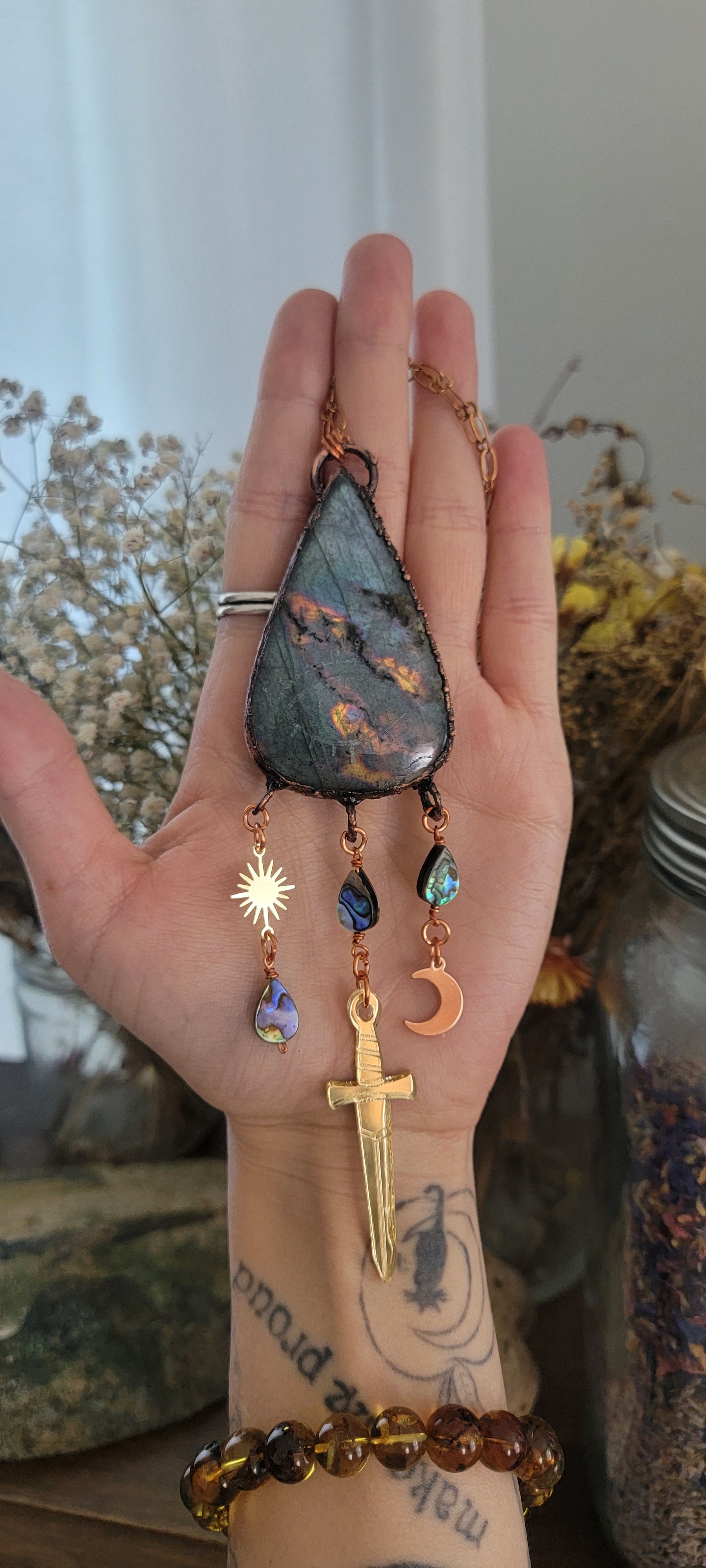 A beautiful protective eye engraved labradorite with flashes of blue and orange, set in copper using a technique known as electroforming. From the bottom hangs abalone tear drops, moon and sun brass accents, and an acrylic mirror esque sword piece. This comes on 24" of brassy copper chain with a simple clasp. If you have any questions or concerns about this piece please contact me before purchasing thank you!
