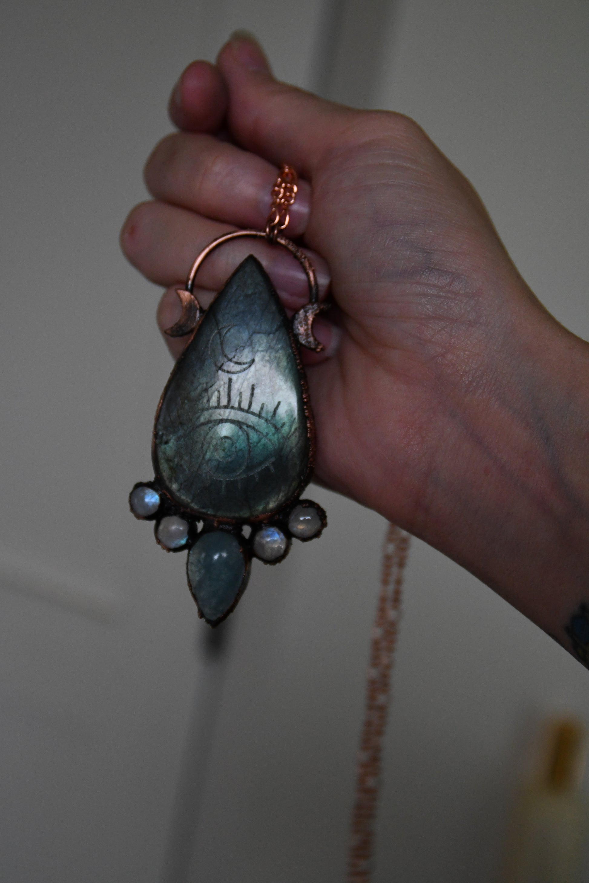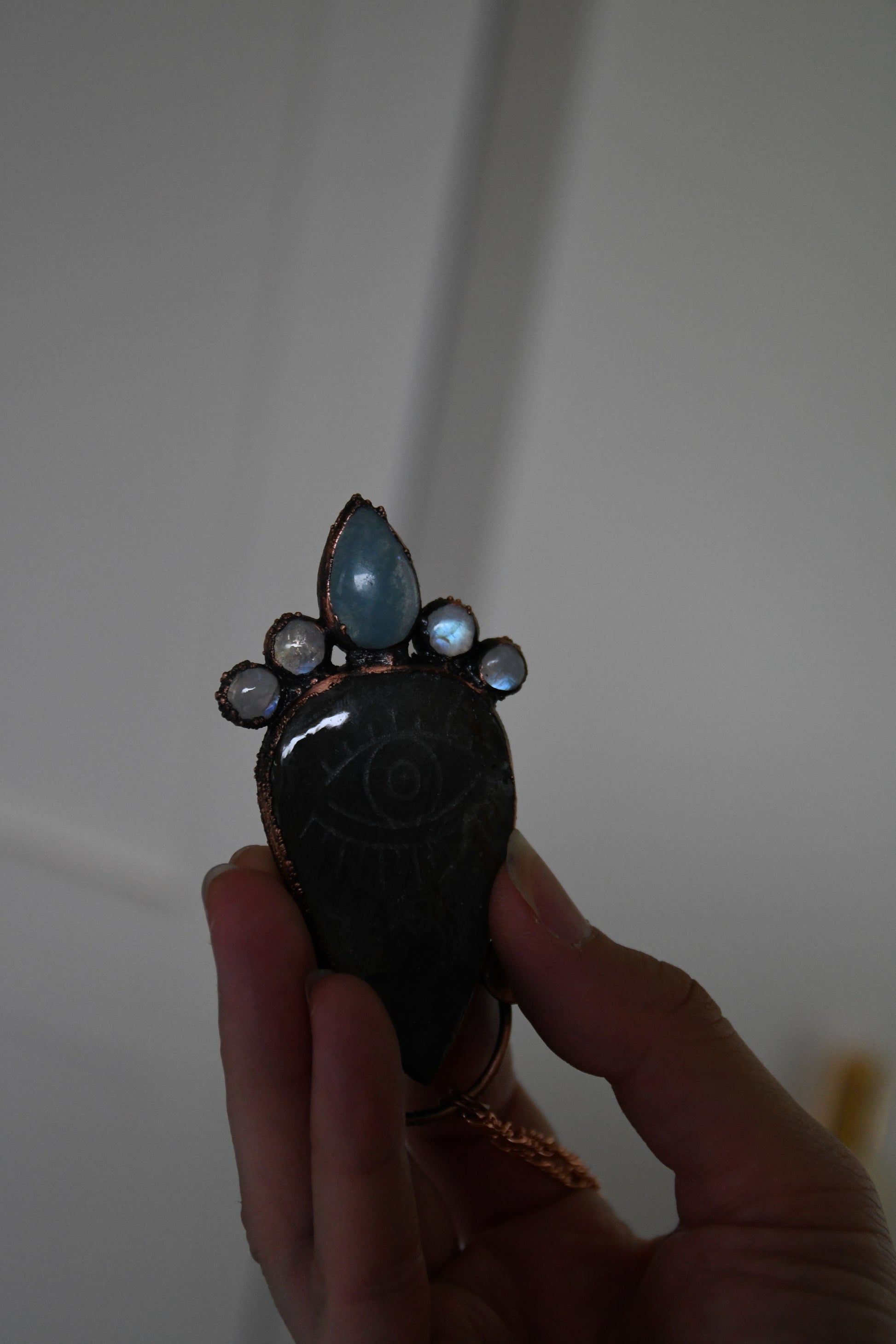 Protective Eye Engraved Labradorite with Aquamarine and Moonstone Copper Pendant
