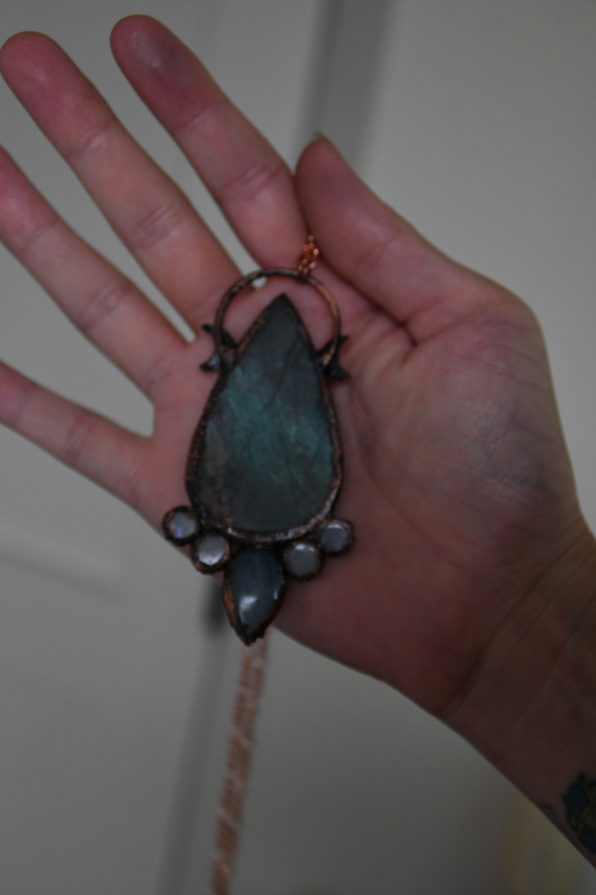 A beautiful sea green flash labradorite paired with aquamarine and moonstone, set in copper using a technique known as electroforming. The copper on this piece has been darkened with a patina to give it an antiqued look and this comes on 24" of bright brassy copper chain with a simple clasp to contrast. If you have any questions or concerns about this look please contact me before purchasing thank you!