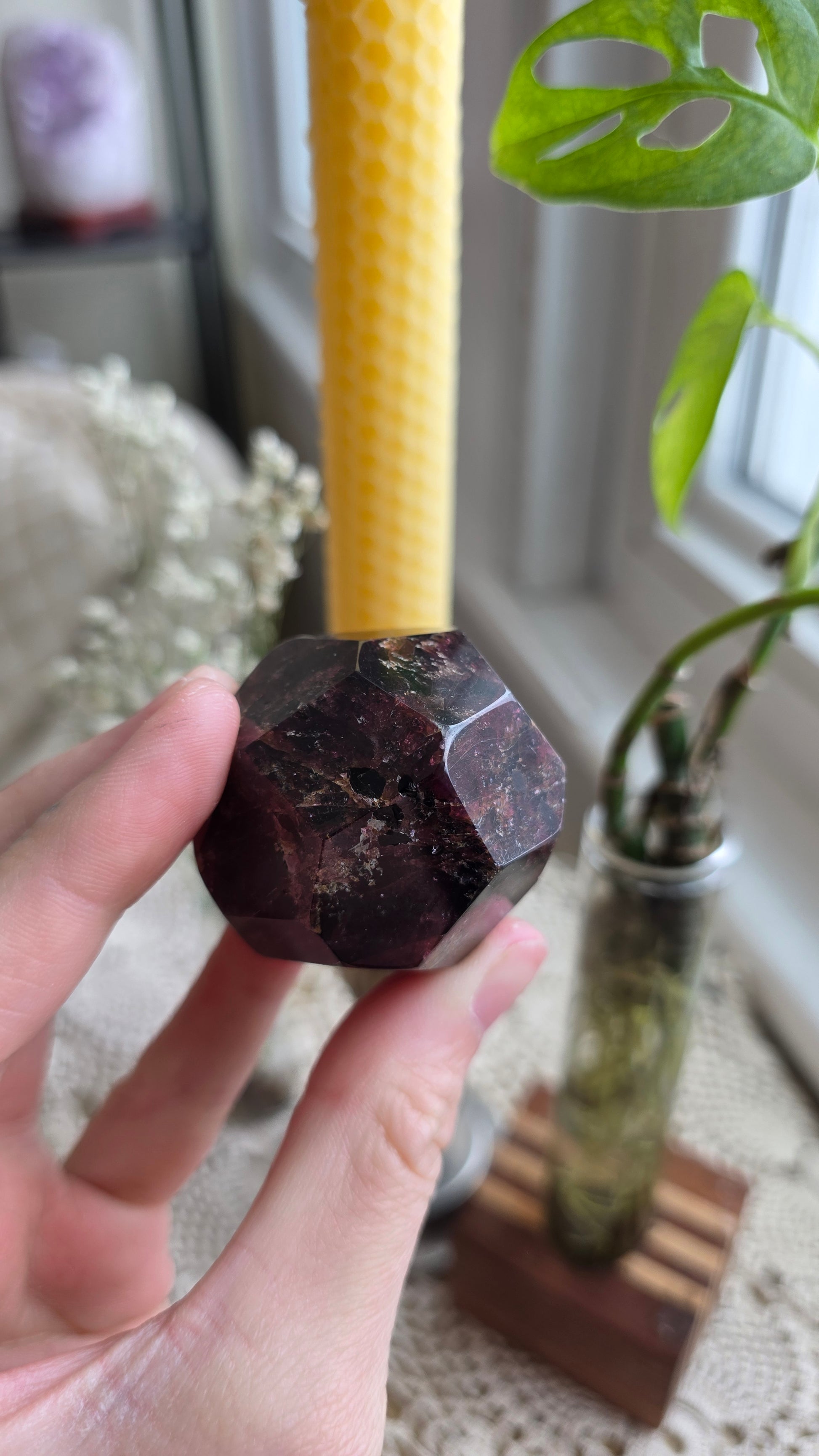 A beautiful raspberry garnet dodechahedron that has been polished on all sides with the most beautiful purple and red gemmy hues. My supplier found one pocket of these special little beings last year, and I was able to secure them during the gem show with all the enthusiasm for my love of garnet!