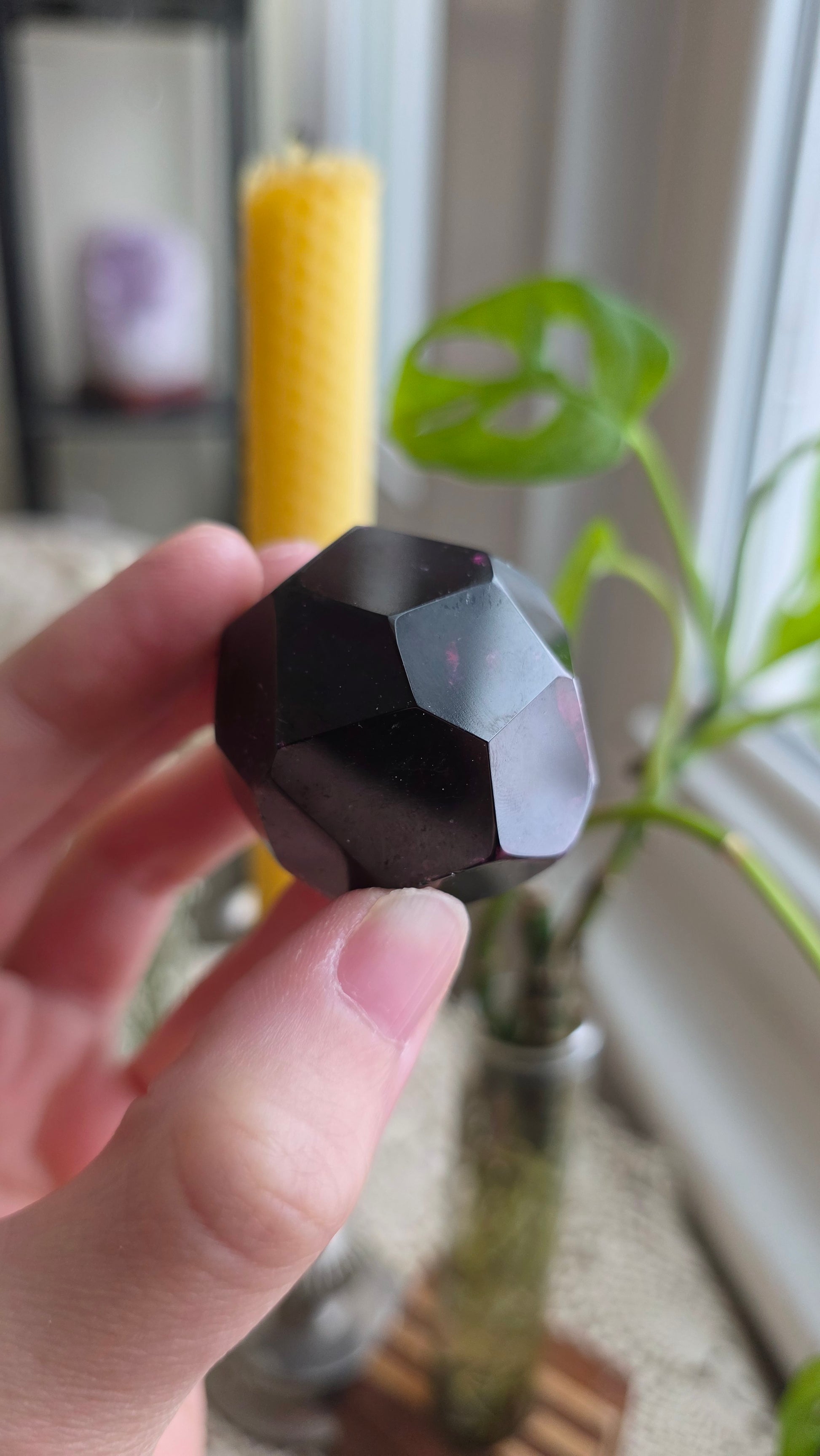 A beautiful raspberry garnet dodechahedron that has been polished on all sides with the most beautiful purple and red gemmy hues. My supplier found one pocket of these special little beings last year, and I was able to secure them during the gem show with all the enthusiasm for my love of garnet!