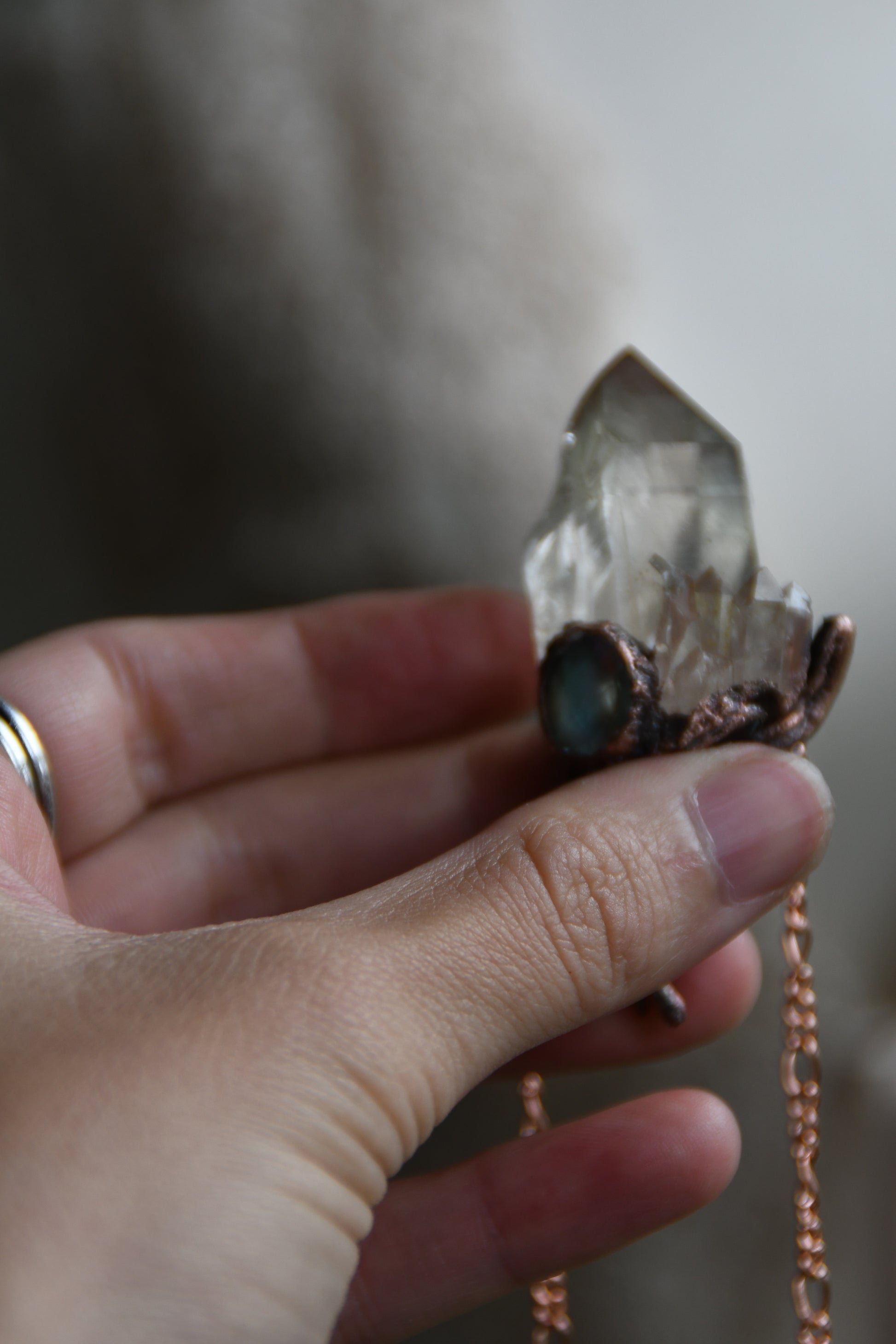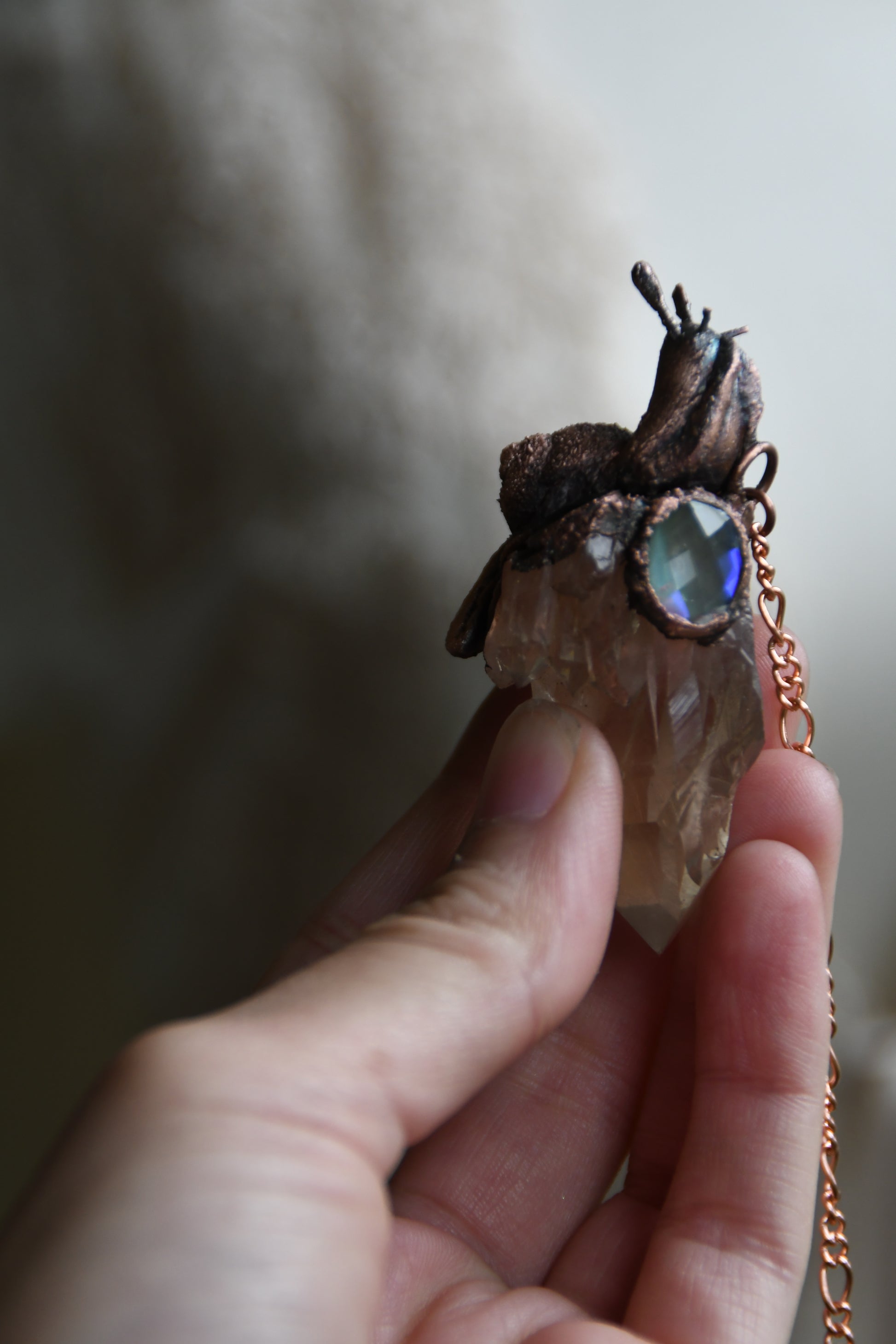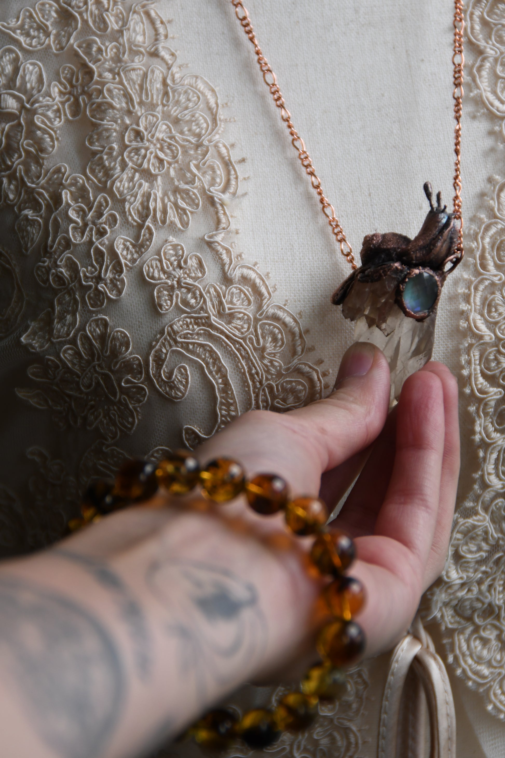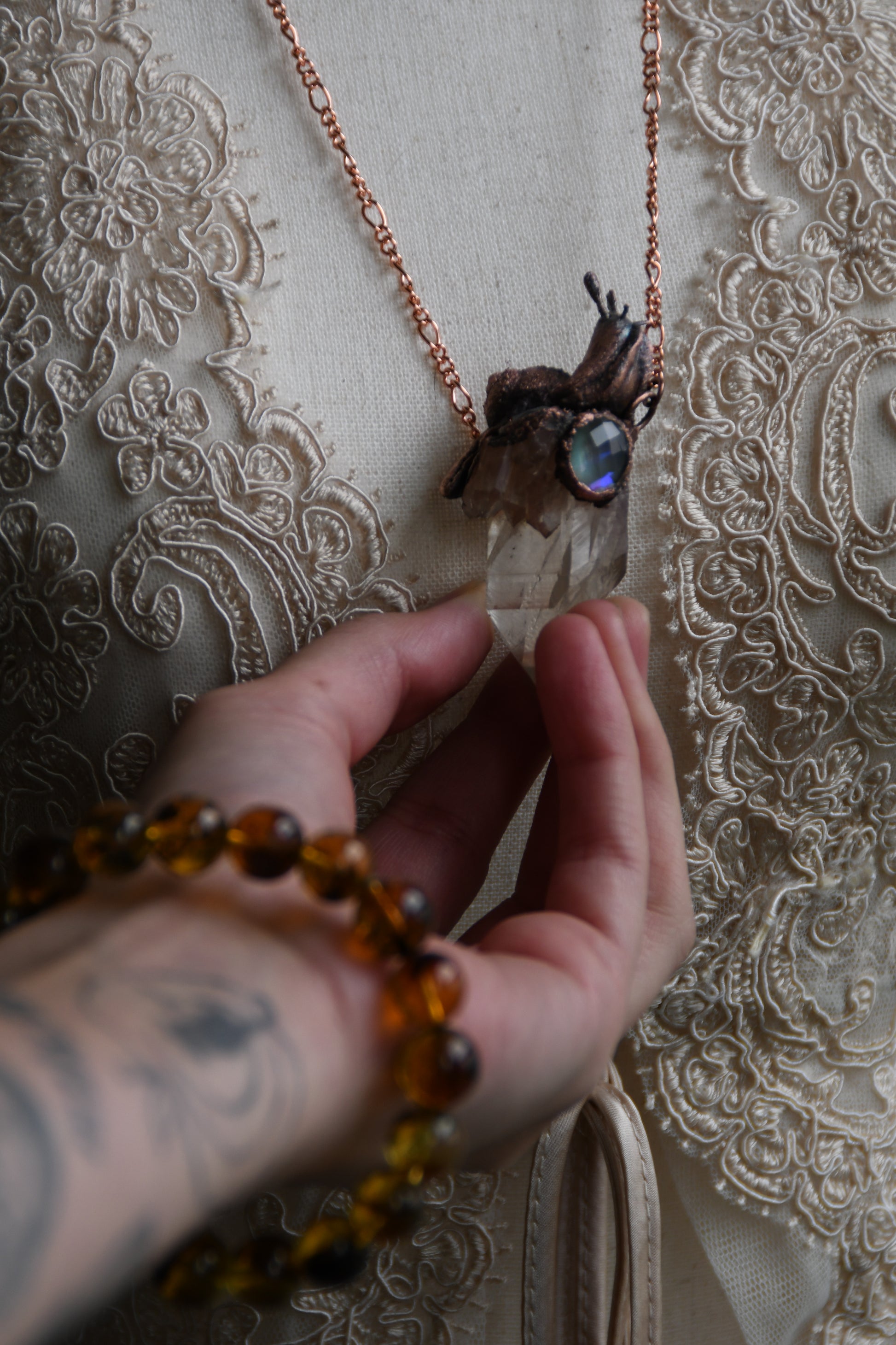 The Journey Story weaver is both an ode and a relic of the journey past and this far. When I first started making jewelry I used to sculpt things with clay which has been long gone in my jewelry making (well sort of). The snail shell is real, but the snail was hand sculpted by me which is a call back to the beginning. Sitting on top of a citrine cluster, the snail is symbolic and reminds us to take our time on our journey and not rush to the end but to enjoy. Paired with angel aura quartz for some whimsy and magic as the amplifier, and a dark green tourmaline for protection along the way. Also I will say, he is a little pointy so please wear him with care.