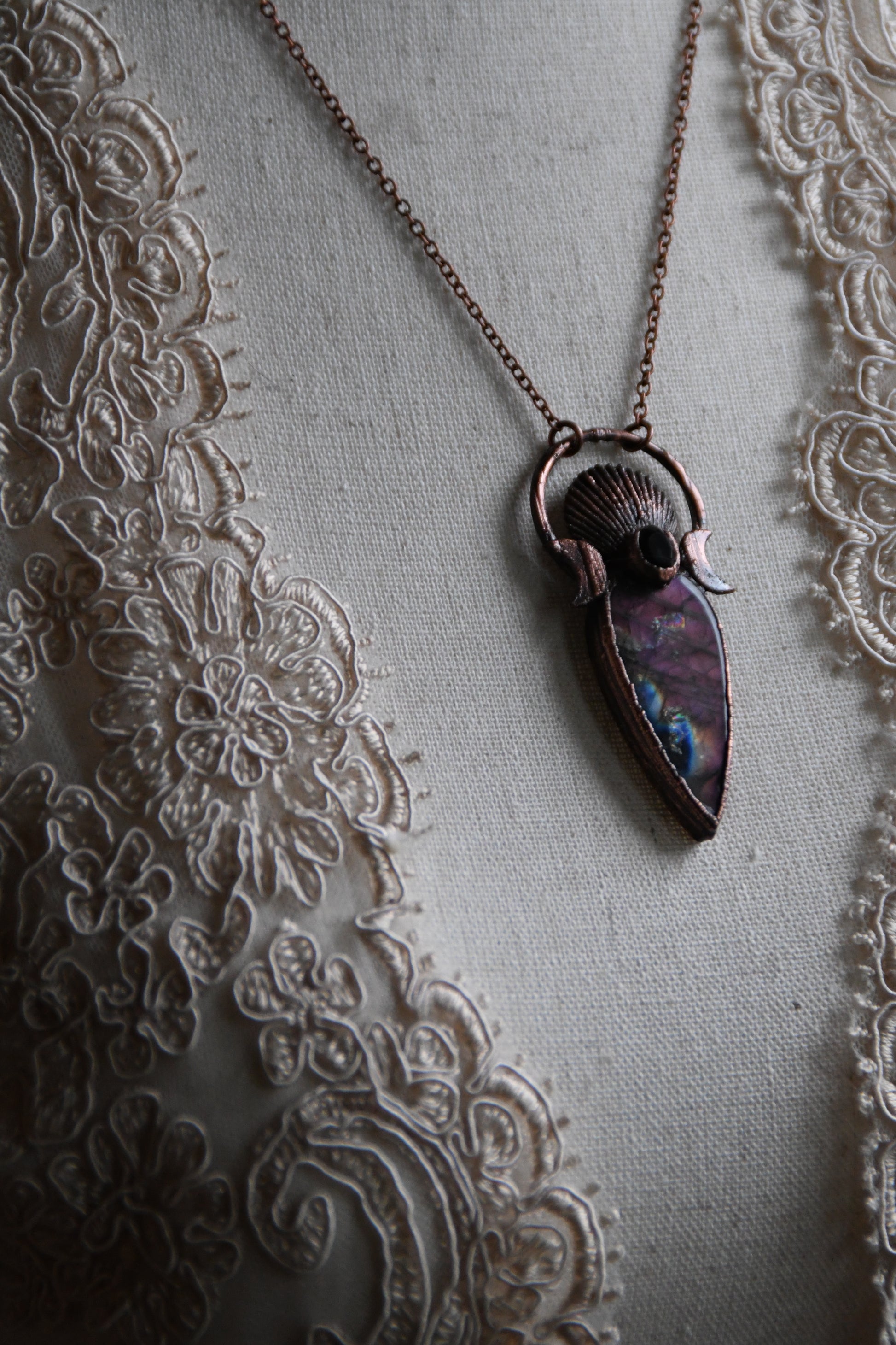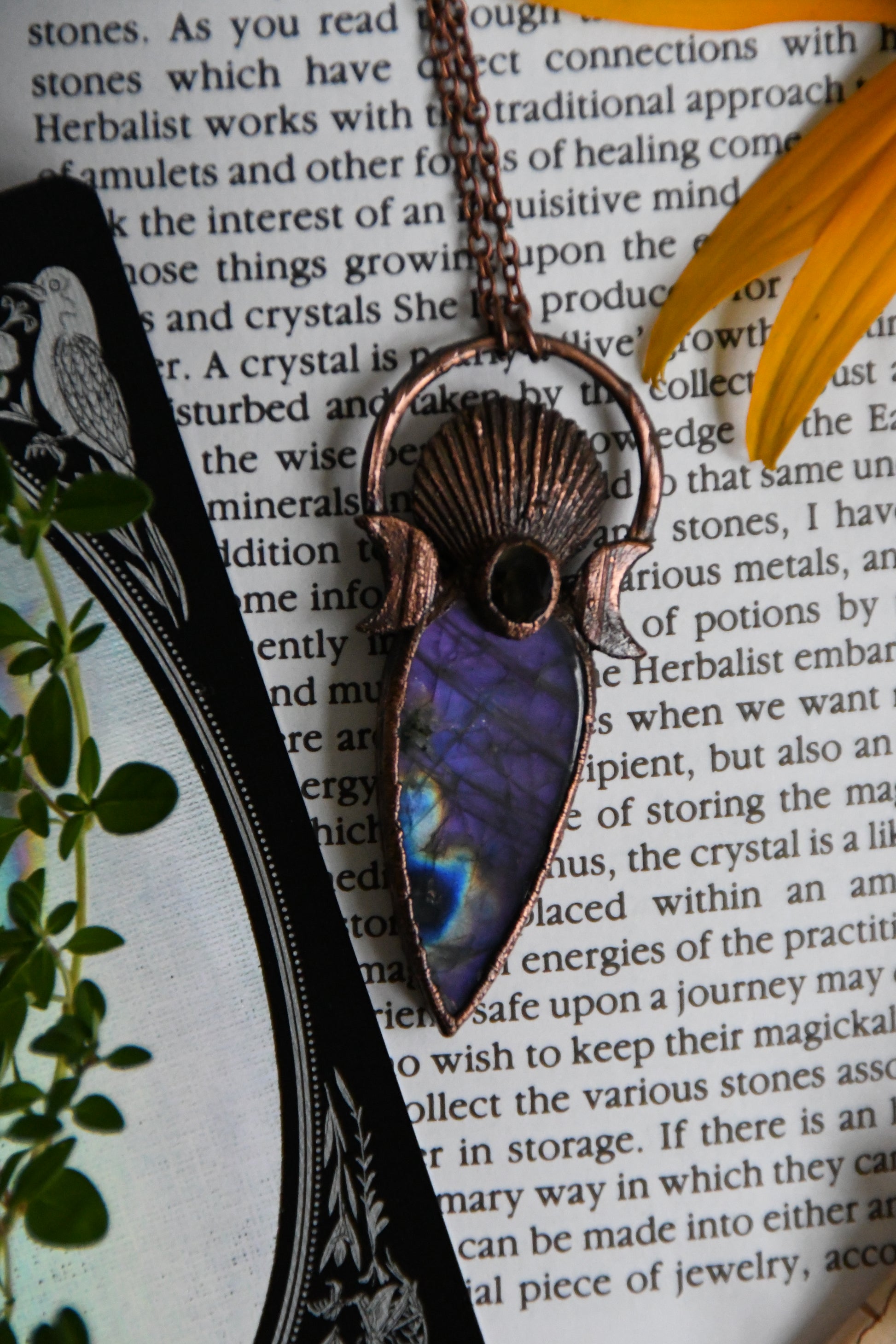 The Love of Magic piece features a vibrant purple labradorite cabochon, real scallop shell, and smokey quartz with moon accents. It is an ode to not only one of the first crystals I got a hold of to use (labradorite) but also remembering the love for the magic that brought all those pieces to life while also honoring Aphrodite as one of my patrons. Paired with smokey quartz to add a layer of protection to the stone of mystery and magic so that we may be protected in all we explore.