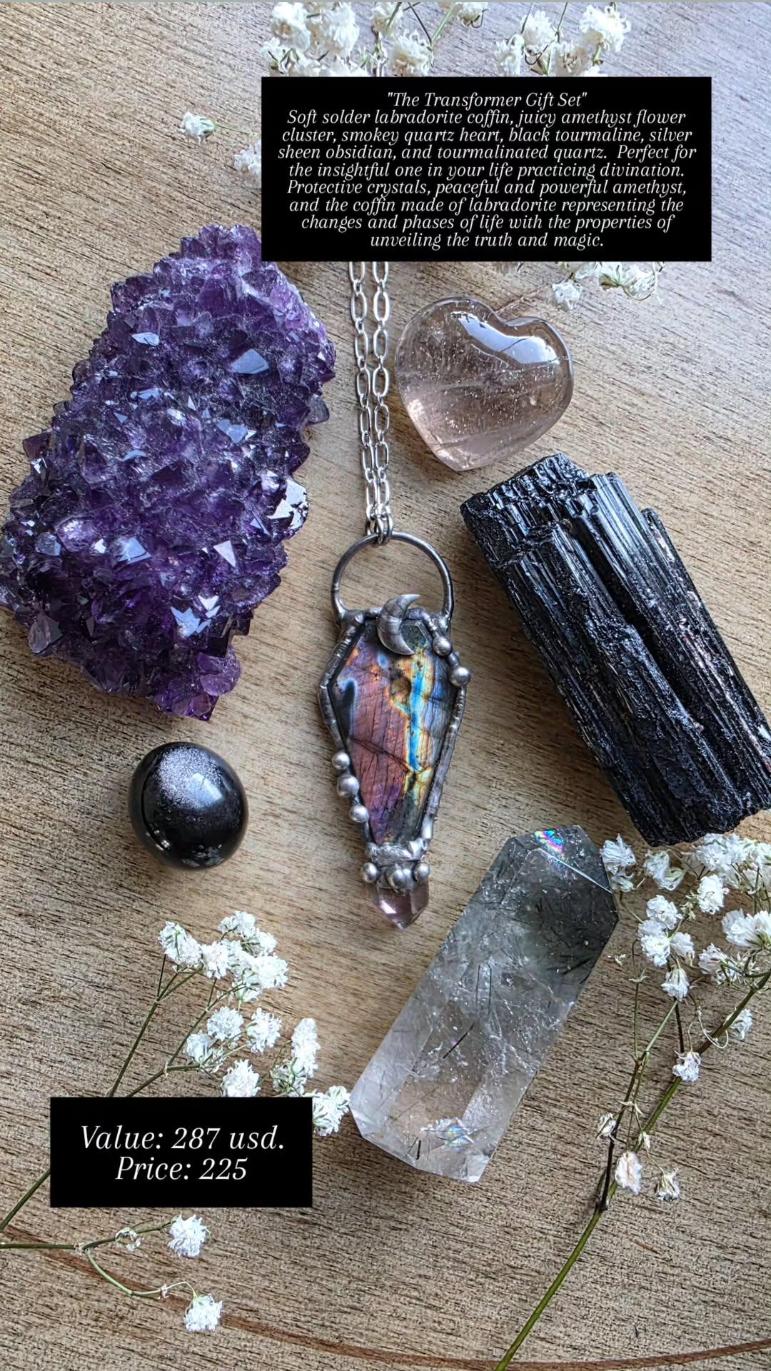 Listing is for "The Transformer" set. Includes soft solder lead free labradorite coffin necklace, obsidian tumble, smokey quartz heart,juicy amethyst cluster, black tourmaline, and a tourmalinated quartz tower