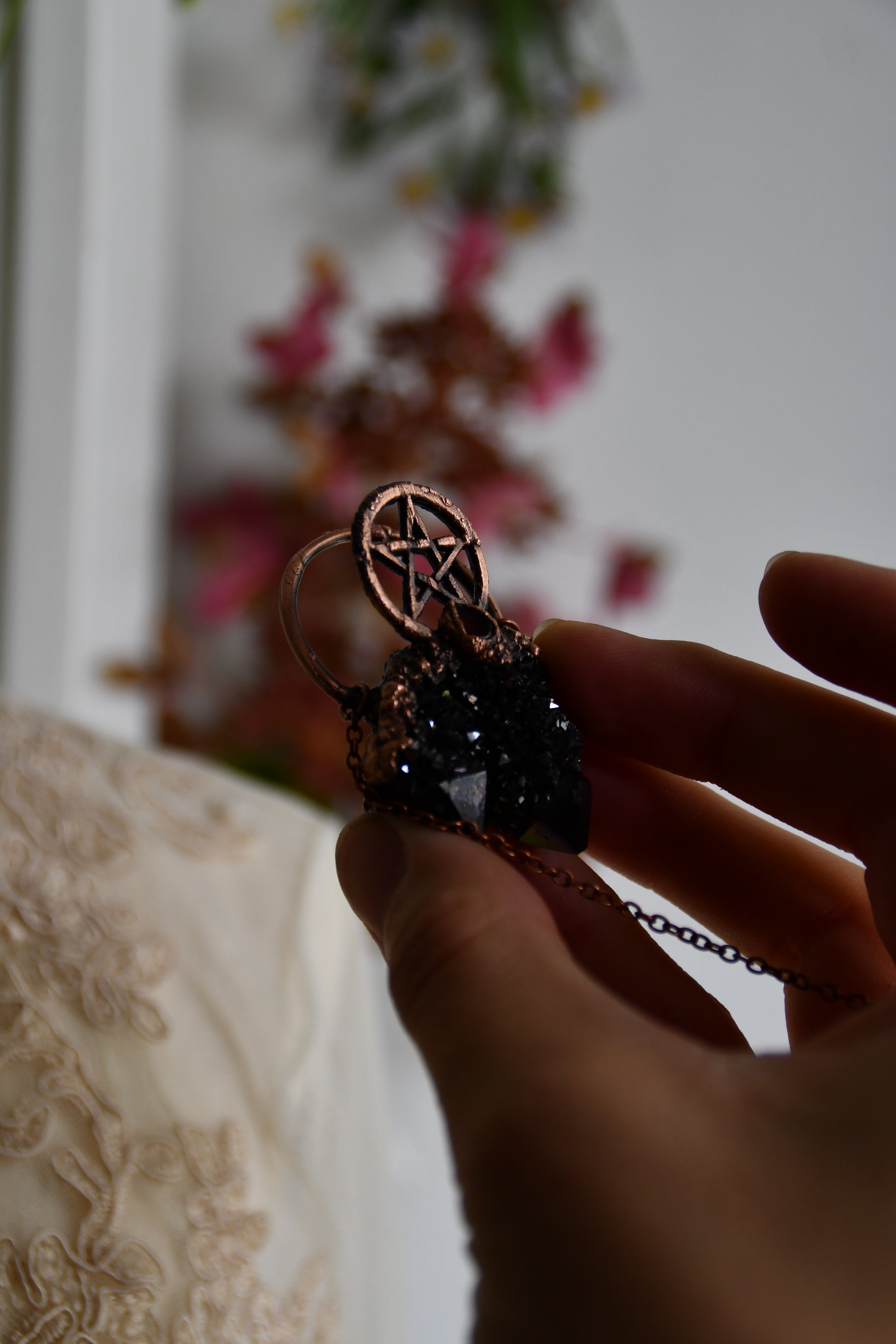 A symbolic piece made with the pentacle, a symbol of magic and of the elements water, fire, earth, air and spirit. Placed on top of a black knight aura spirit quartz which offers outward projection of energy, and tied together with grounding garnet. This piece is coated in copper using a technique known as electroforming and the copper on this piece has been darkened with a patina. This comes on 18" of antiqued copper chain with a simple clasp. If you have any questions or concerns about this piece please contact me before purchasing thank you.