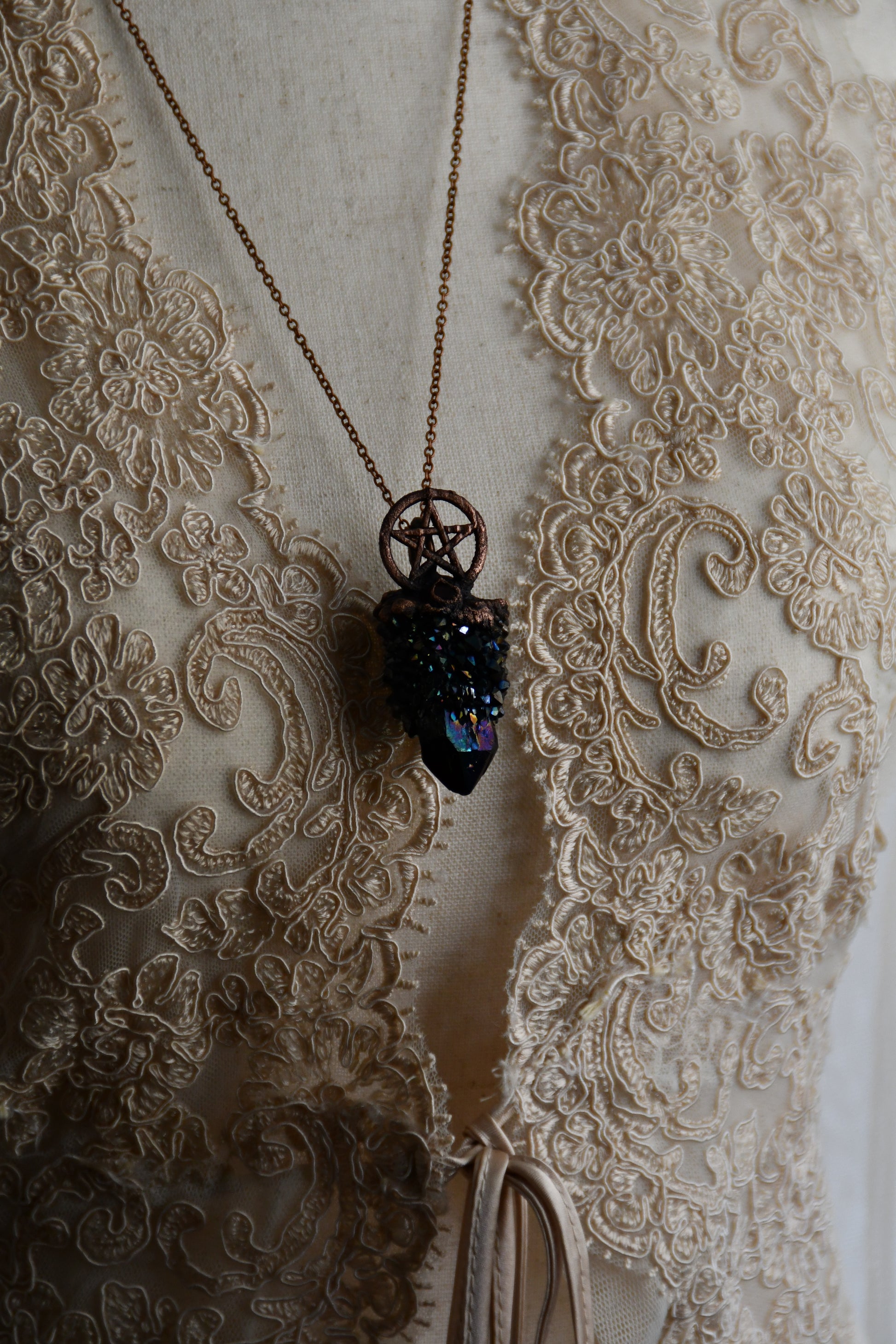 A symbolic piece made with the pentacle, a symbol of magic and of the elements water, fire, earth, air and spirit. Placed on top of a black knight aura spirit quartz which offers outward projection of energy, and tied together with grounding garnet. This piece is coated in copper using a technique known as electroforming and the copper on this piece has been darkened with a patina. This comes on 24" of antiqued copper chain with a simple clasp. If you have any questions or concerns about this piece please contact me before purchasing thank you.