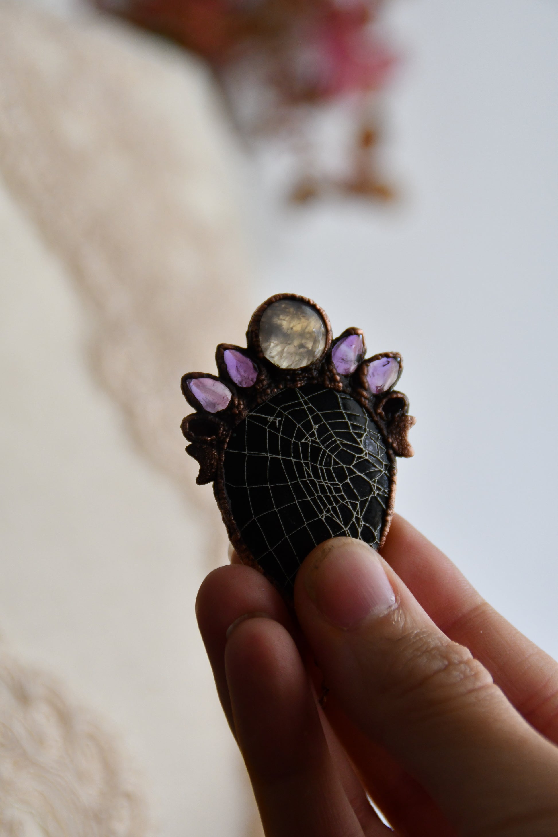 A story weaver of its own, this piece features an upcycled billiard ball that has a real spider web encased on it done by a beloved artist. This has been paired with moonstone, amethyst and garnet and is coated in copper that has been darkened with a patina to give it an antiqued look. Spiders are the weavers, the magic, the lore. Often seen as pests or evil, spiders are teachers that offer deep lessons that bring us back to ourselves. A web made of something almost weightless that can carry the weight of a spider and then some....they are resilient. This piece comes on 18" of antiqued copper chain with a simple clasp. If you have any questions or concerns about this piece please contact me before purchasing thank you!