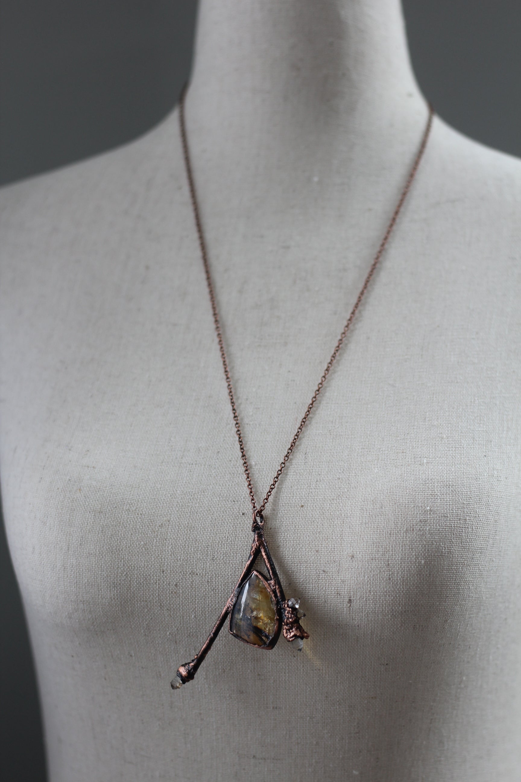 A beautiful dendritic golden healer quartz set in a real twig and paired with pakimer quartz, set in copper using a technique known as electroforming. The copper on this piece has been darkened with a patina to give it an antiqued look and this comes on 24" of antiqued copper chain with a simple clasp. If you have any questions or concerns about this piece please contact me before purchasing thank you!