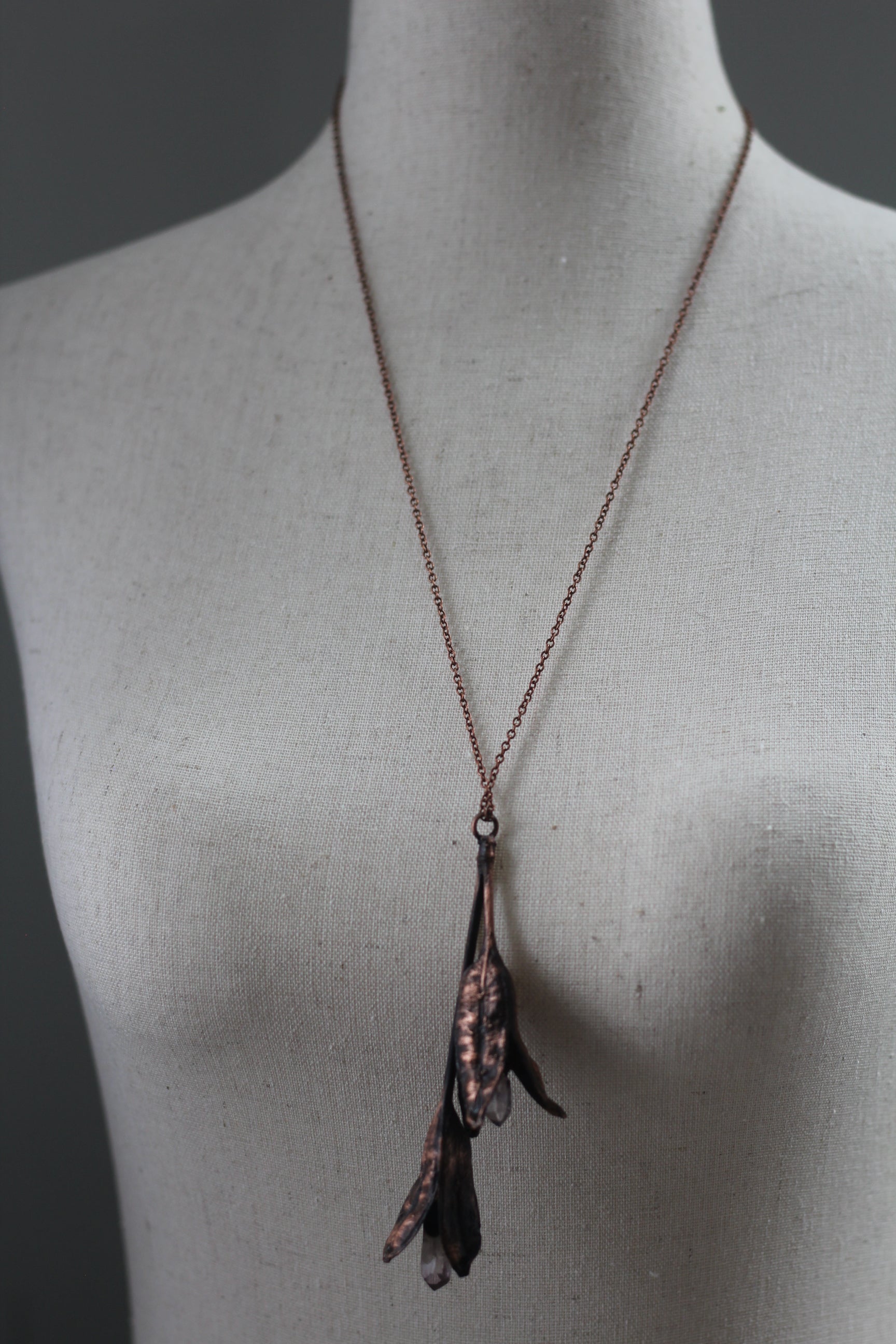A real dried Iris pod paired with polished citrine points (one with phantom) coated in copper using a technique known as electroforming. The copper on this piece has been darkened with a patina to give it an antiqued look and this comes on 24" of antiqued copper chain with a simple clasp. If you have any questions or concerns about this piece please contact me before purchasing thank you!