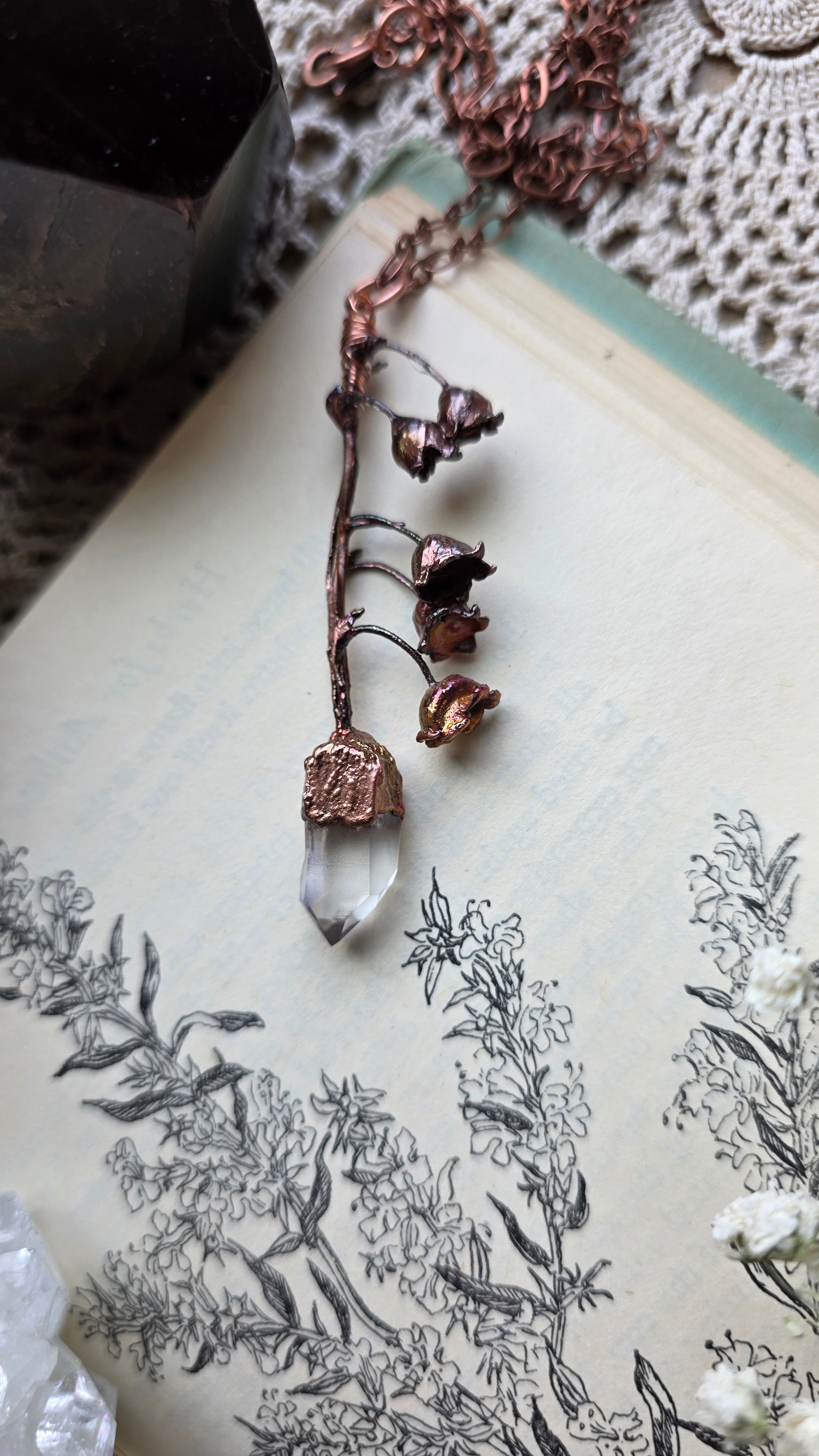 A real lily of the valley stem on top of a quartz point, coated in copper using a technique known as electroforming. The copper on this piece has been darkened with a patina to give it an antiqued look and this comes on 20" of antiqued copper chain with a simple clasp. If you have any questions or concerns about this piece please contact me before purchasing thank you!