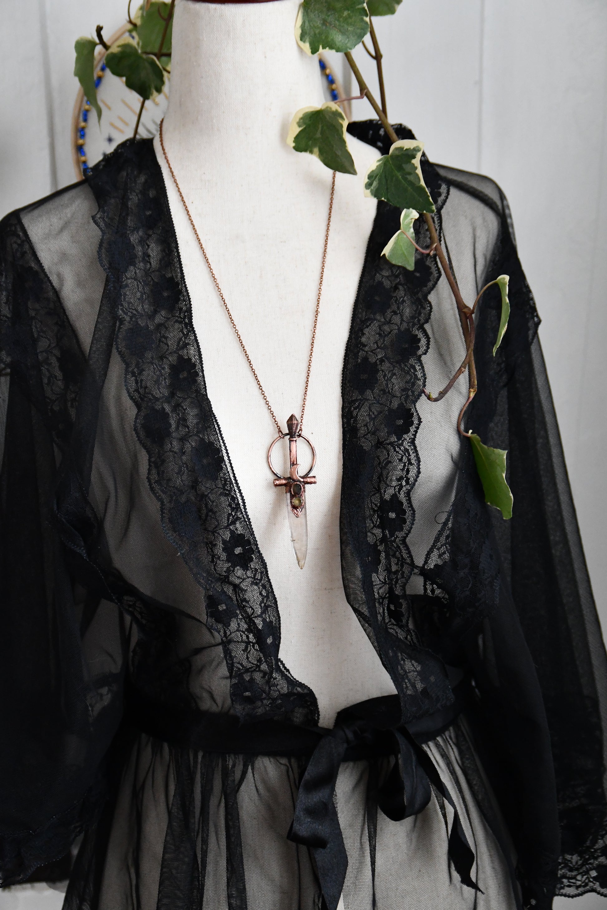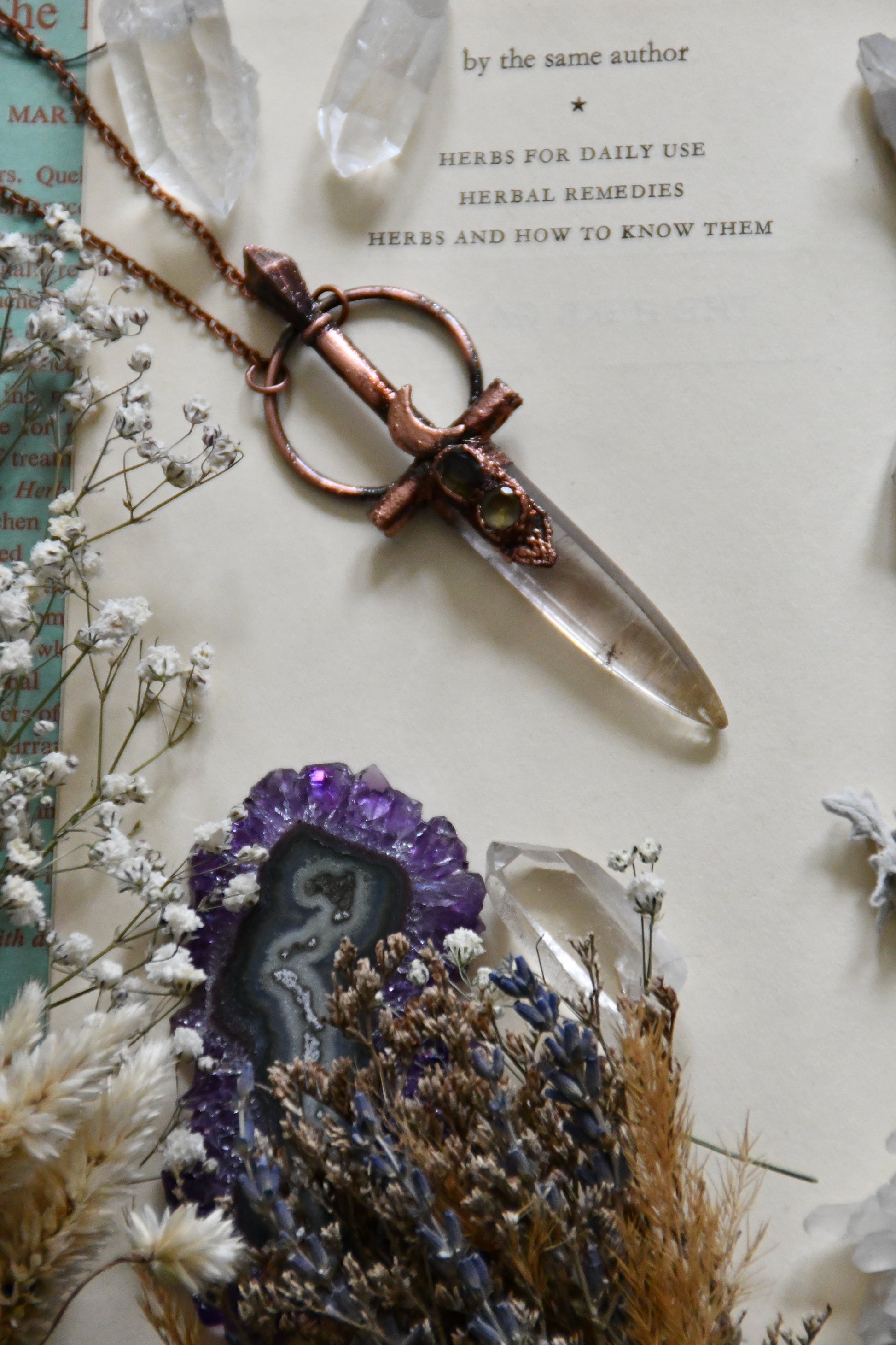 A beautiful rutilated quartz blade with a 3d printed sheath to make it a sword, adorned with smokey quartz and citrine and coated in copper using a technique known as electroforming. The copper on this piece has been darkened with a patina to give it an antiqued look and this comes on 24" of antiqued copper chain with a simple clasp. If you have any questions or concerns about this piece please contact me before purchasing thank you!