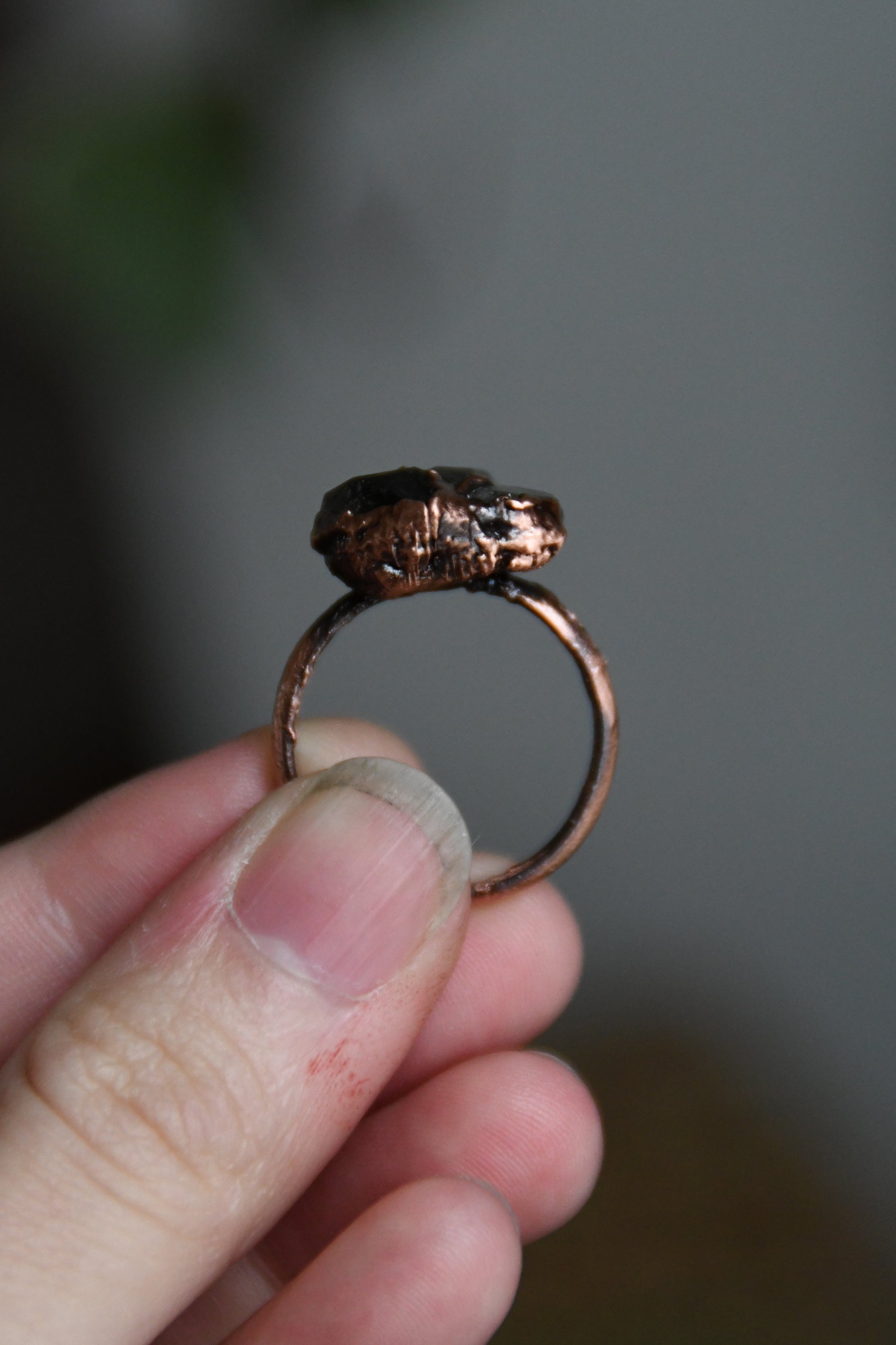 Three beautiful Pakimer quartz (basically herkimers but they come from Pakistan) set in copper using a technique known as electroforming. The copper on this piece has been darkened with a patina to give it a antiqued look. This is a single shank ring, and like all of my copper jewelry, the texture can be more bumpy and organic than smooth but has been filed to be comfortable for wear. If you have any questions or concerns about this piece please contact me before purchasing thank you!