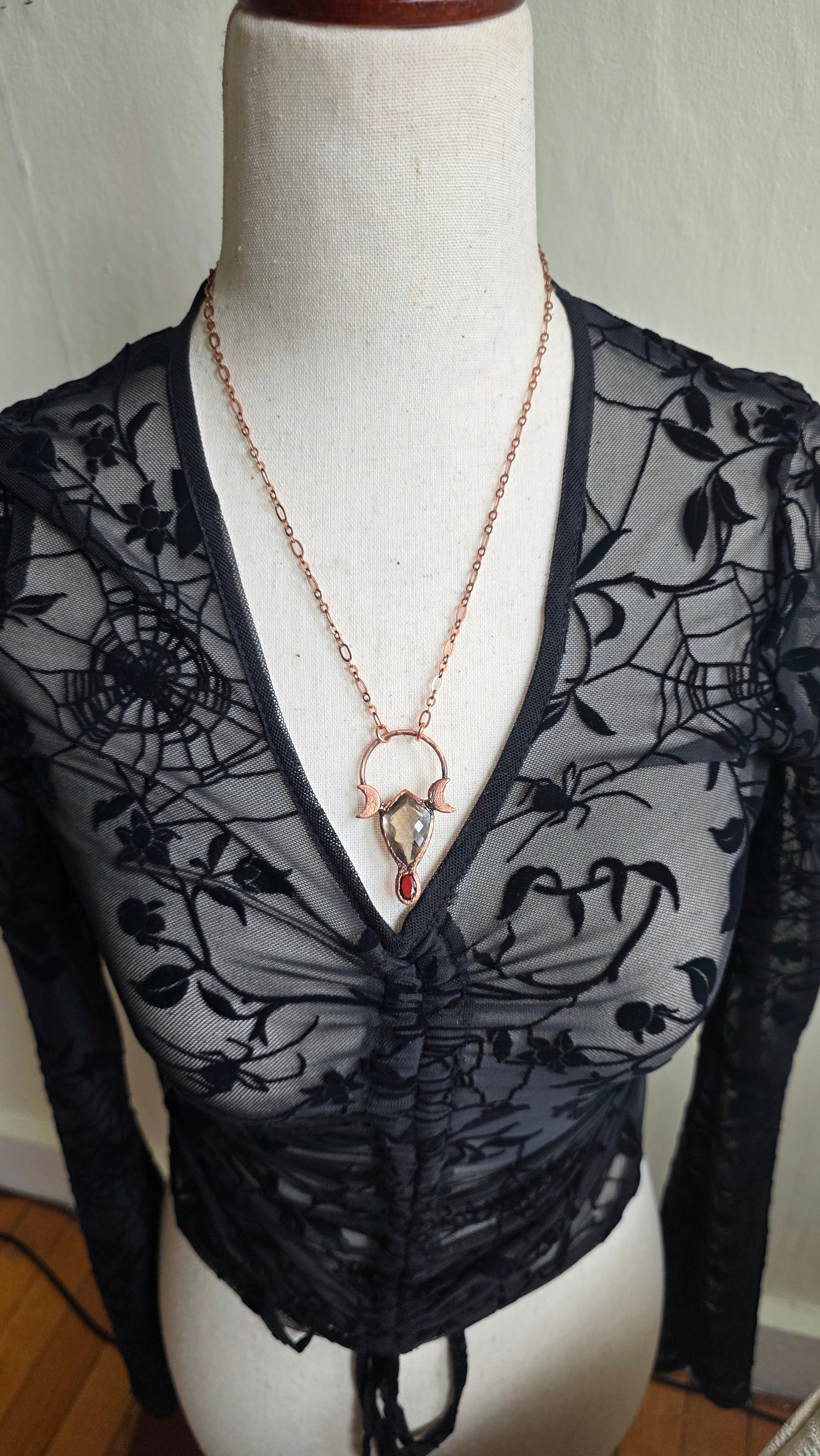 A beautiful faceted smokey quartz cabochon paired with a juicy garnet and crescent moons, set in copper using a technique known as electroforming. The copper on this piece has been darkened with a patina to give it an antiqued look and this comes on 18" of antiqued copper chain with a simple clasp. If you have any question or concerns about this piece please contact me before purchasing thank you!