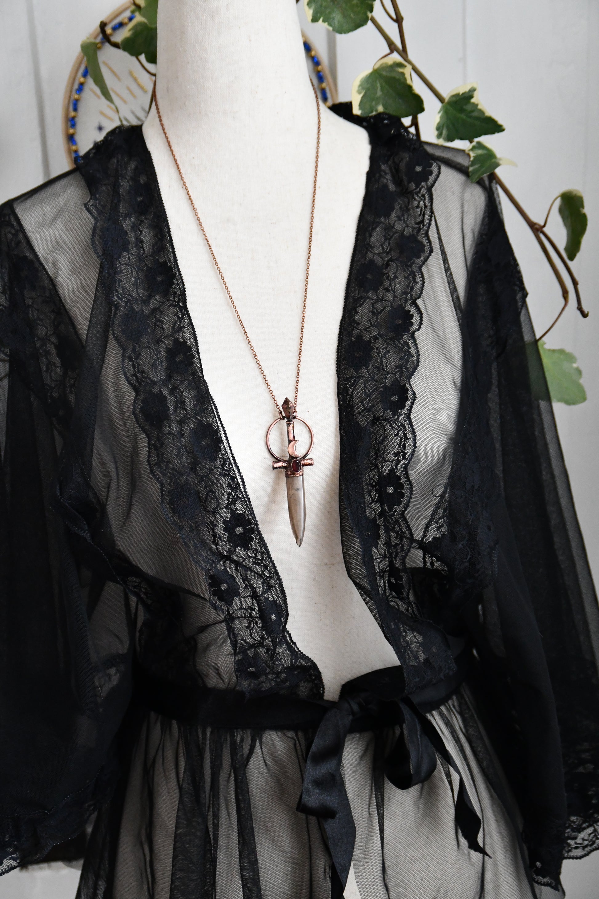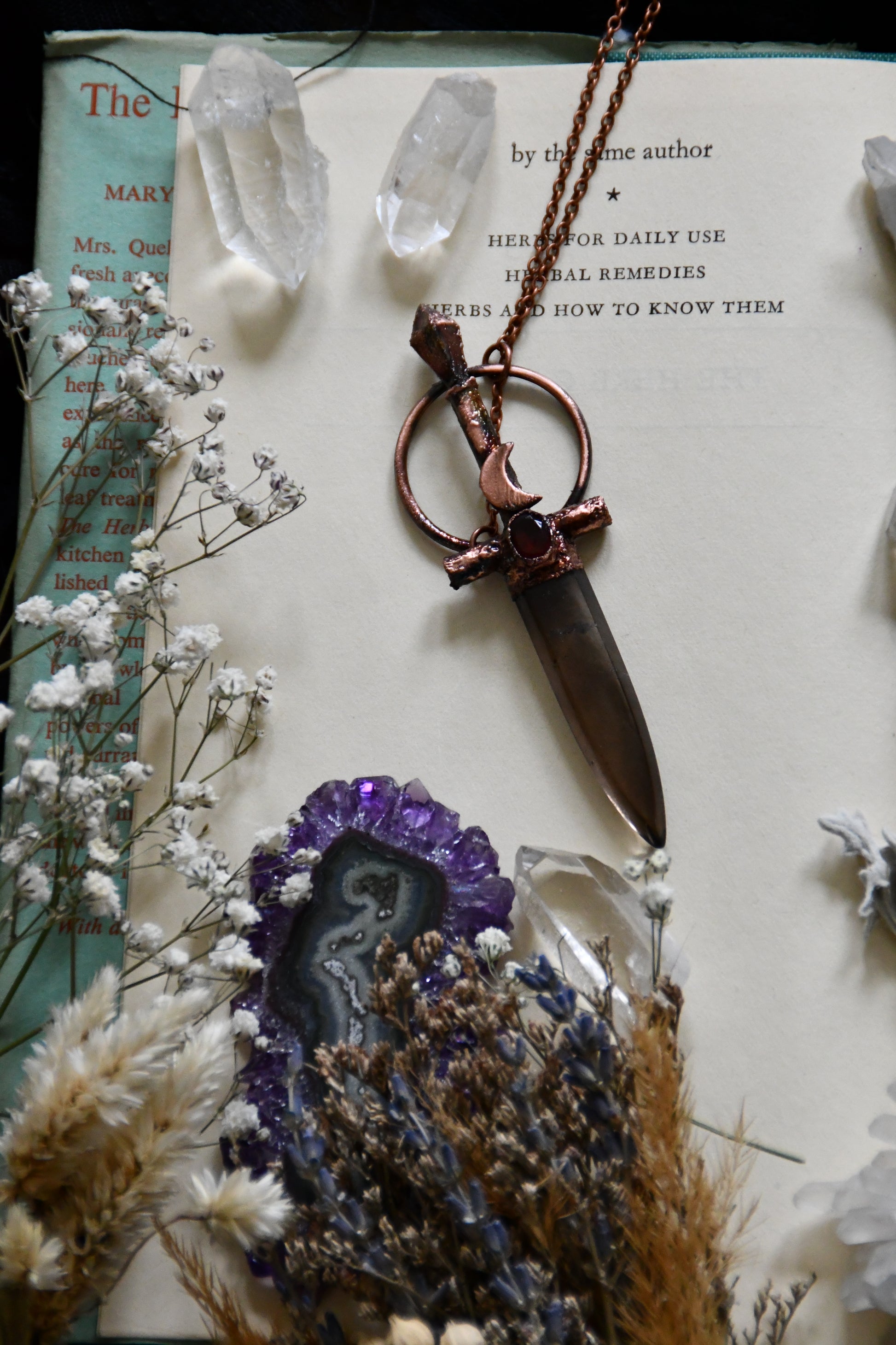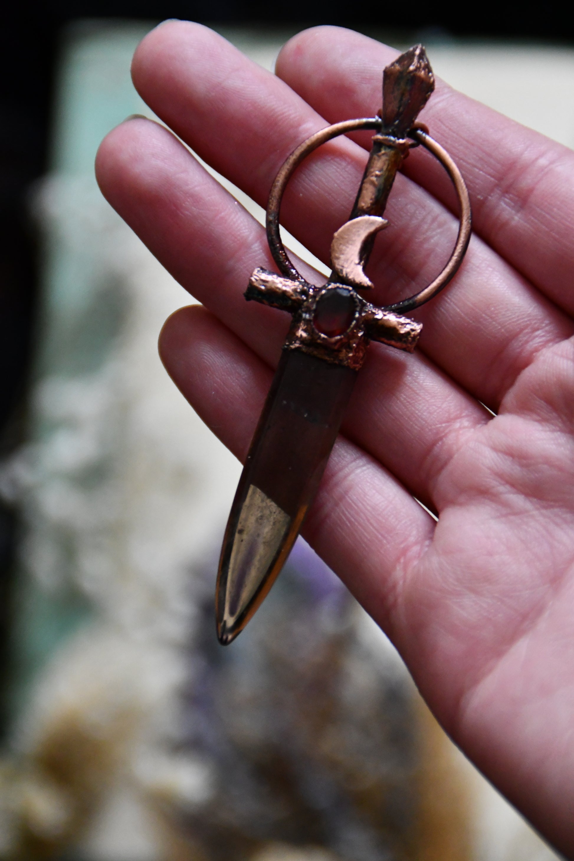 A beautiful smokey quartz blade with a 3d printed sheath to make it a sword, adorned with garnet and coated in copper using a technique known as electroforming. The copper on this piece has been darkened with a patina to give it an antiqued look and this comes on 24" of antiqued copper chain with a simple clasp. If you have any questions or concerns about this piece please contact me before purchasing thank you!