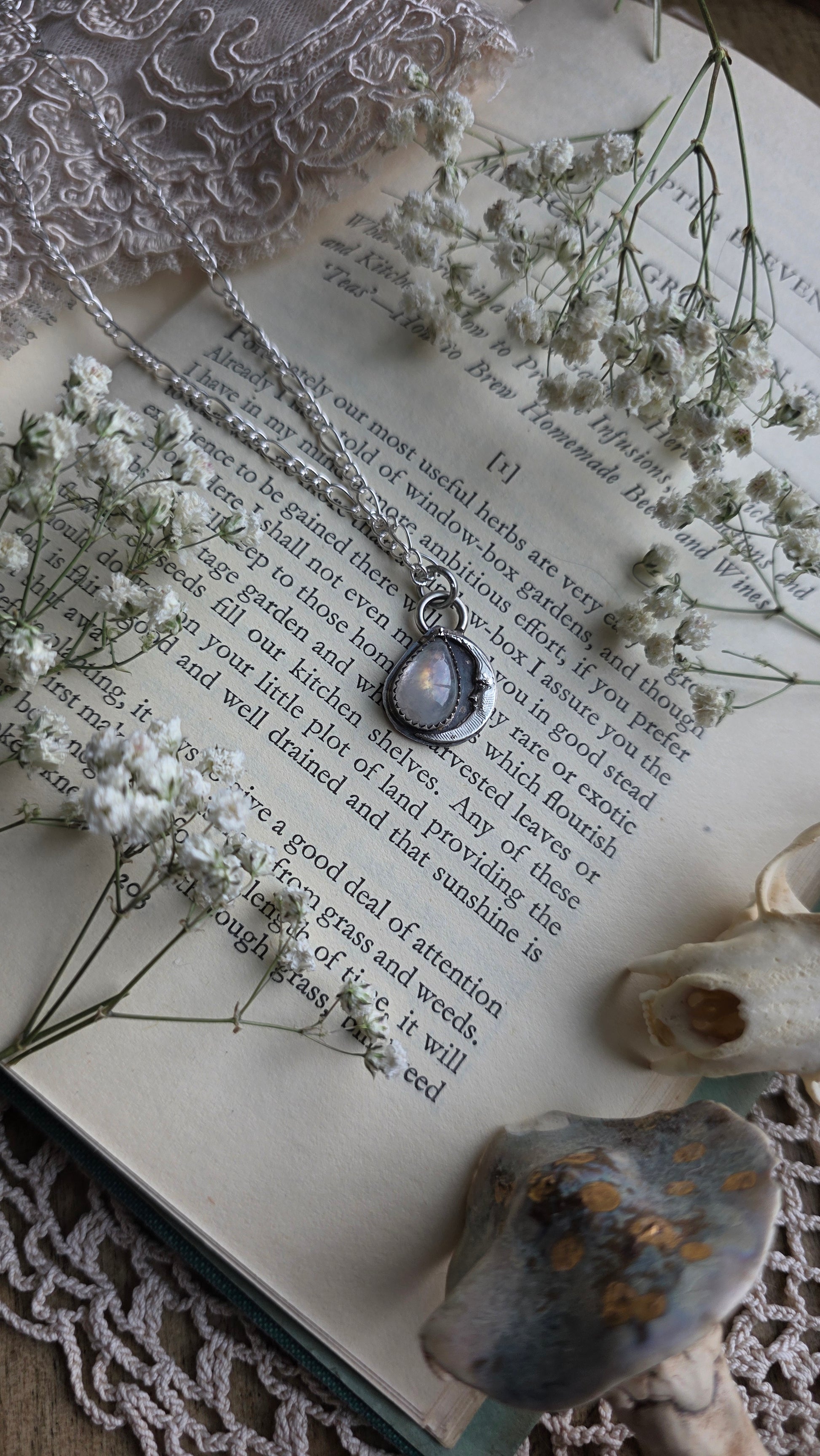 A gorgeous multicolored rainbow moonstone tear drop set in sterling silver with a crescent moon faced casting. To keep costs down, this comes on 16" of silver plated chain (copper core) but if you'd like a sterling silver chain for an additional cost please reach out to me!