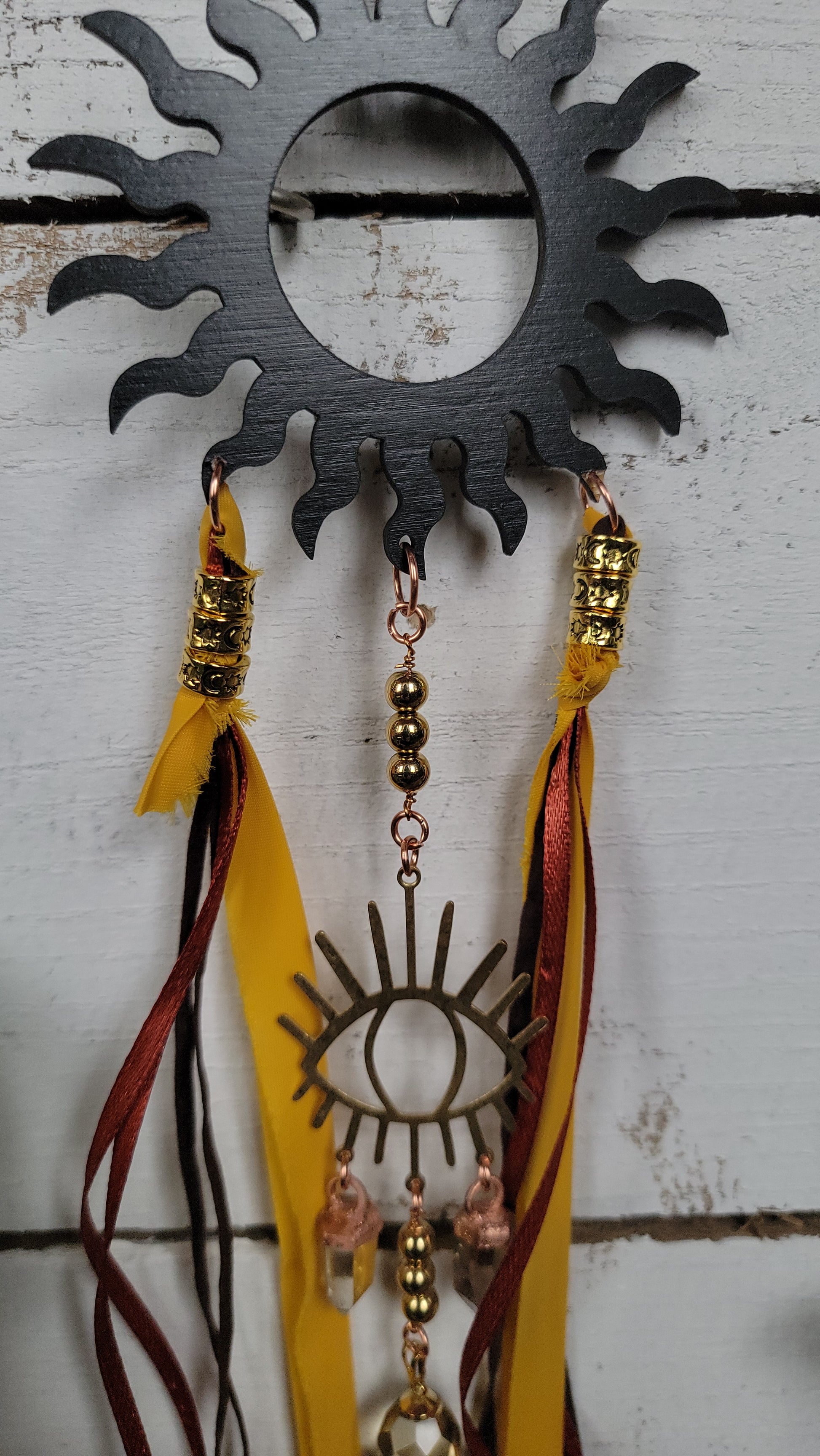 A gorgeous dark stained sun wood cut out adorned with an electroformed citrine points, faceted citrine pendant, brass eye charm and ribbons. This piece is meant to be a wall hanging to adorn your space with coming on copper chain with a simple bail to hang easily. It measures approximately 16" in length from the bail to the ends of th3 ribbons. If you have any questions or concerns please contact me before purchasing thank you!