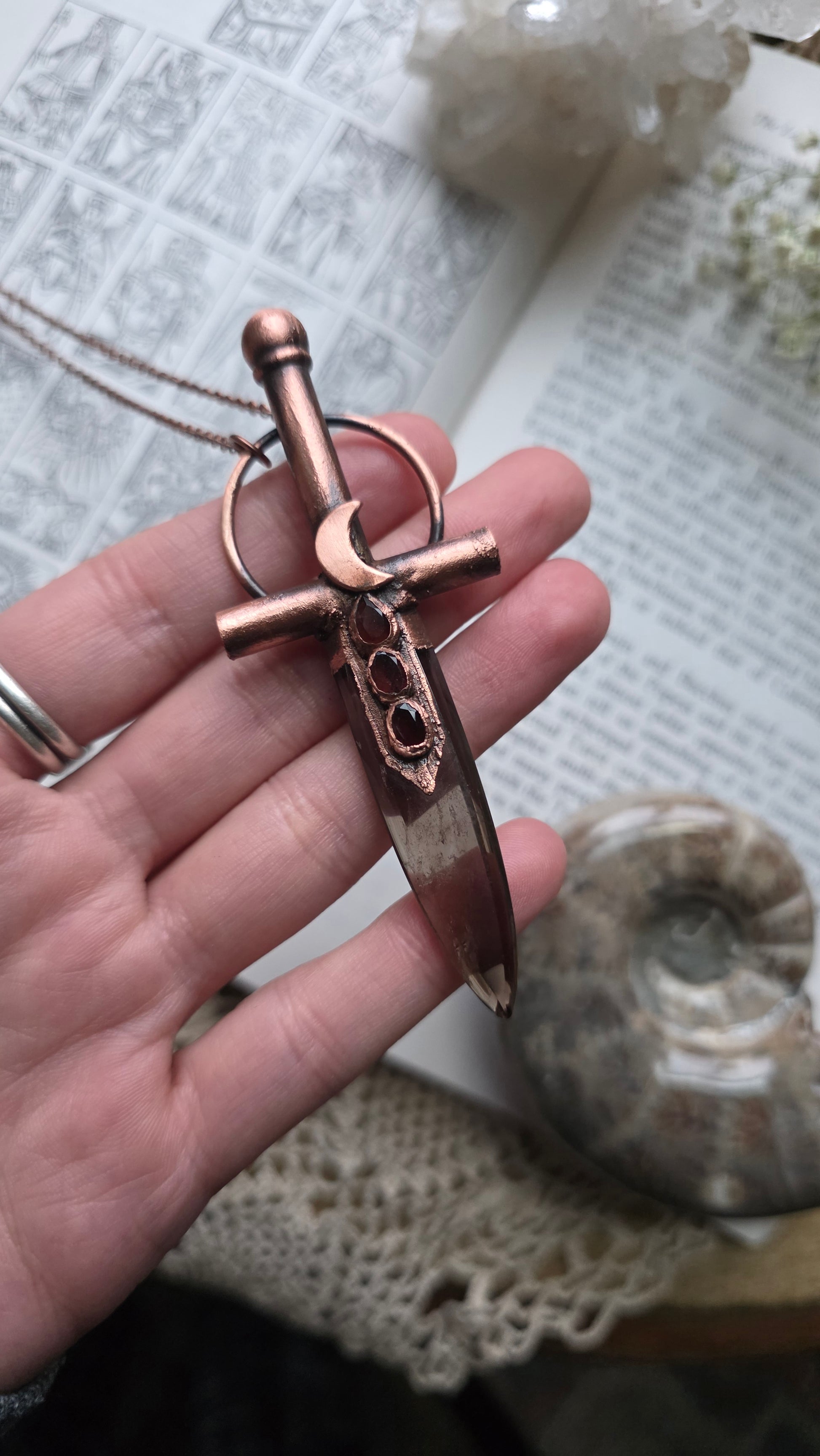 Made with a smokey quartz blade, and three garnet cabochons, coated in copper using a technique known as electroforming and the copper has been patinad to give it an antiqued look. This pendant comes on 20" of antiqued copper chain with a simple clasp. If you have any questions or concerns please contact me before purchasing thank you!