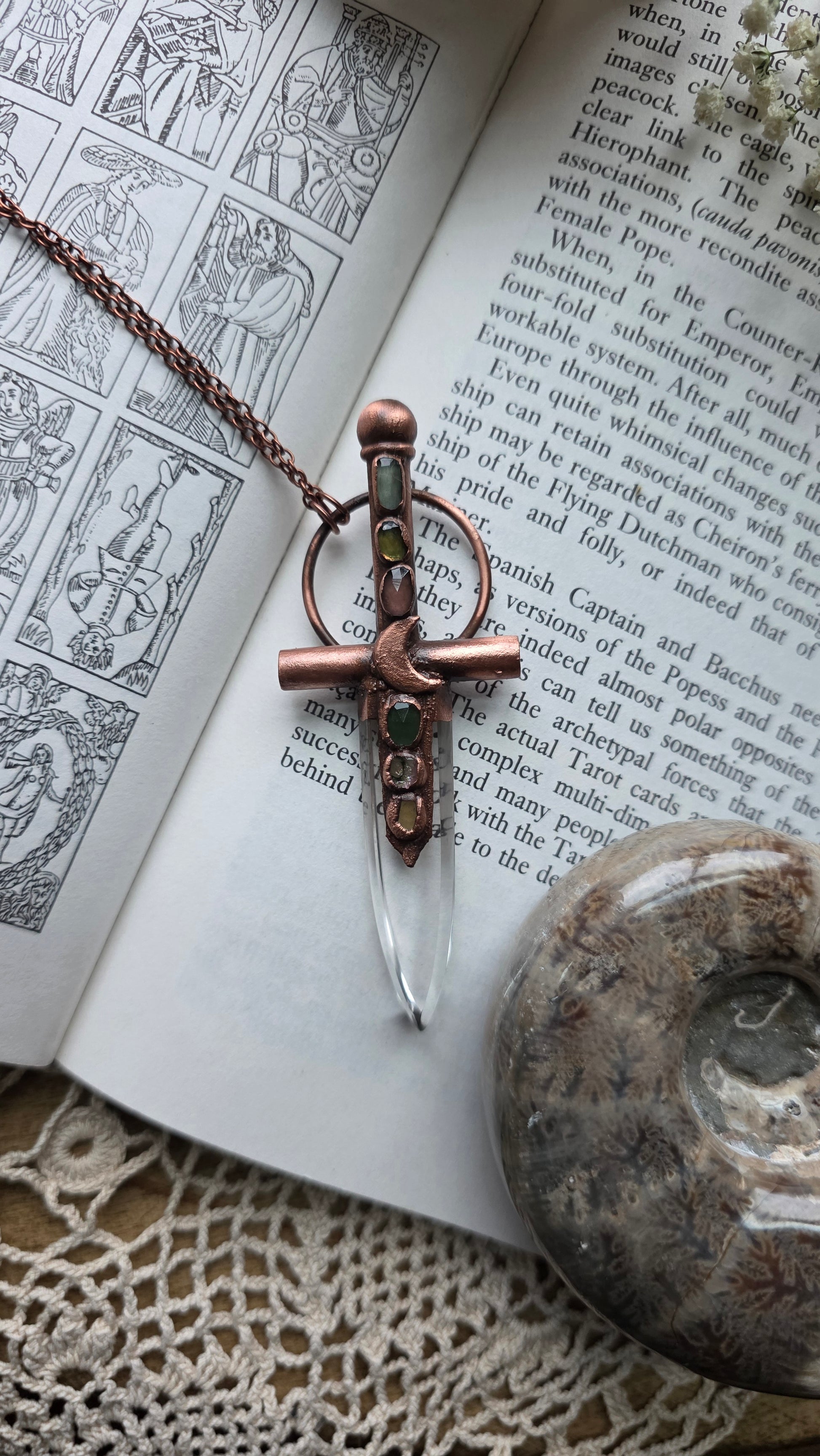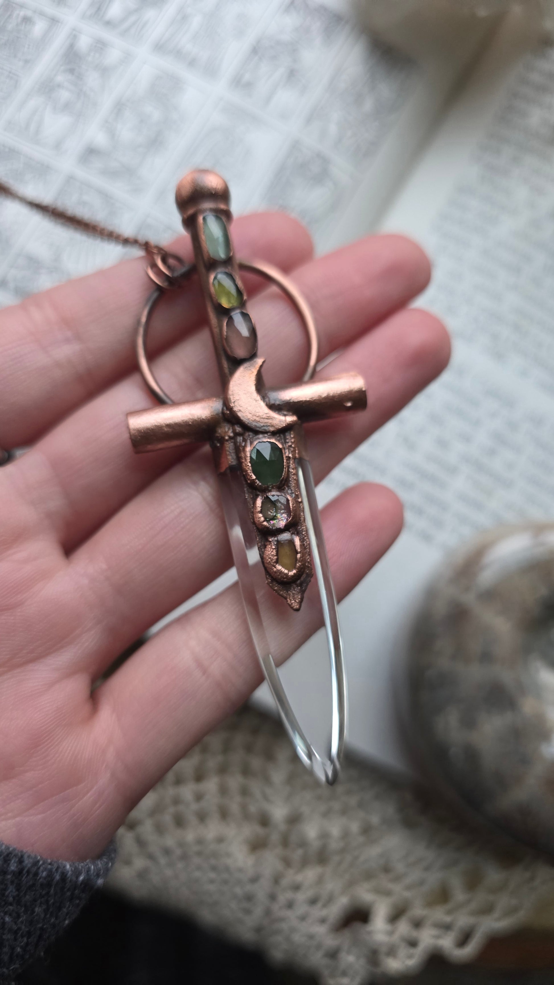 Made with a clear quartz blade, and several colored faceted tourmaline cabochons, coated in copper using a technique known as electroforming and the copper has been patinad to give it an antiqued look. This pendant comes on 20" of antiqued copper chain with a simple clasp. If you have any questions or concerns please contact me before purchasing thank you!