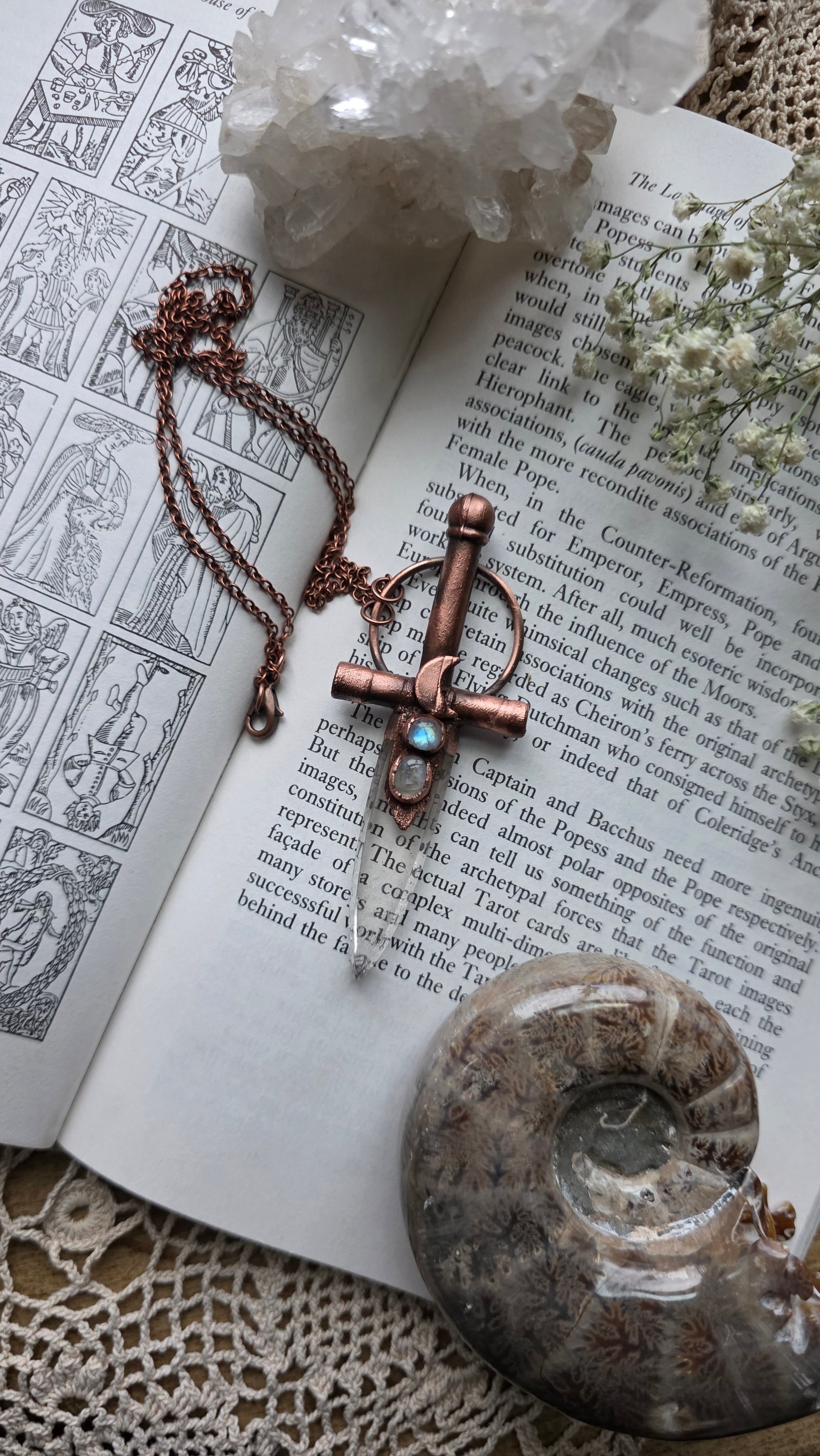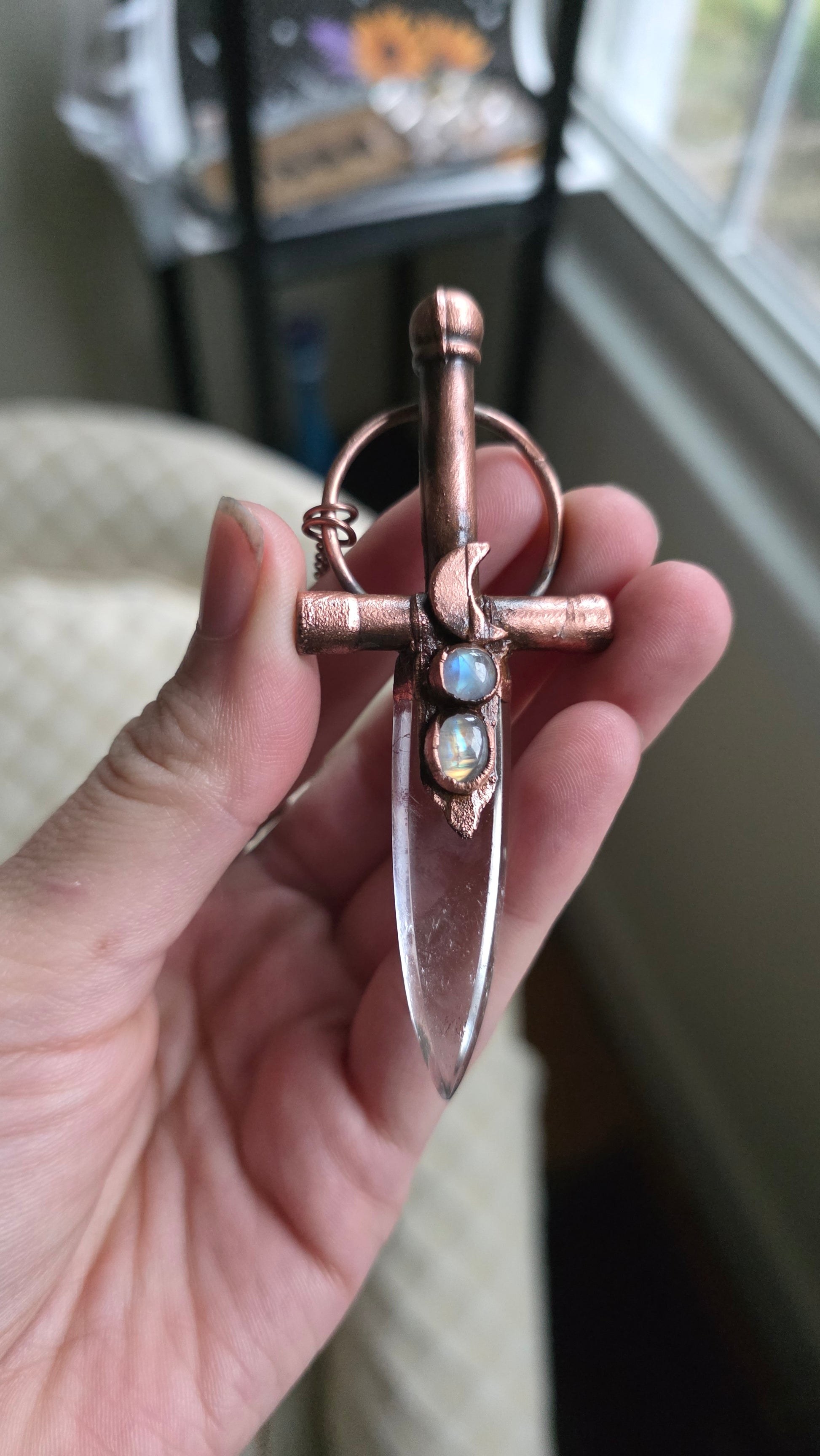 He is made with a clear quartz blade, and three phantom amethyst cabochons, coated in copper using a technique known as electroforming and the copper has been patinad to give it an antiqued look. This pendant comes on 20" of antiqued copper chain with a simple clasp. If you have any questions or concerns please contact me before purchasing thank you!