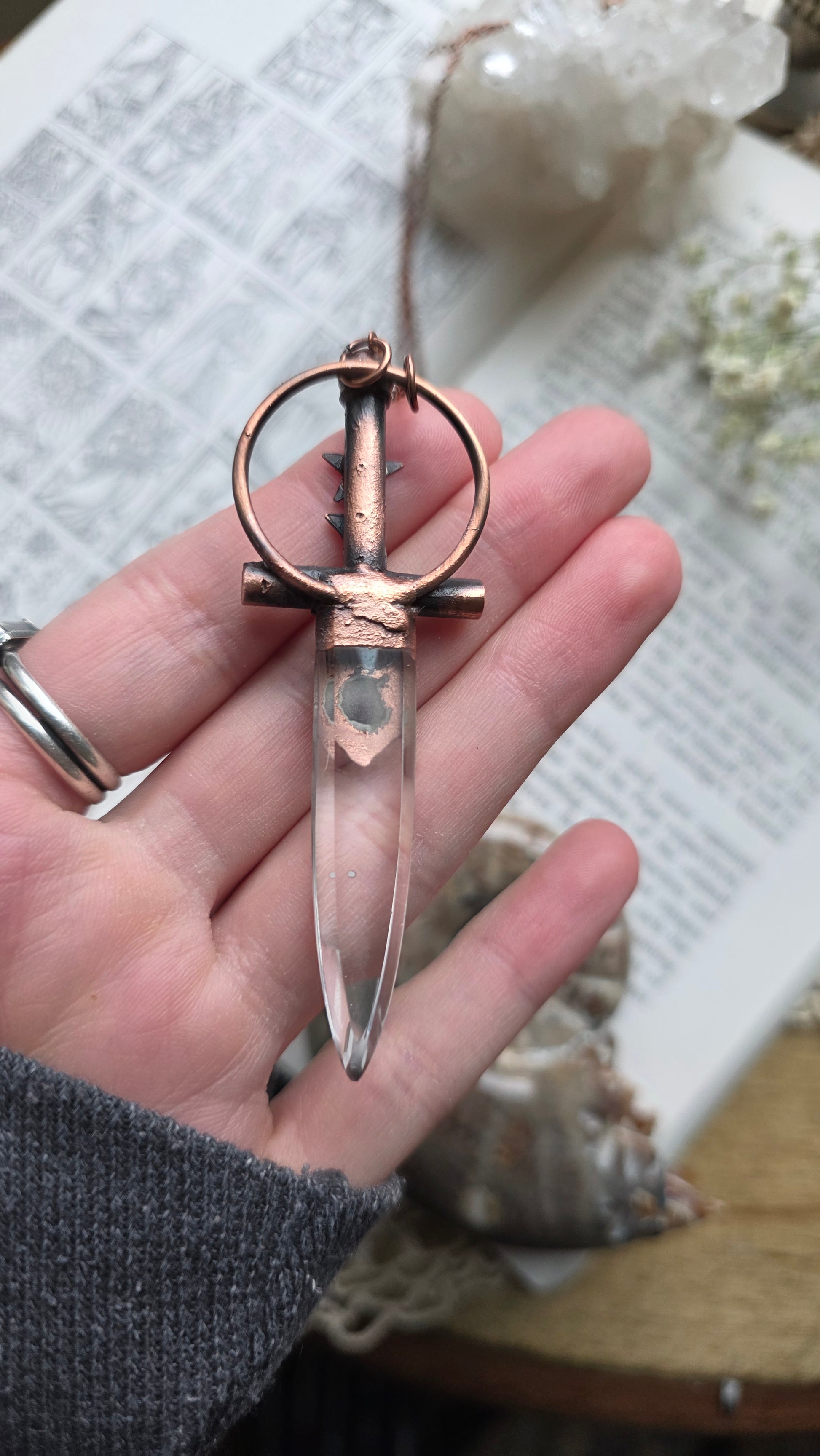 She is made with a clear quartz blade, moonstone star, and garnet cabochon coated in copper using a technique known as electroforming and the copper has been patinad to give it an antiqued look. This pendant comes on 20" of antiqued copper chain with a simple clasp. If you have any questions or concerns please contact me before purchasing thank you!